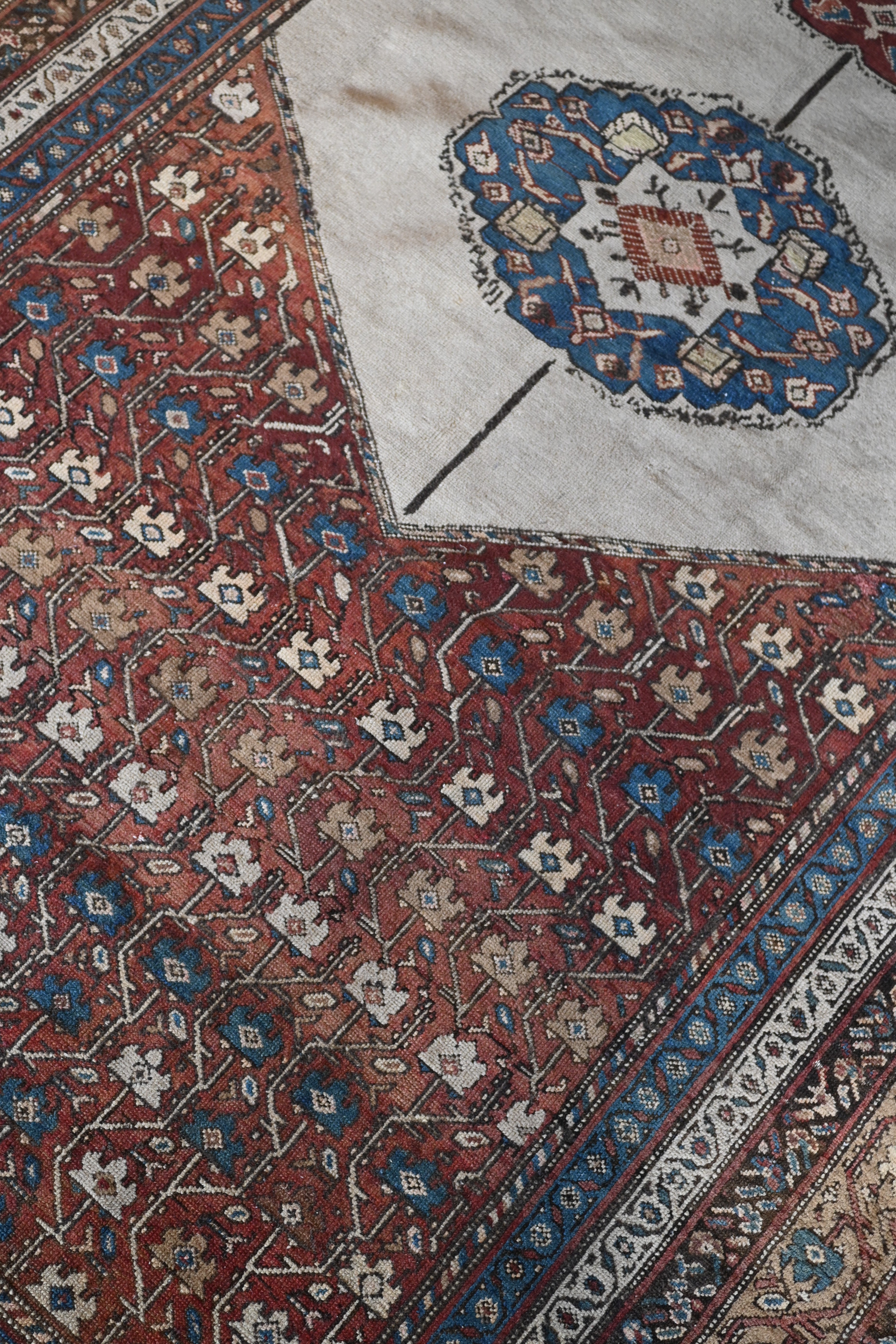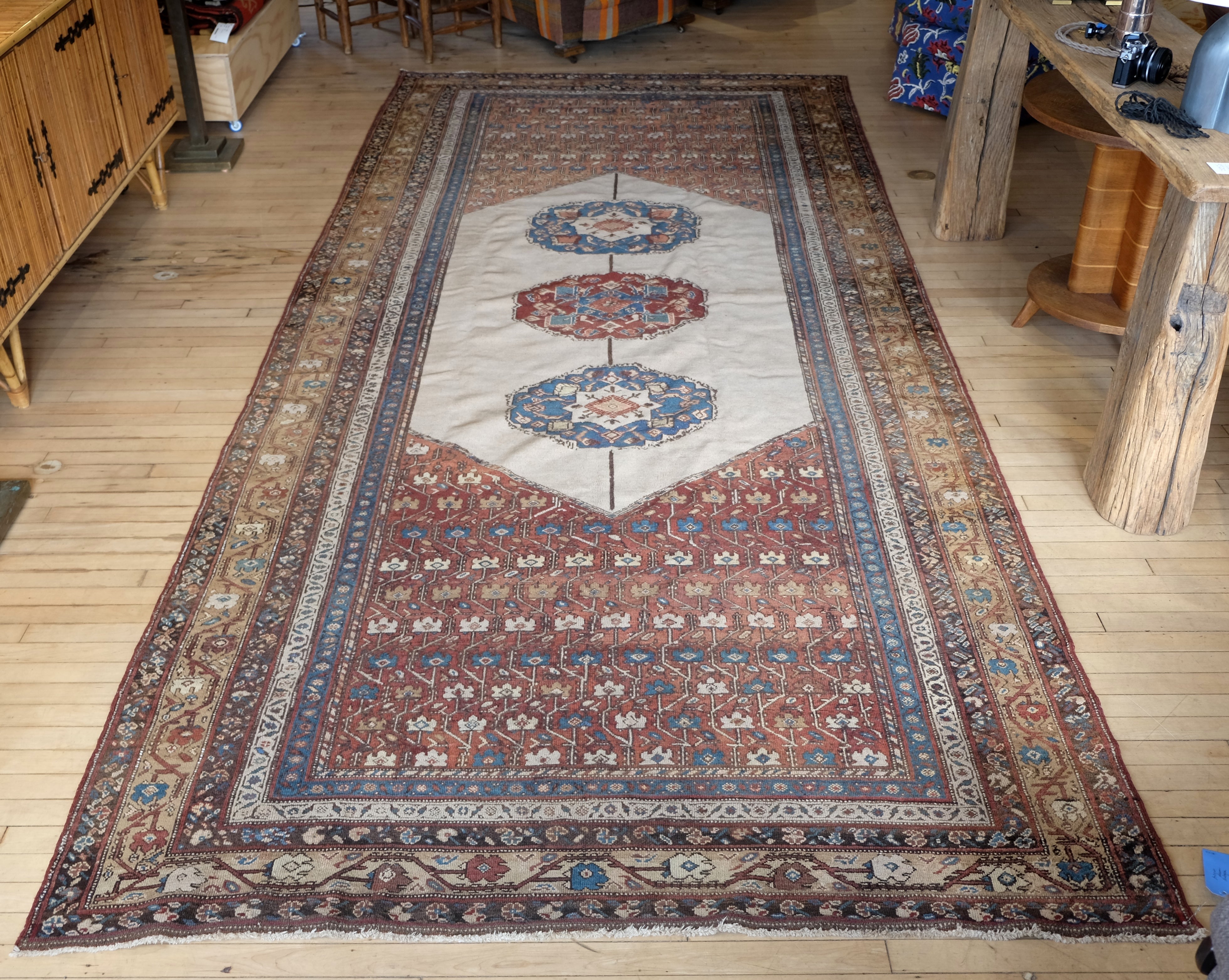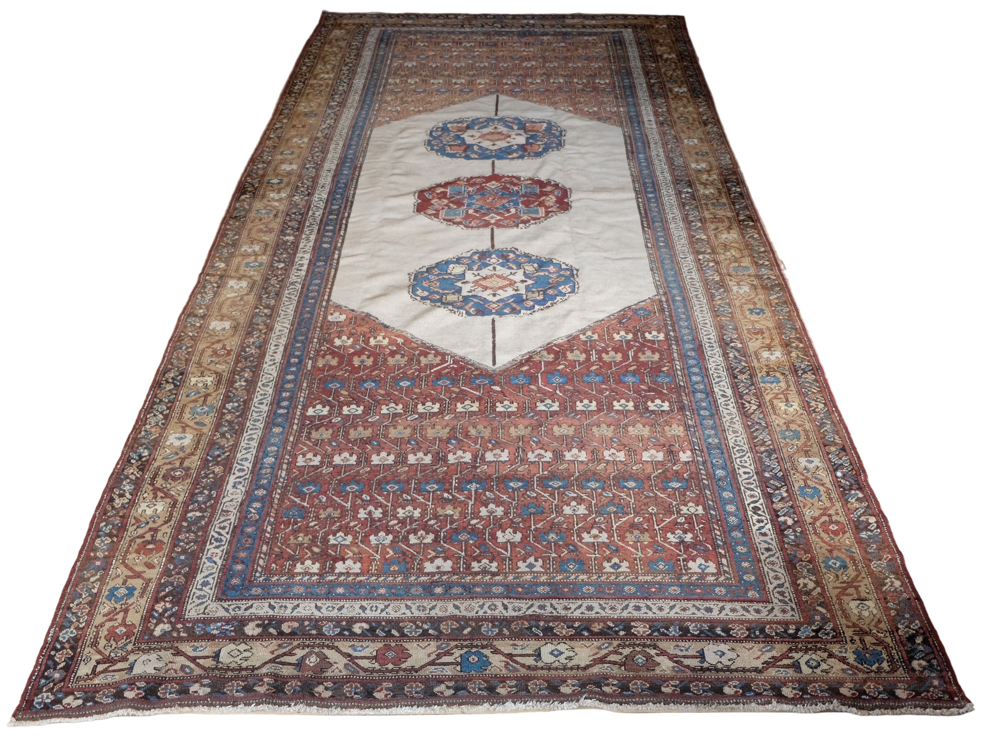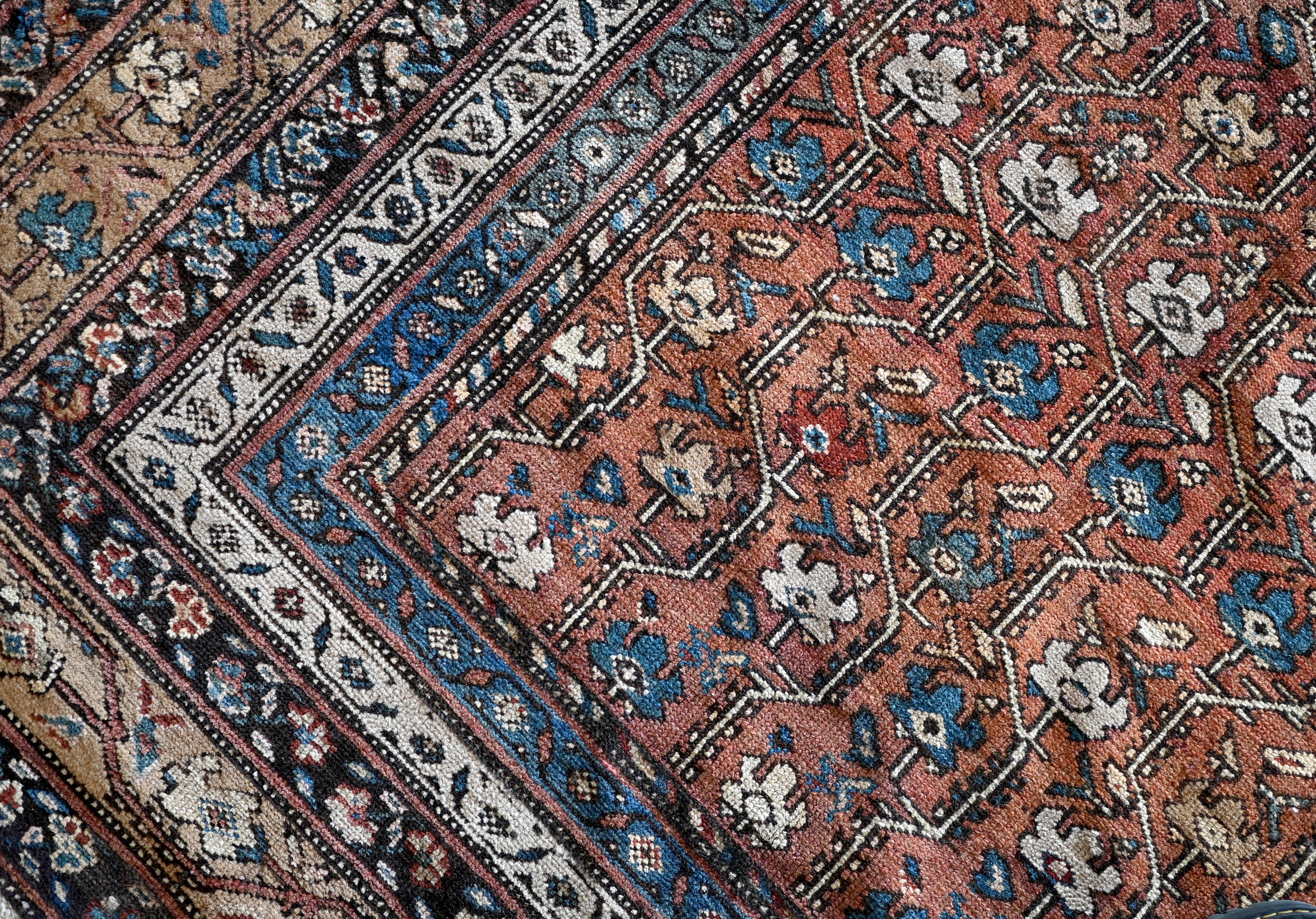 Early 20th century gallery carpet with rich browns, ivory, rust and indigo blue