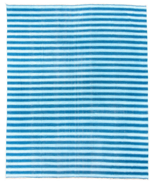 An oversized Dhurrie in blue on blue stripes