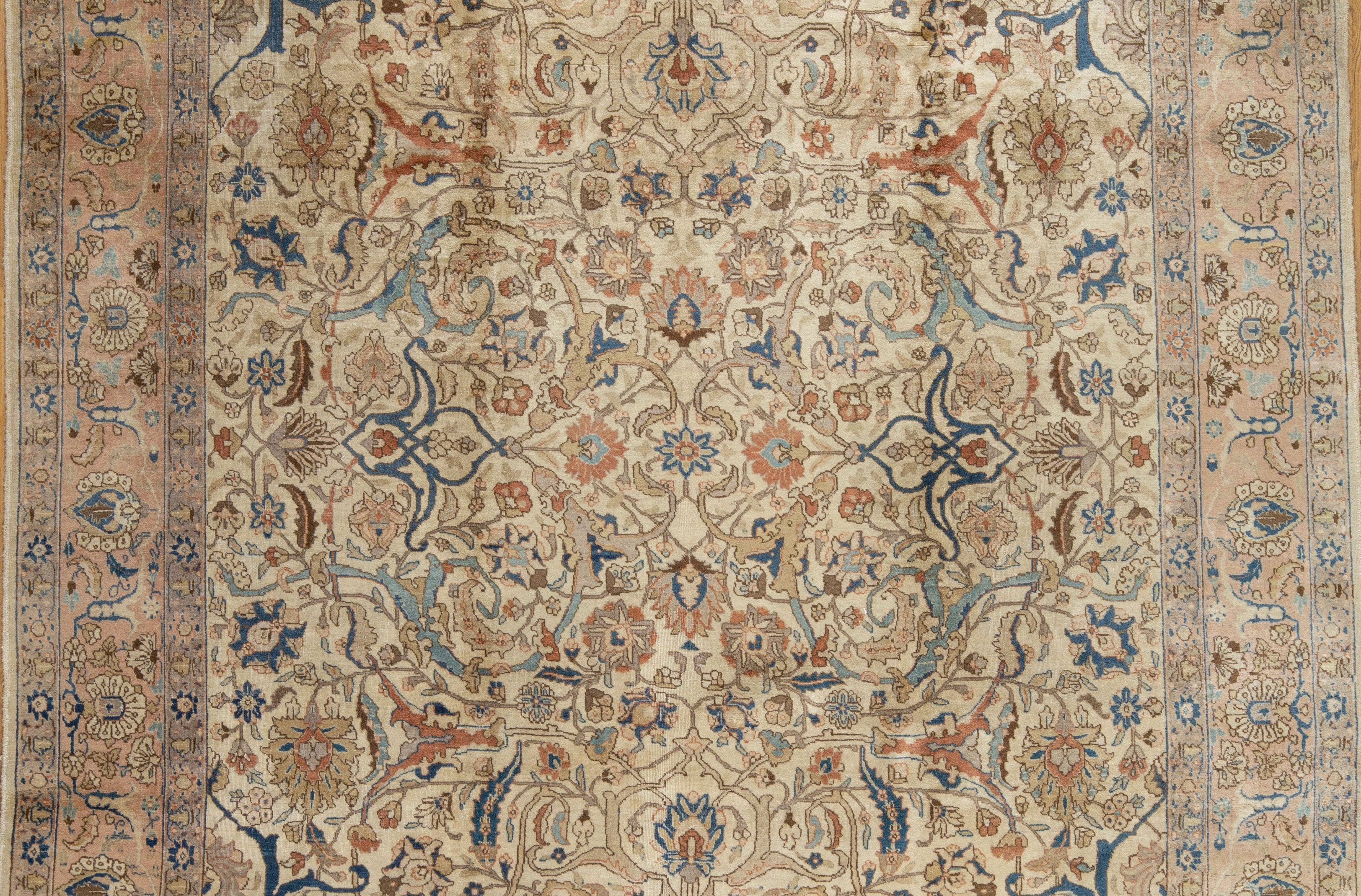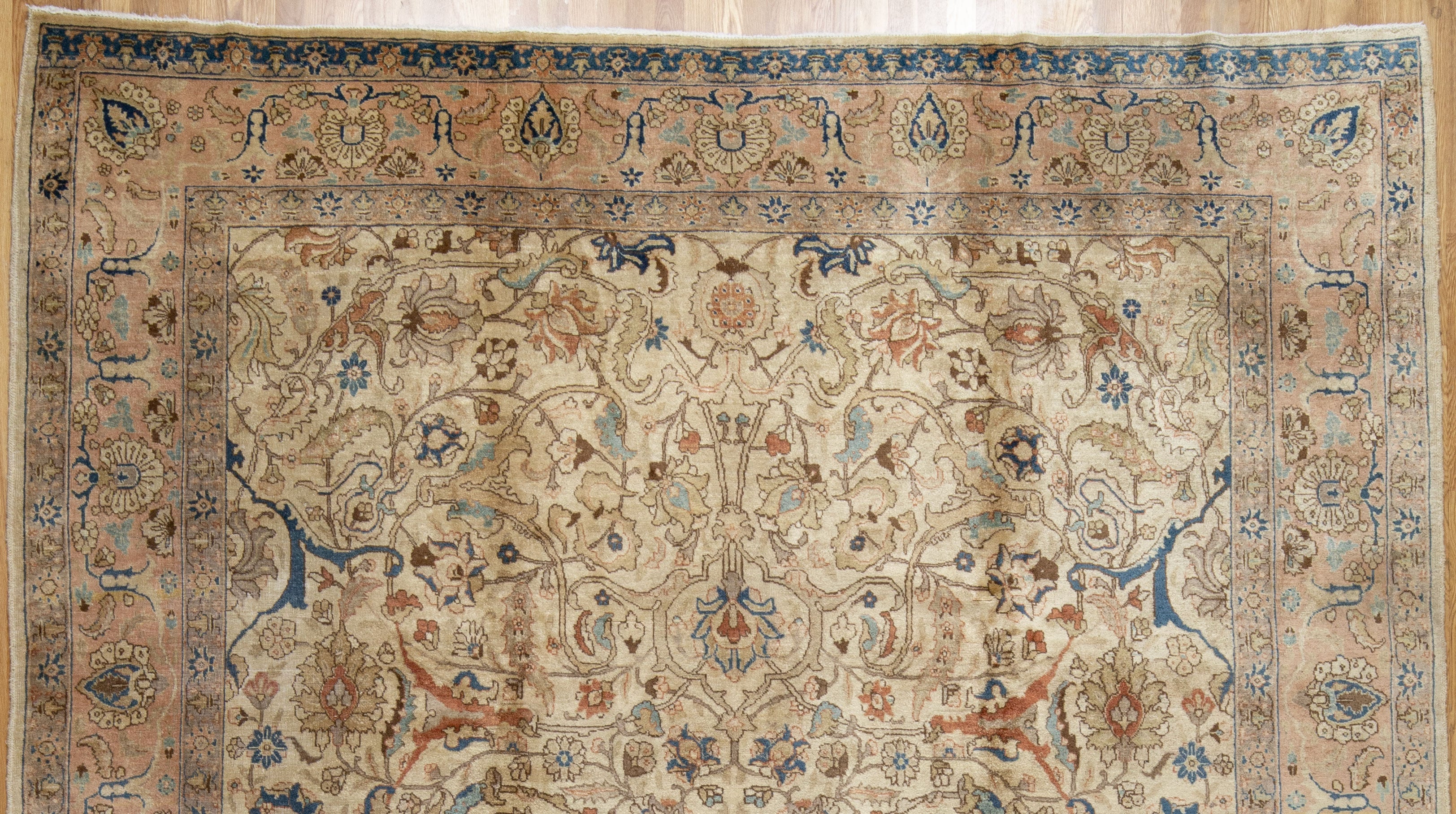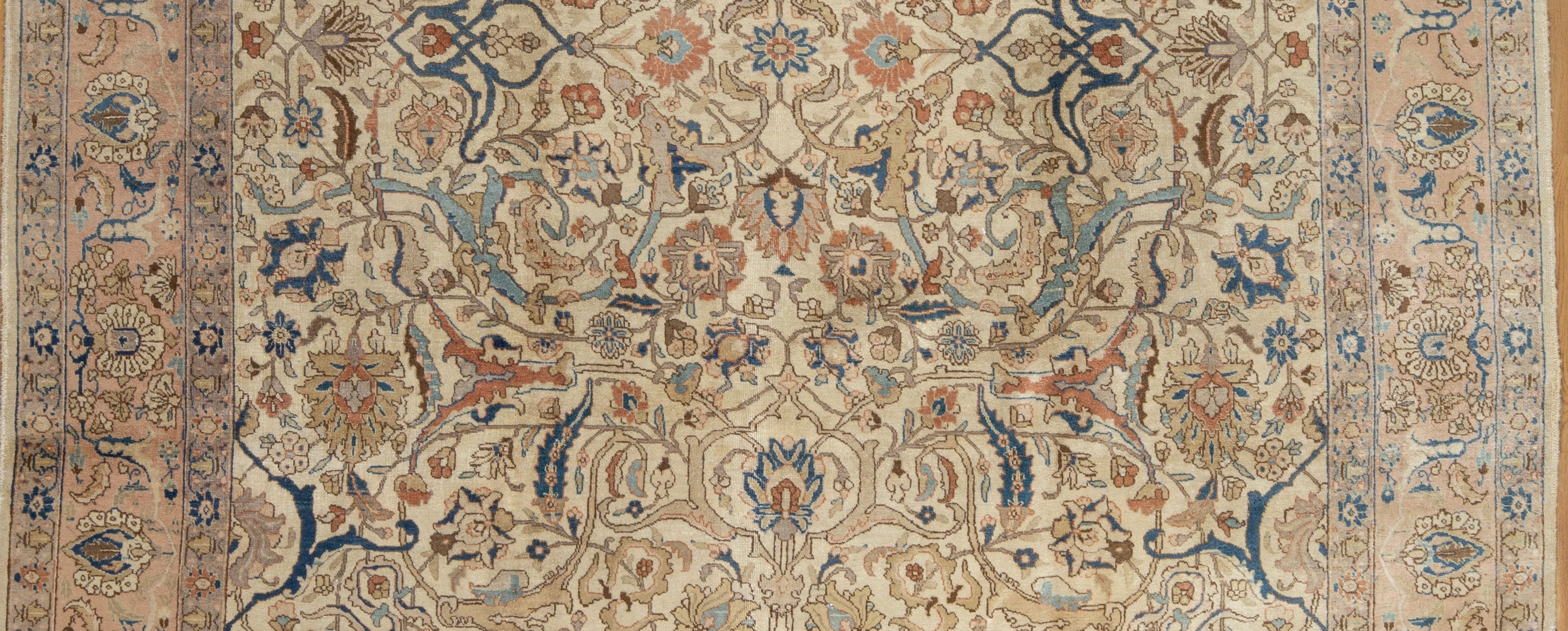 Tabriz with a warm ivory field, brown tones, deep indigo and lavender and blush borders