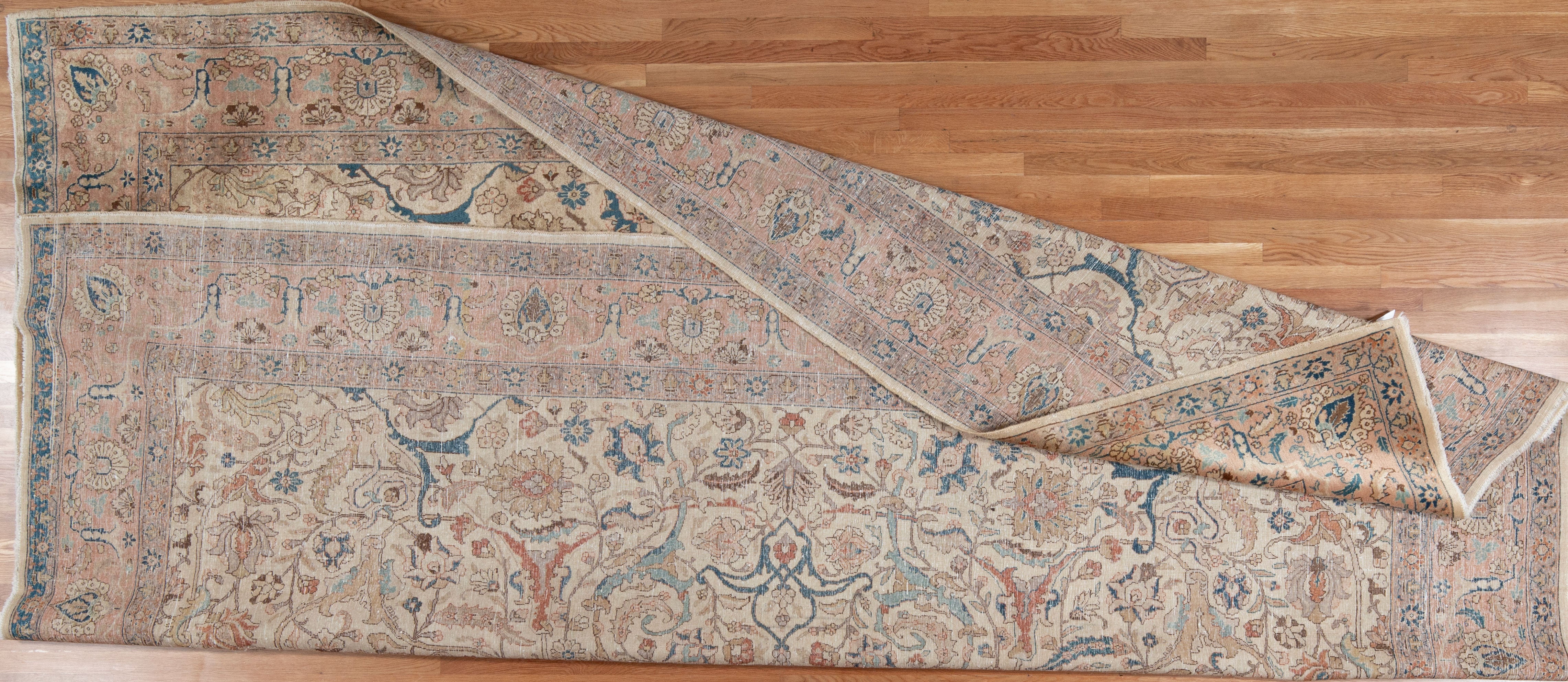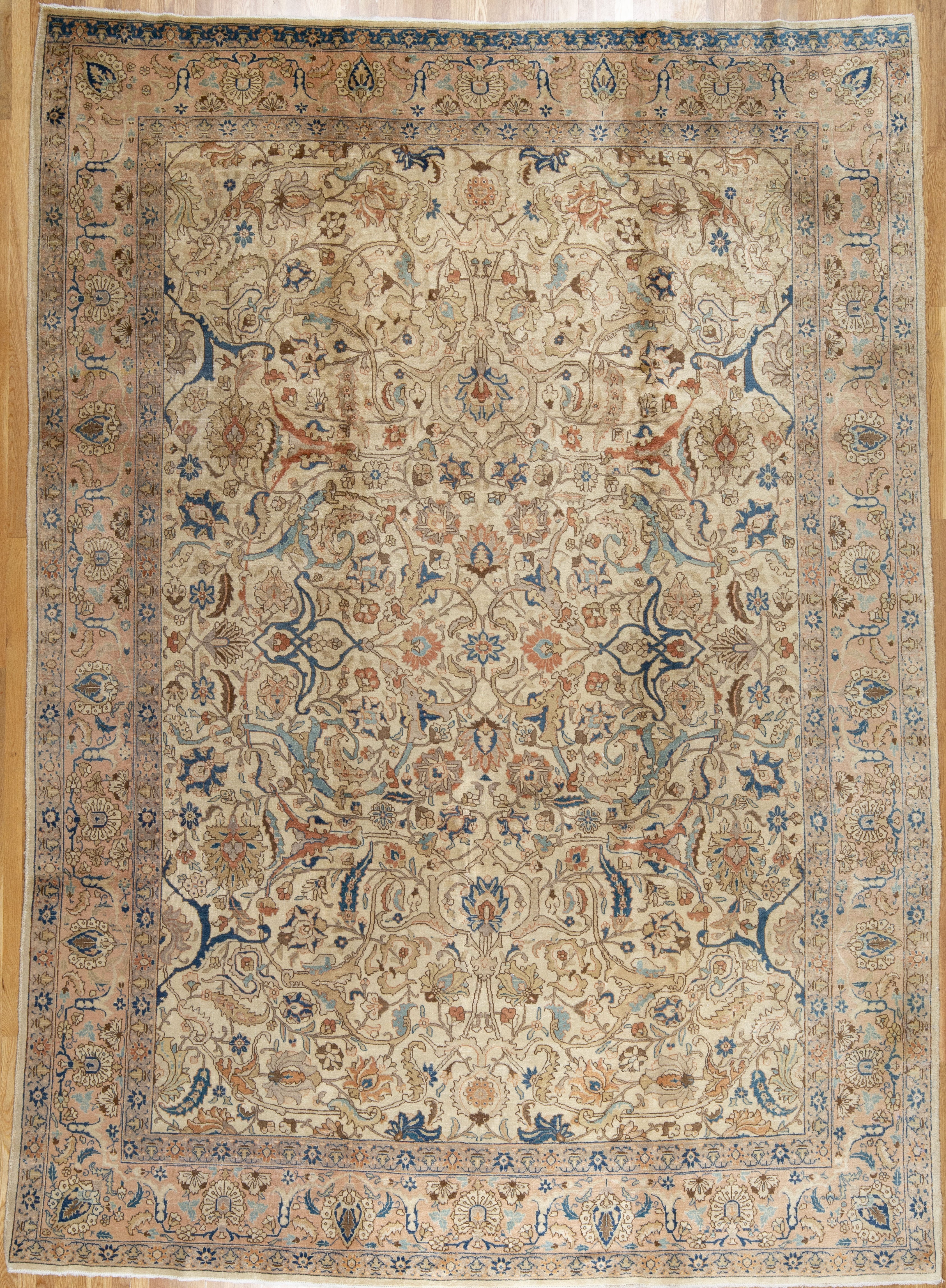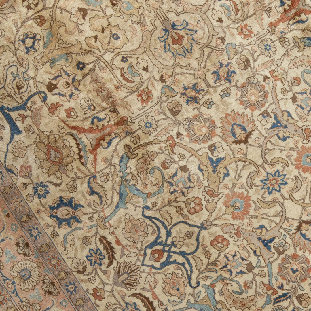 Tabriz with a warm ivory field, brown tones, deep indigo and lavender and blush borders