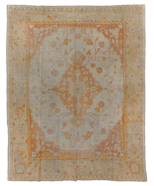 A pale, creamy Oushak. Ivory center-field with a muted ochre medallion and apricot corner pockets. Tones of slate blue, blush, clementine and camel.
