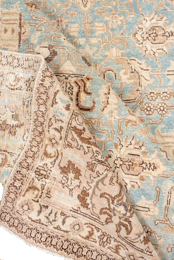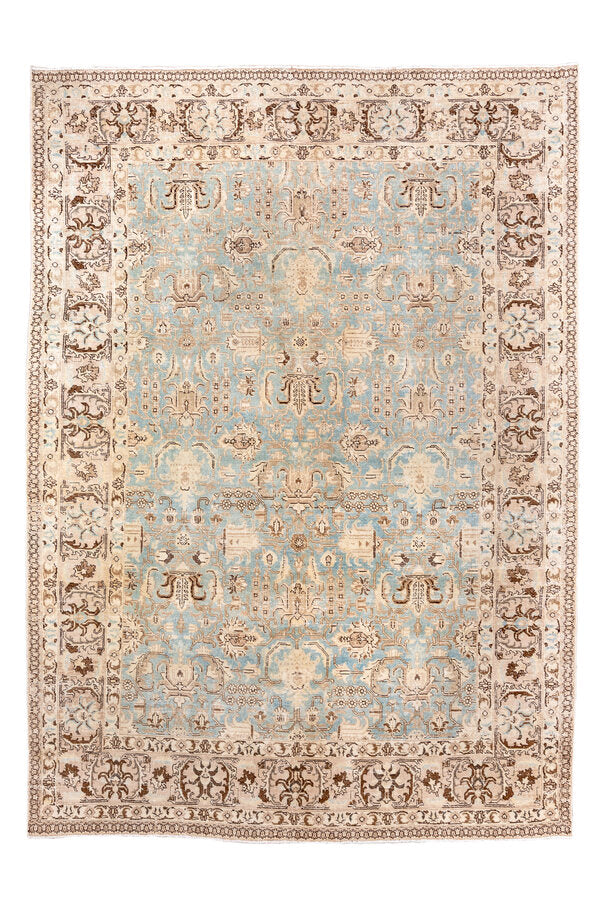 A soft blue field with an all over neural design and border. Beautiful chocolate brown accents.