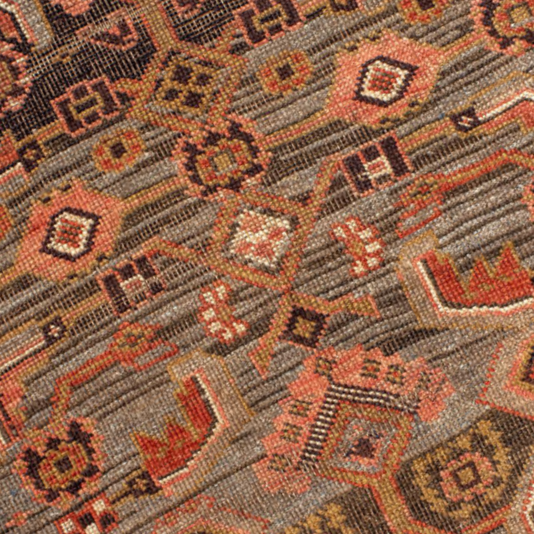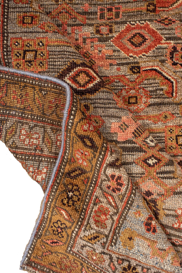 a fine Bidjar with variegating grays. Coral, deep rust, olive green, bubblegum pink, charcoal and cream.
