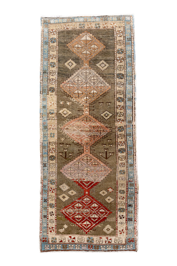 a graphic antique washed Heriz. a repeating medallion and shades of pale coral, khaki, cocoa, olive green, deep red, camel, sky blue and ivory