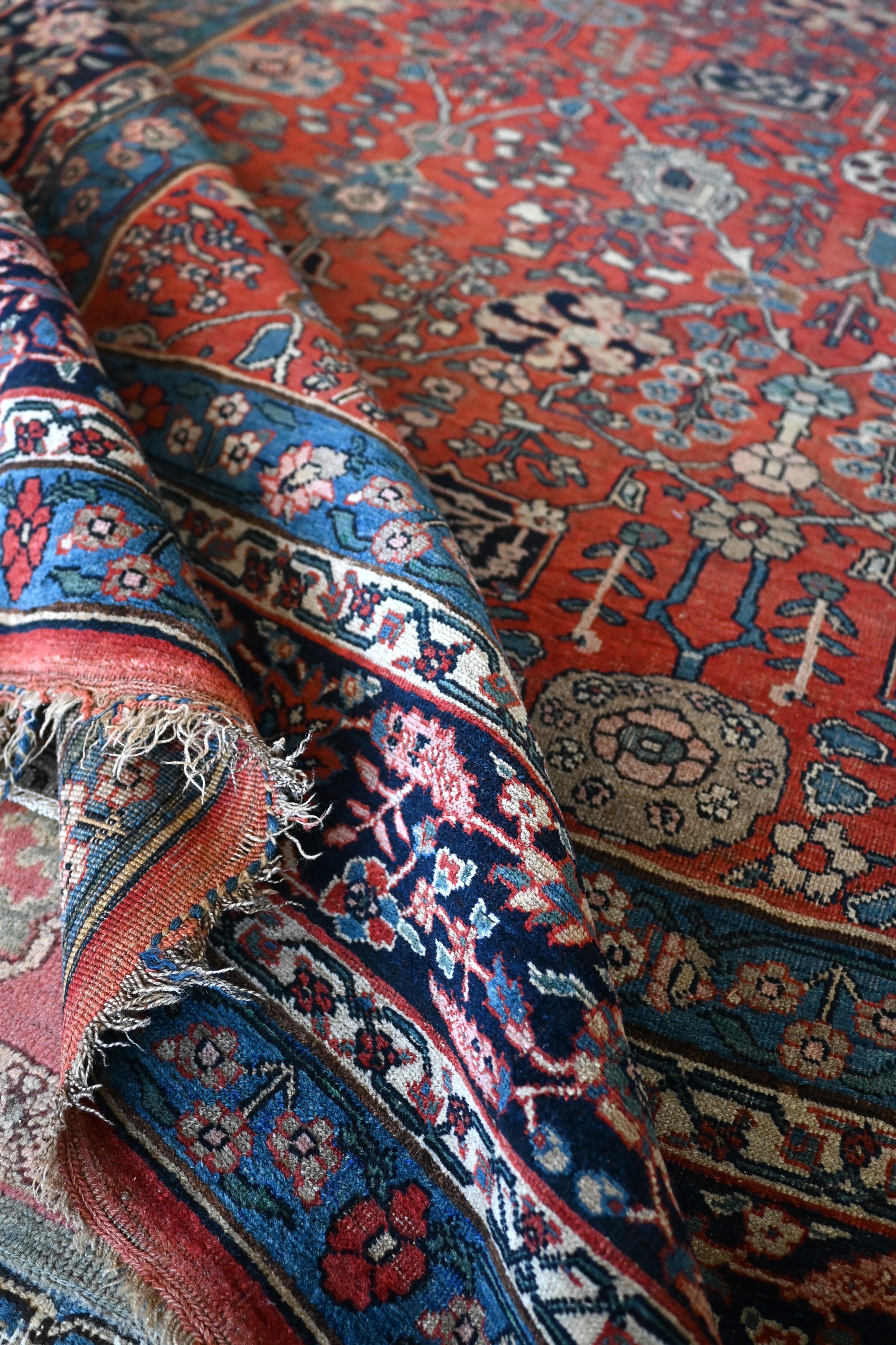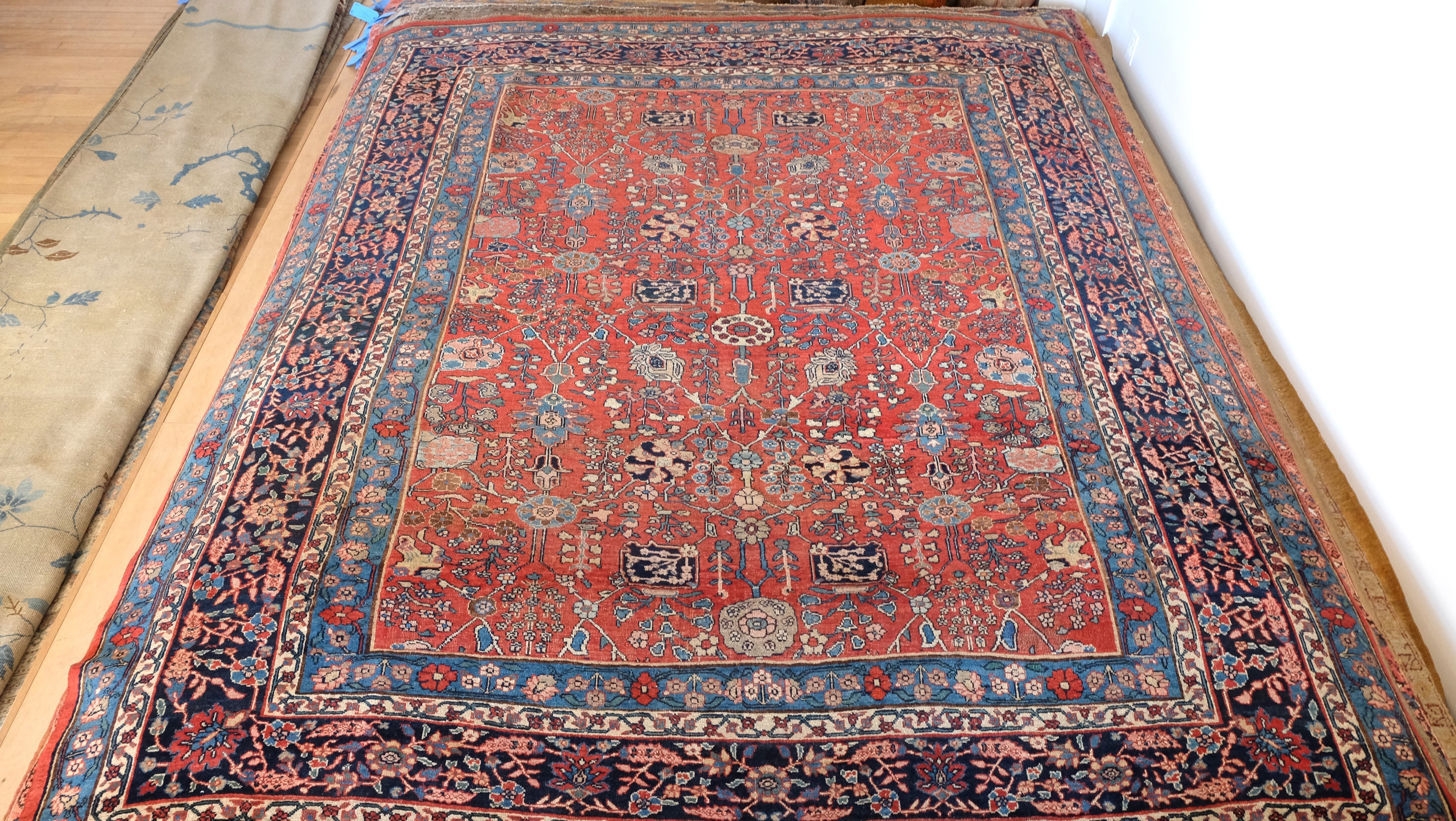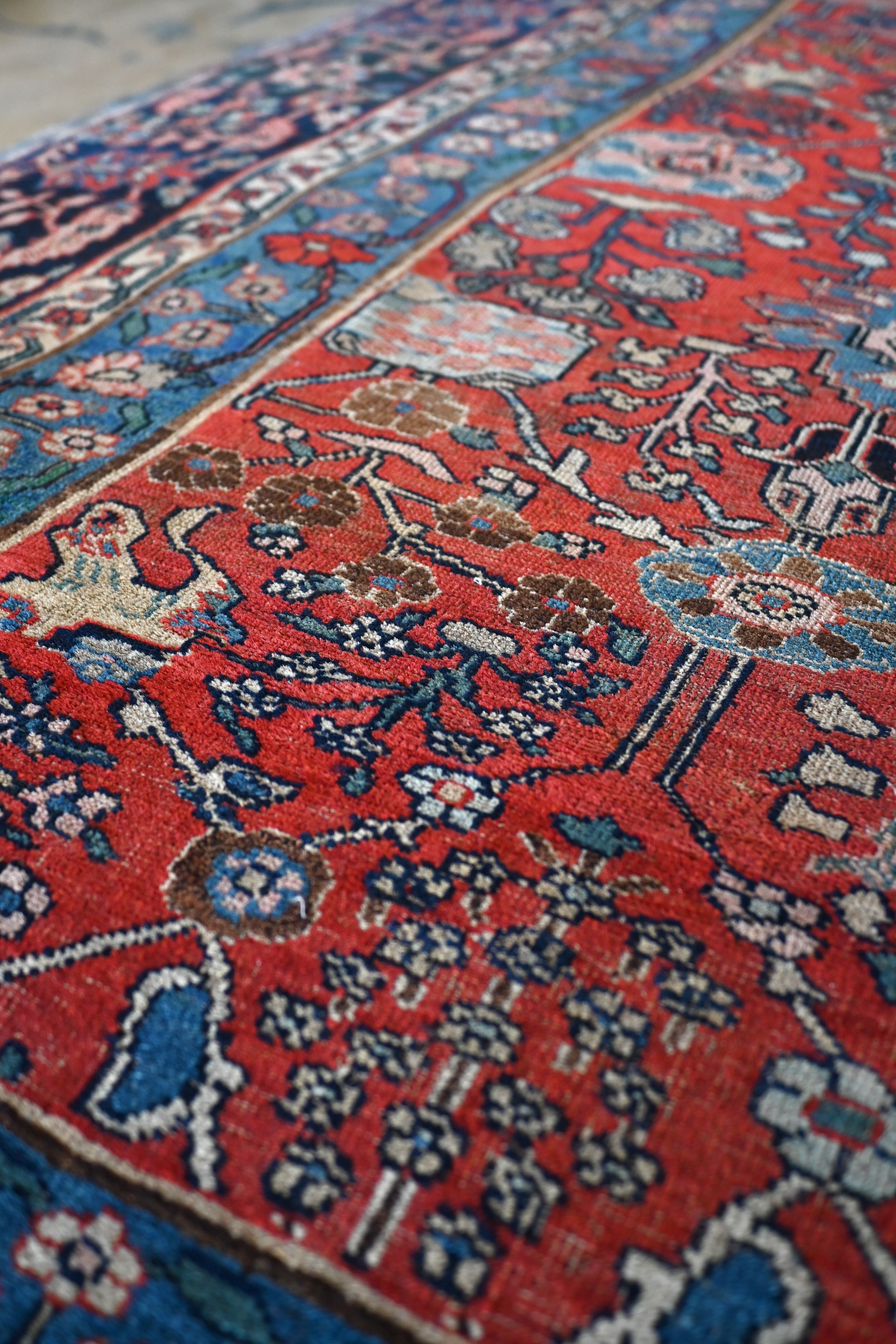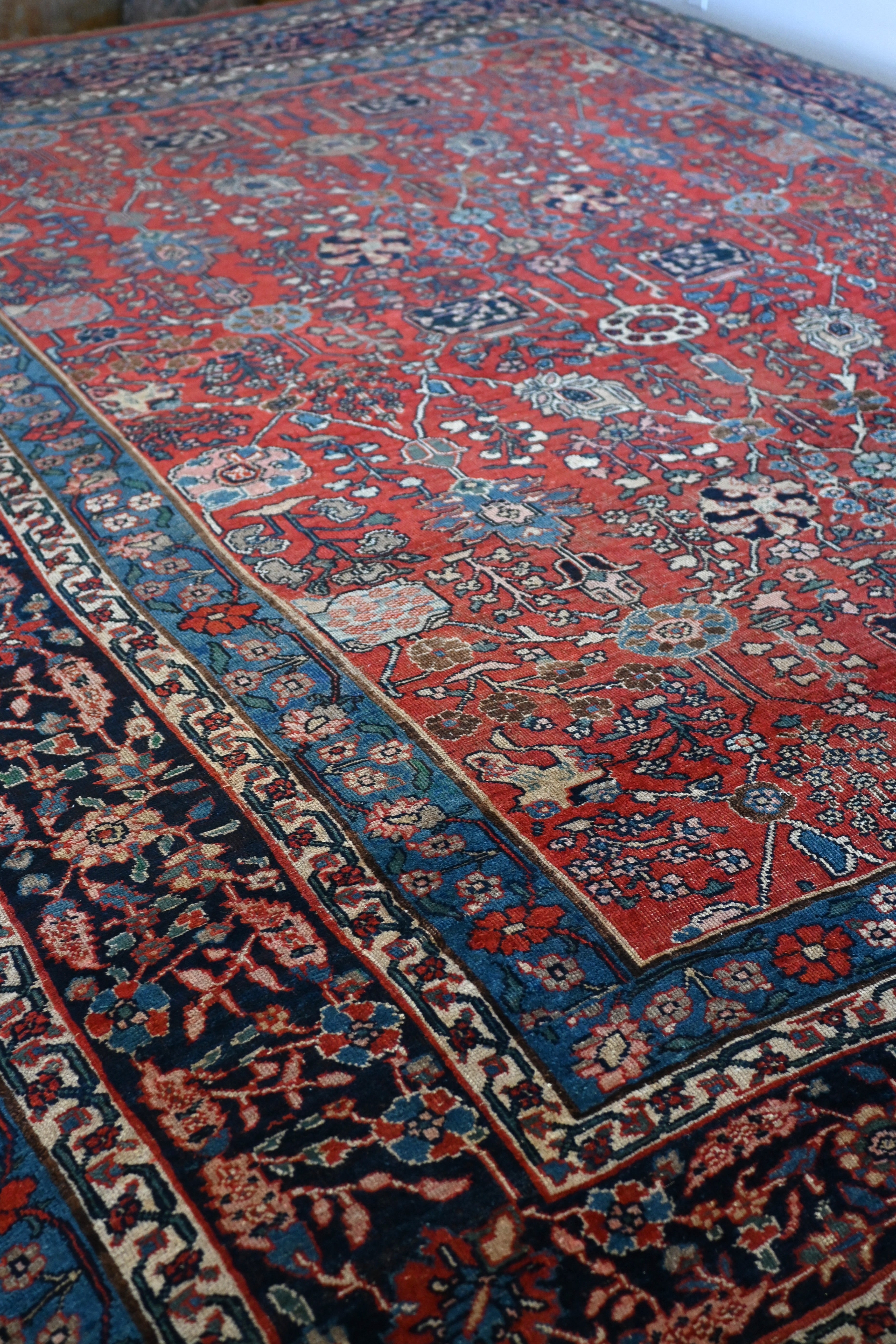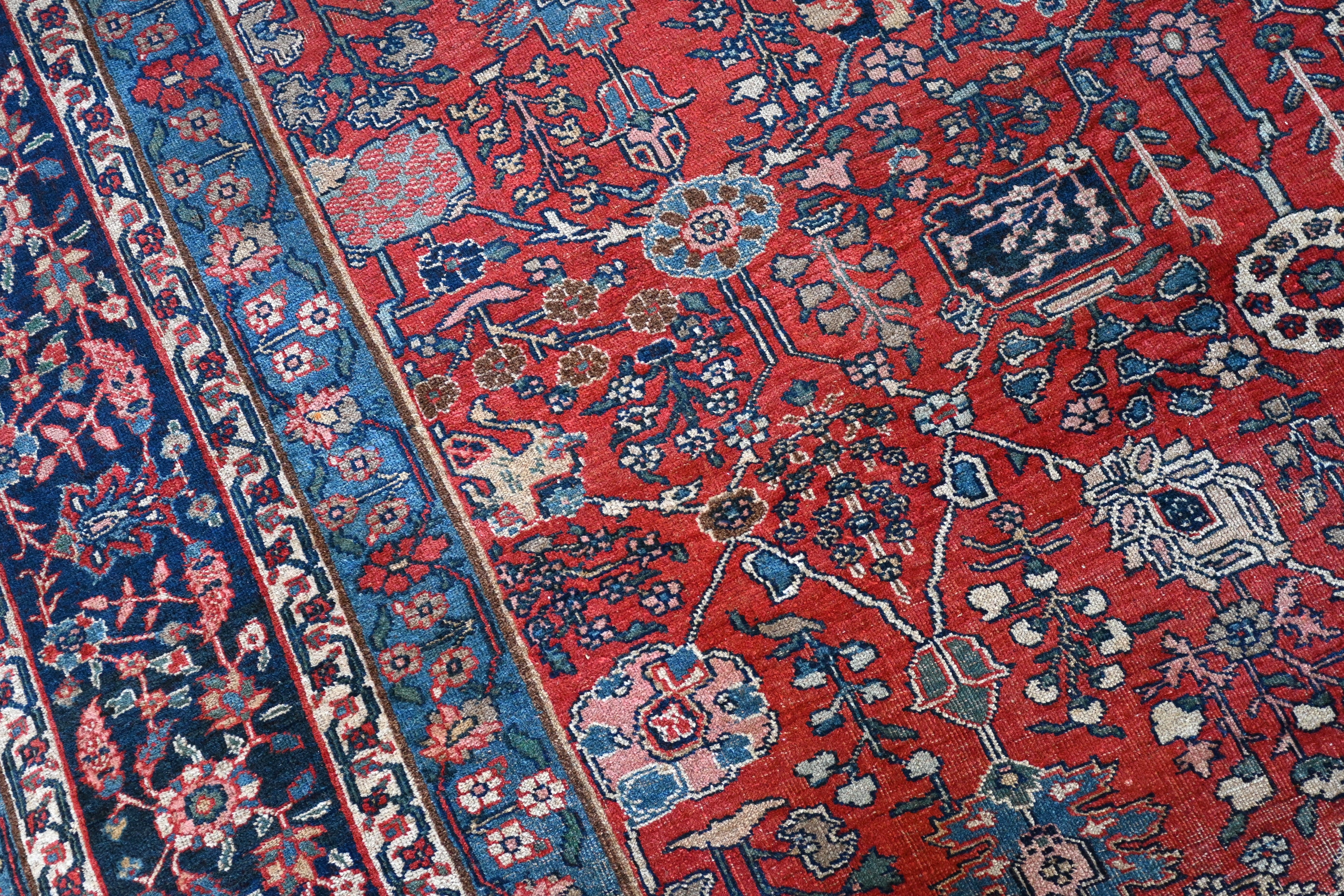 Turn of the century Bidjar with a soft madder red field, various tones of blue, ivory and soft pink and green.