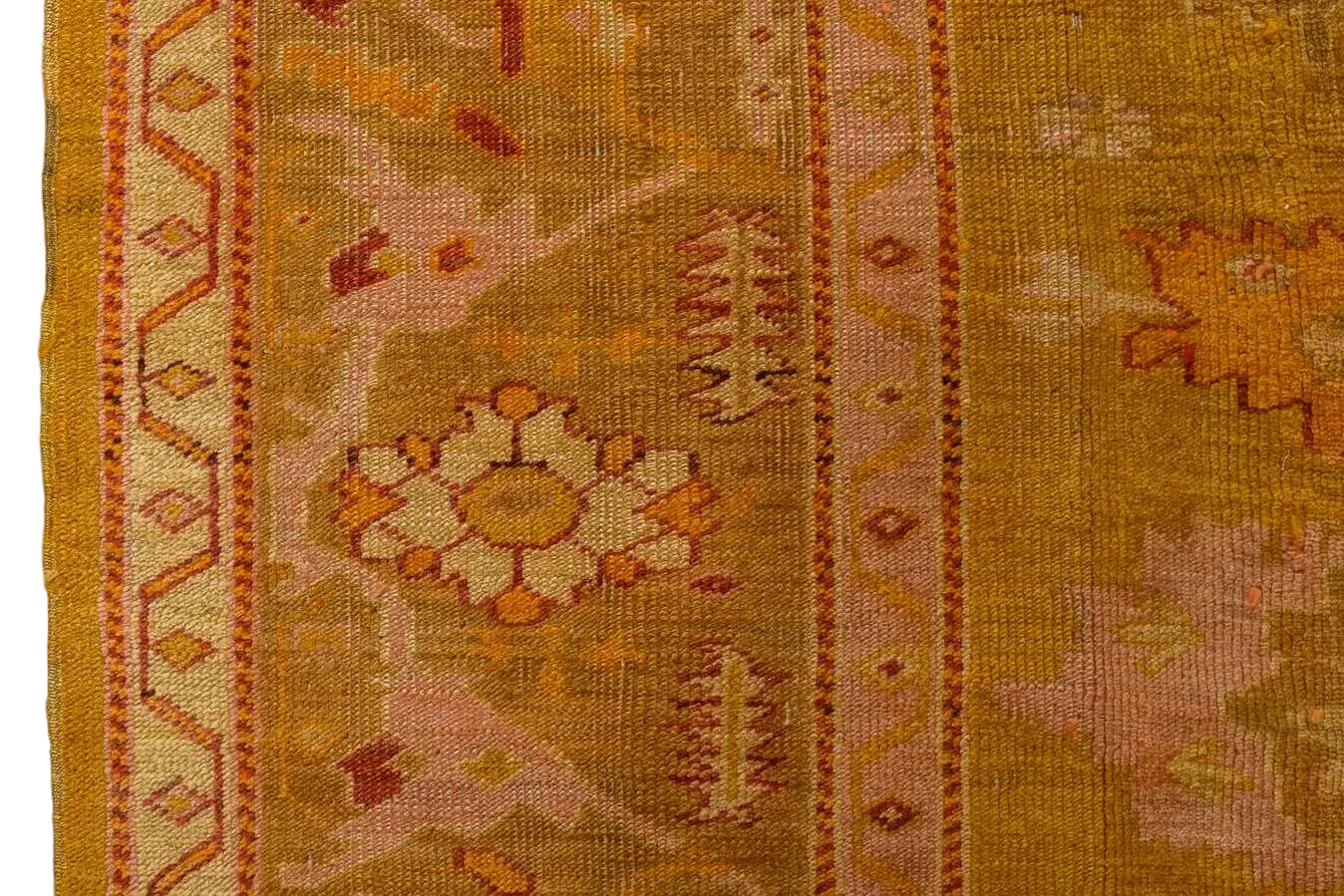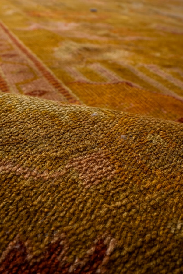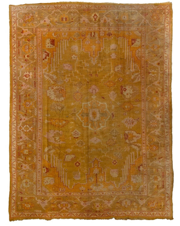 Antique Oushak with tones of numeric, ivory and pink accents with a field and border color that read yellow and green.