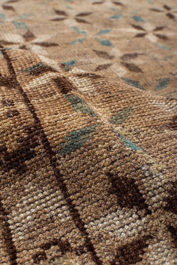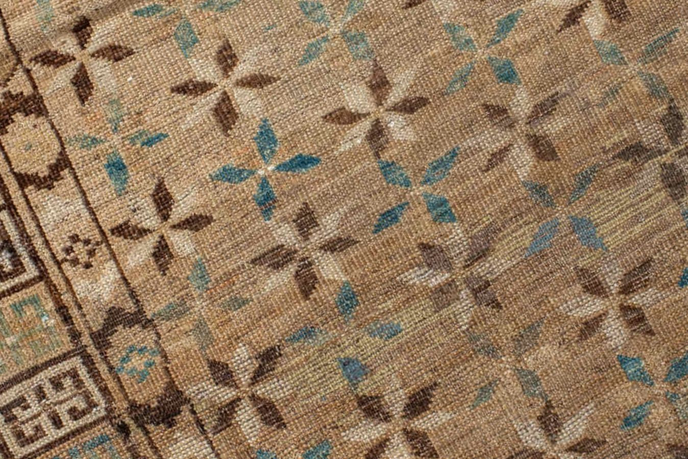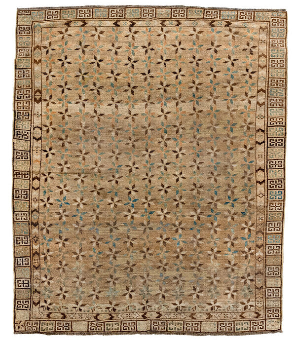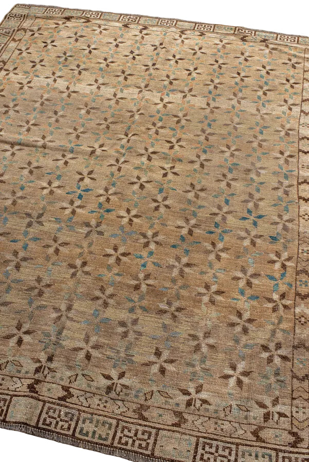 An unusual Ersari with a warm antique wash with a rich browns of wheat and chocolate and indigo accents.