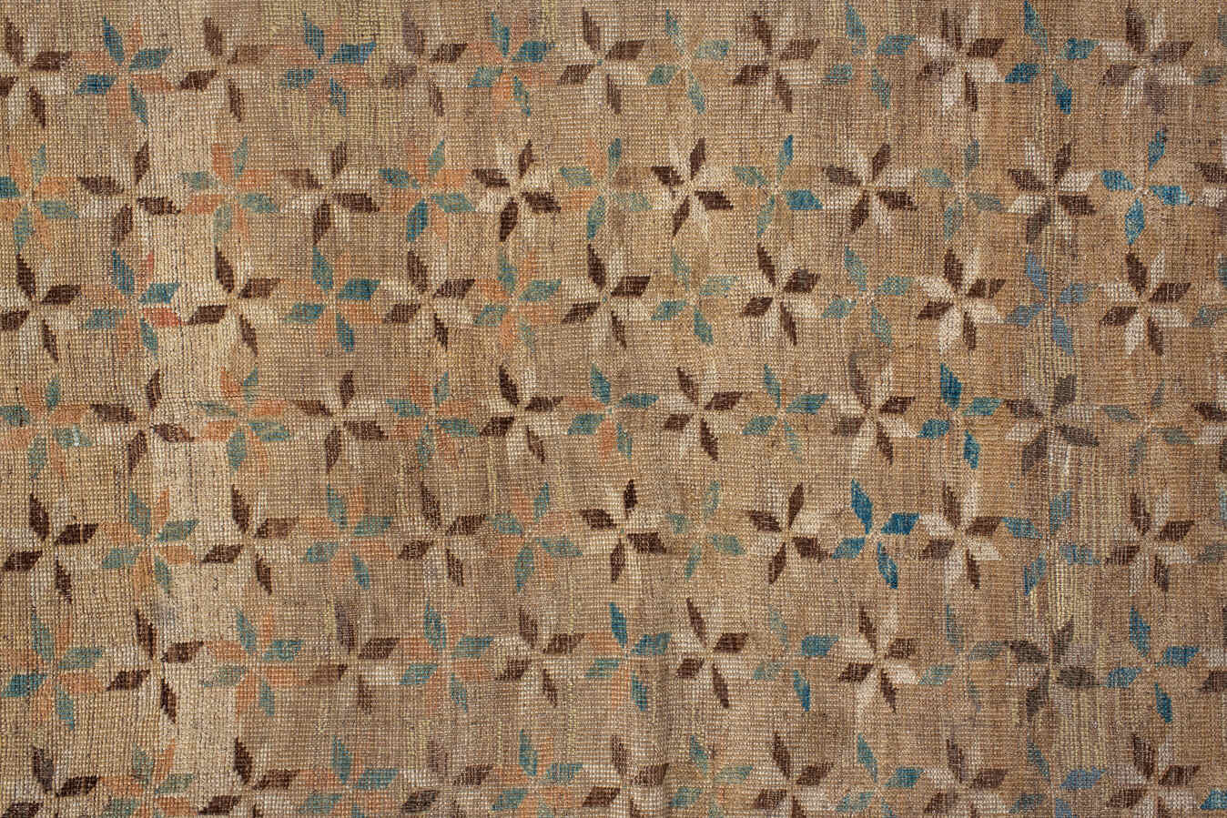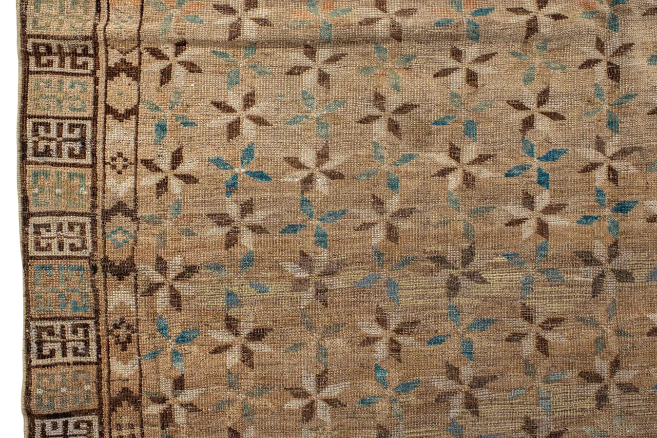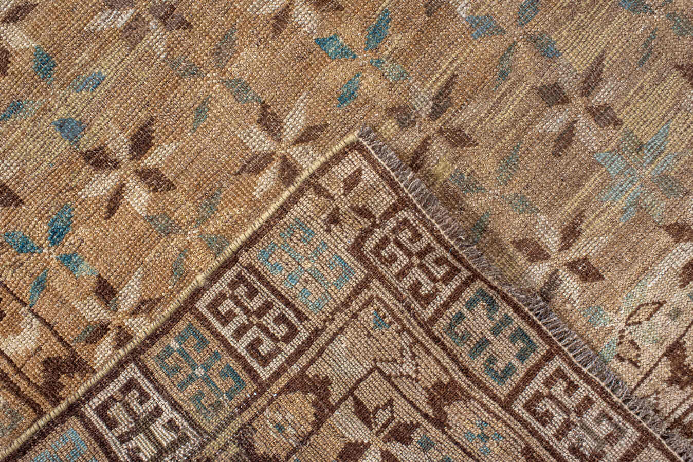 An unusual Ersari with a warm antique wash with a rich browns of wheat and chocolate and indigo accents.