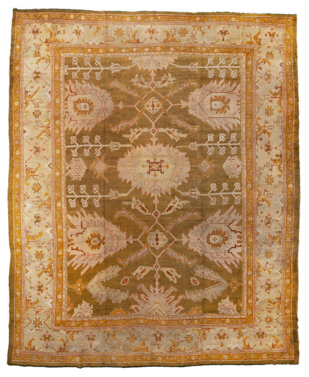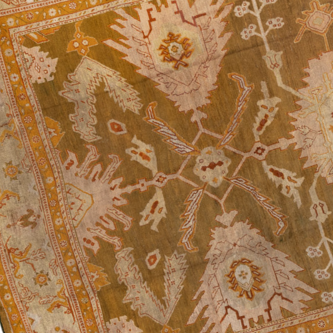 Late 19th century Oushak with gorgeous natural dyes in an olive green field, soft pink, marigold and terra cotta. An unusual and special piece with a soft pile. Reduced in size.