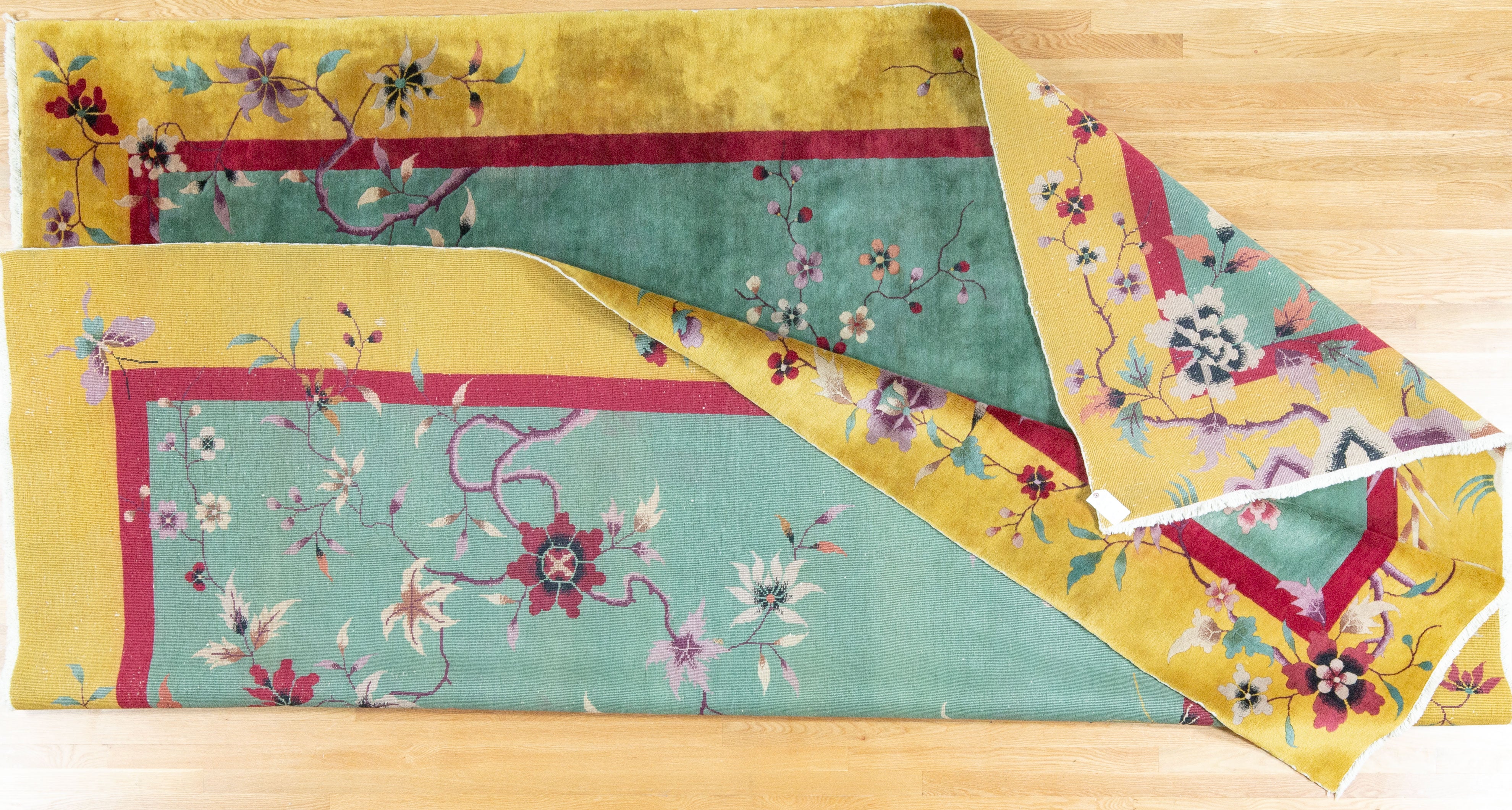 an antique Chinese rug. deep ochre, pale teal, cranberry, orchid, lavender, and cream