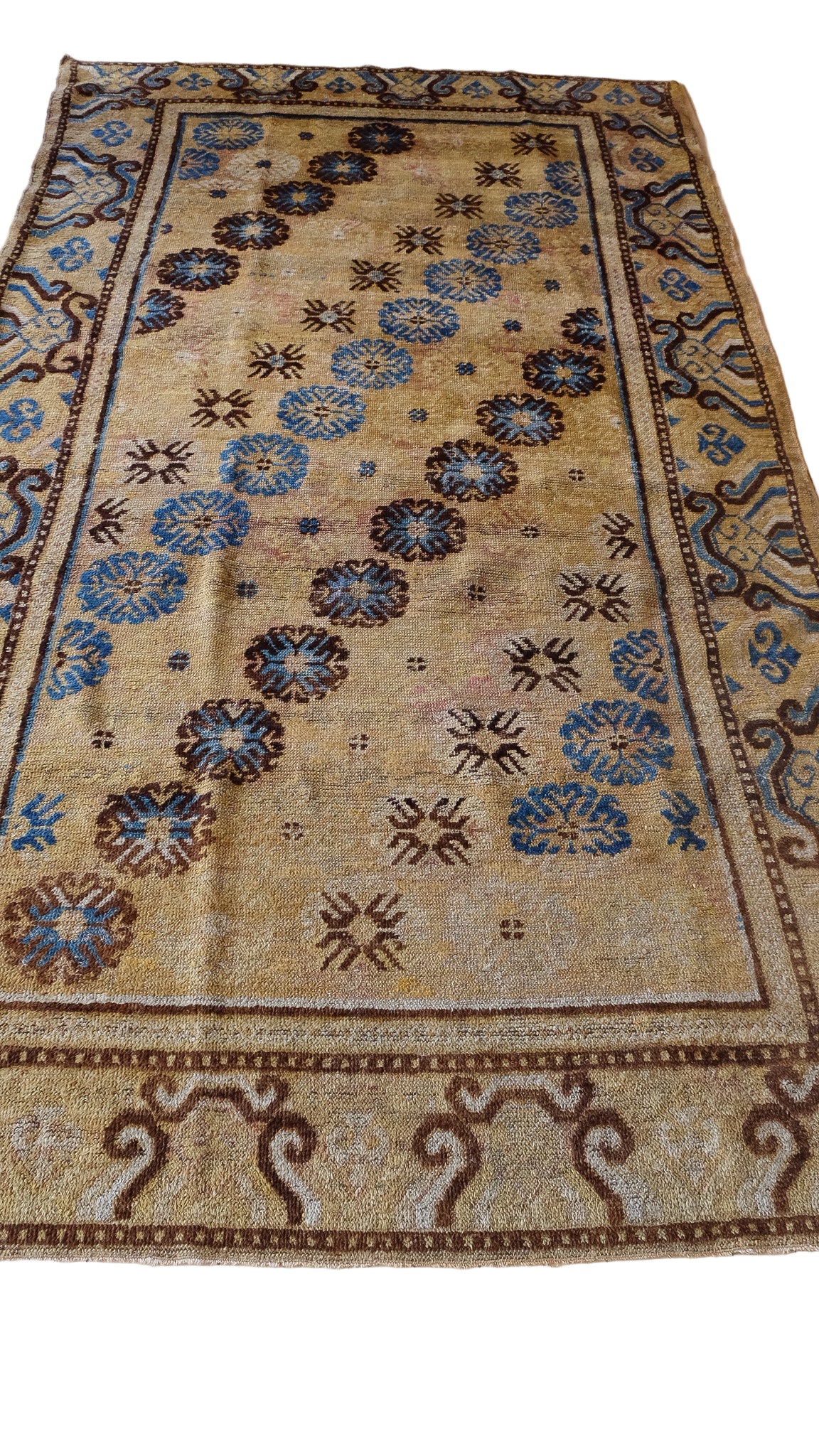 Khotan with varying shades of ochre, cocoa, cornflower blue and hints of lavender