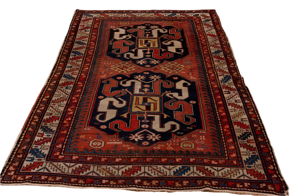 A Cloudband Kazak with deep rust red, navy, yellow and ivory.