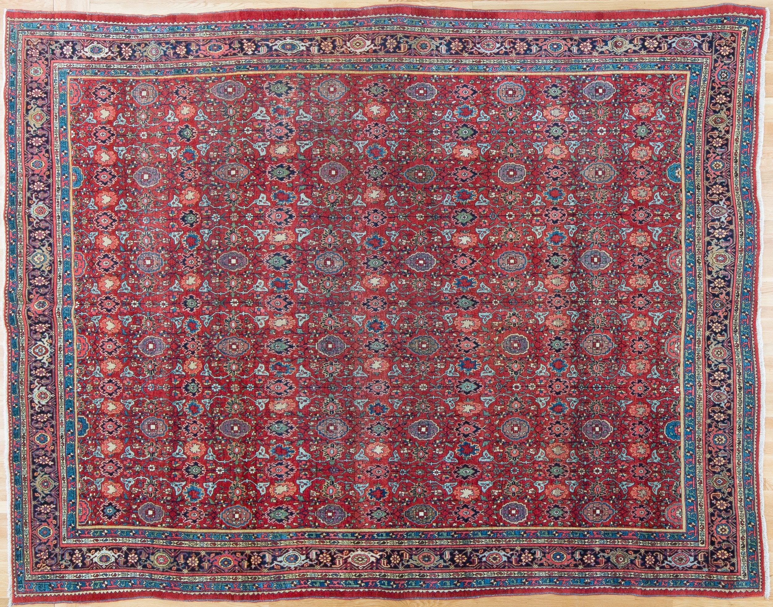 A Persian Bidjar with a cherry red field and accents of lilac, blue, and coral