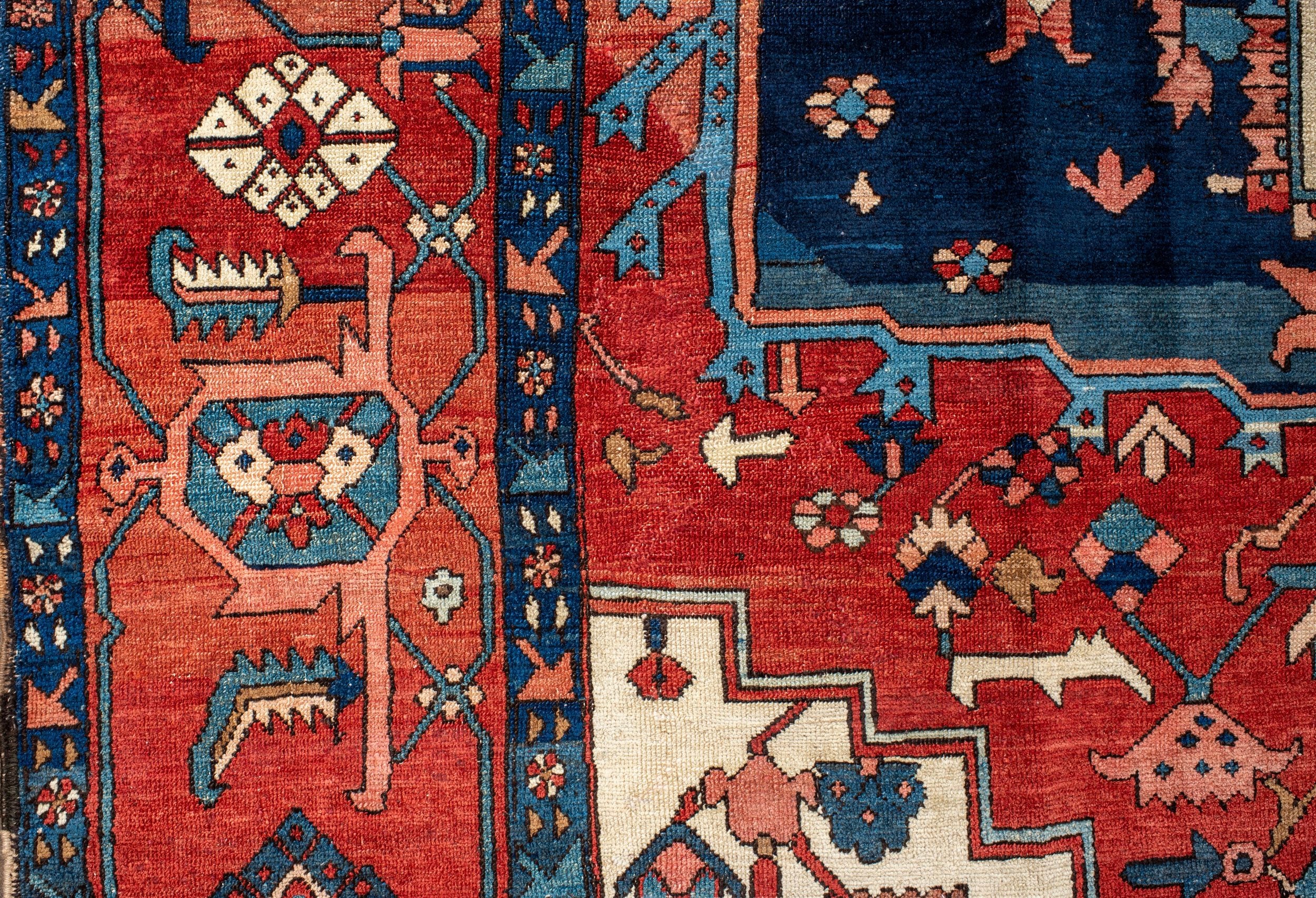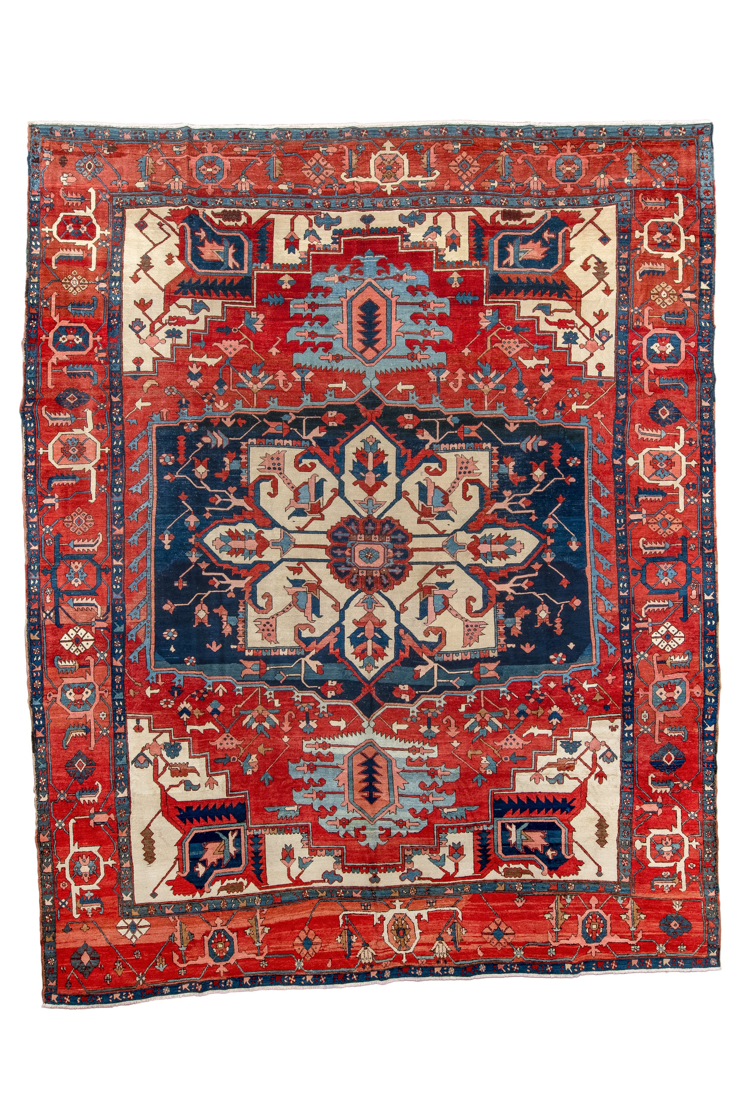 Late 19th century Serapi with a deep madder red field and accents of navy, sky blue, camel and ivory