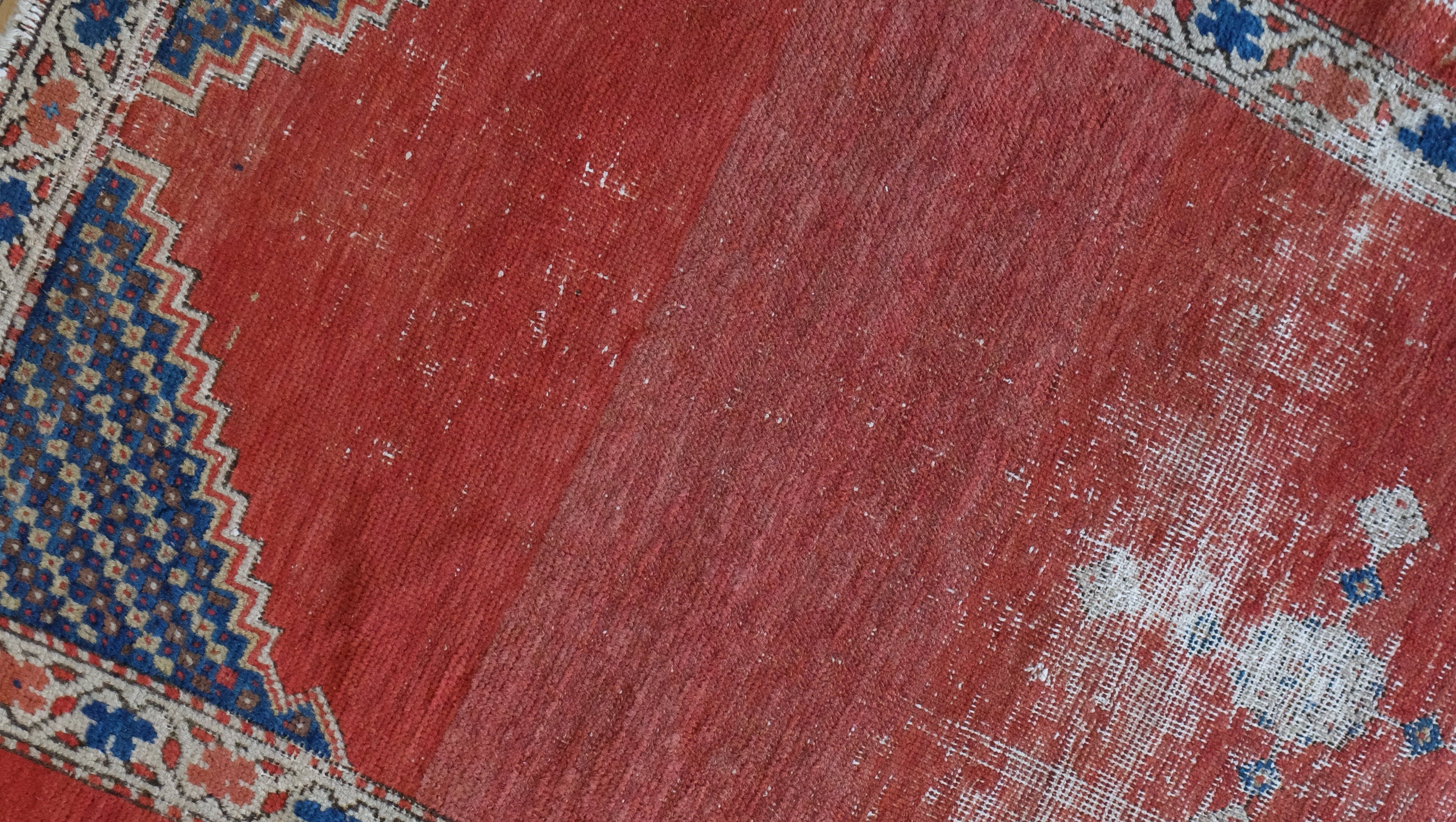 Antique tribal rug with a rust field blue corners and wheat accents. Some distressing in the field.