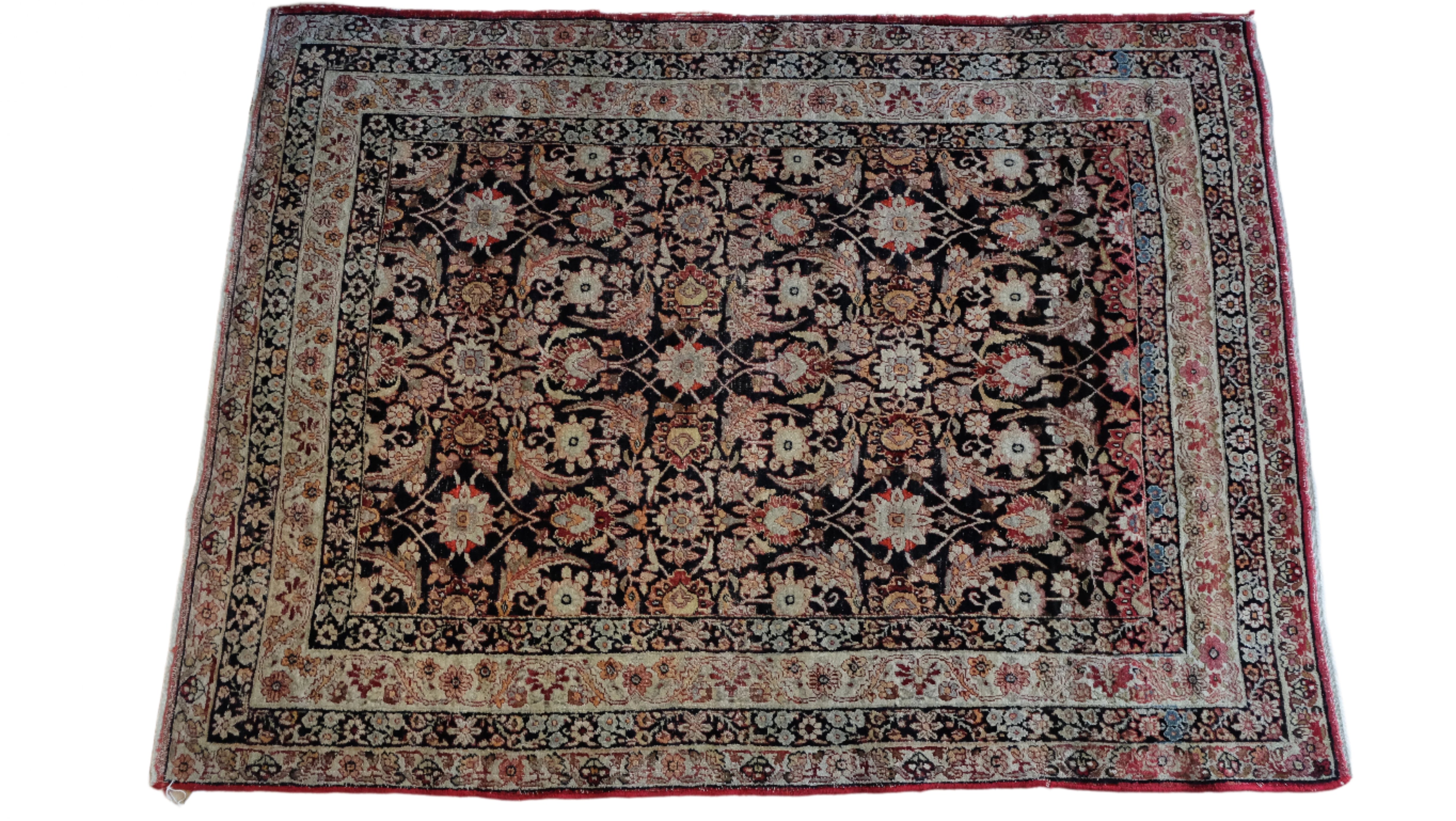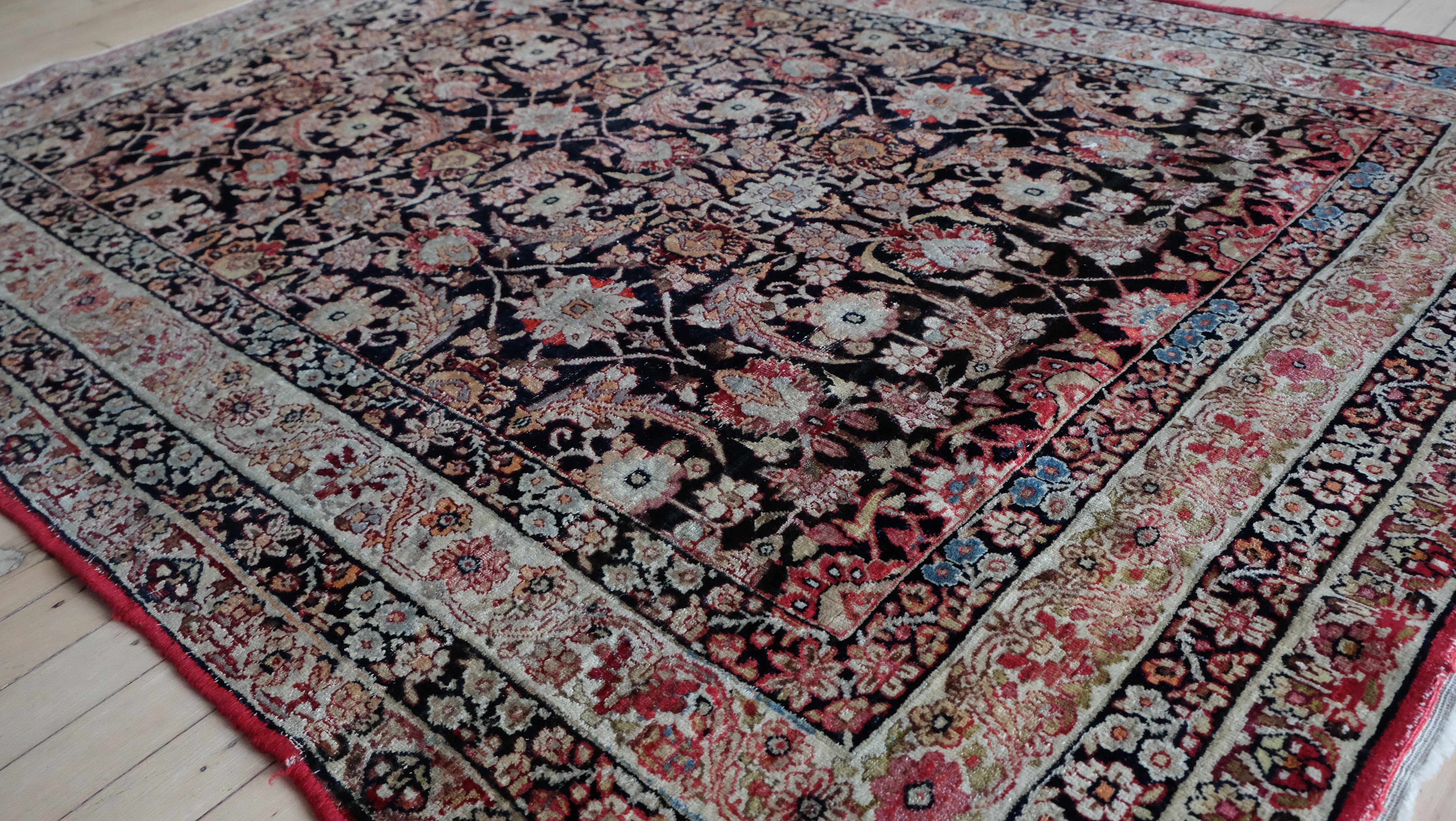 Antique Lavar with a lovely all-over floral design in tones of raspberry red, jade green and ivory set on a deep navy field