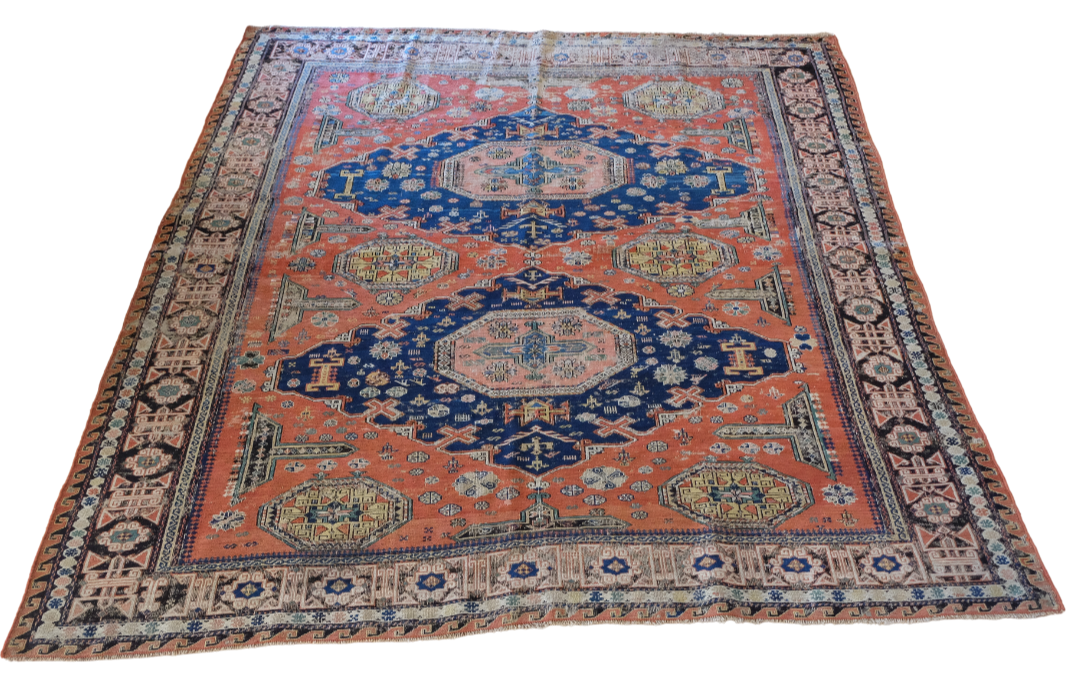 A turn of the century Soumac with rust, navy, mustard, olive and jade green