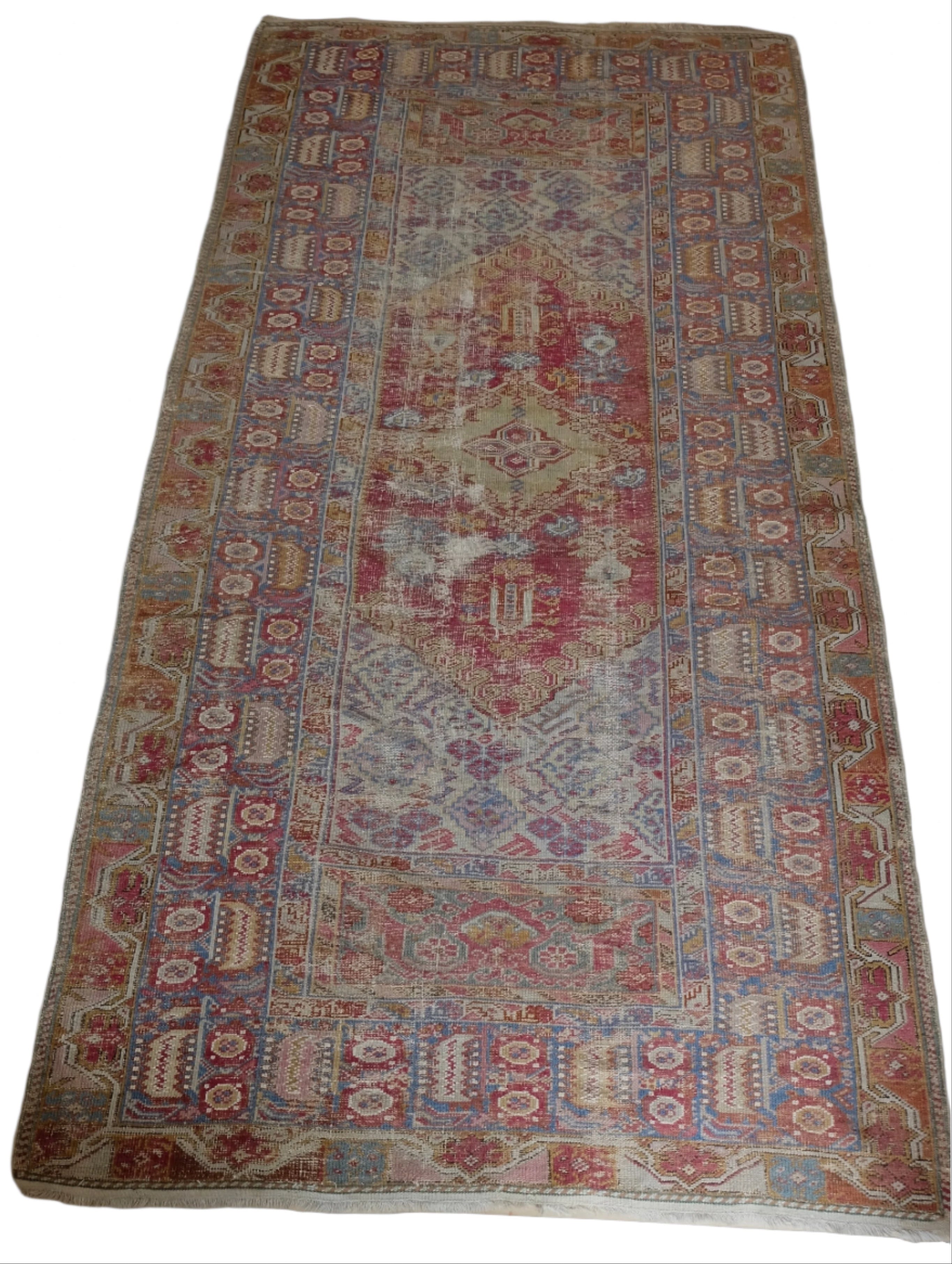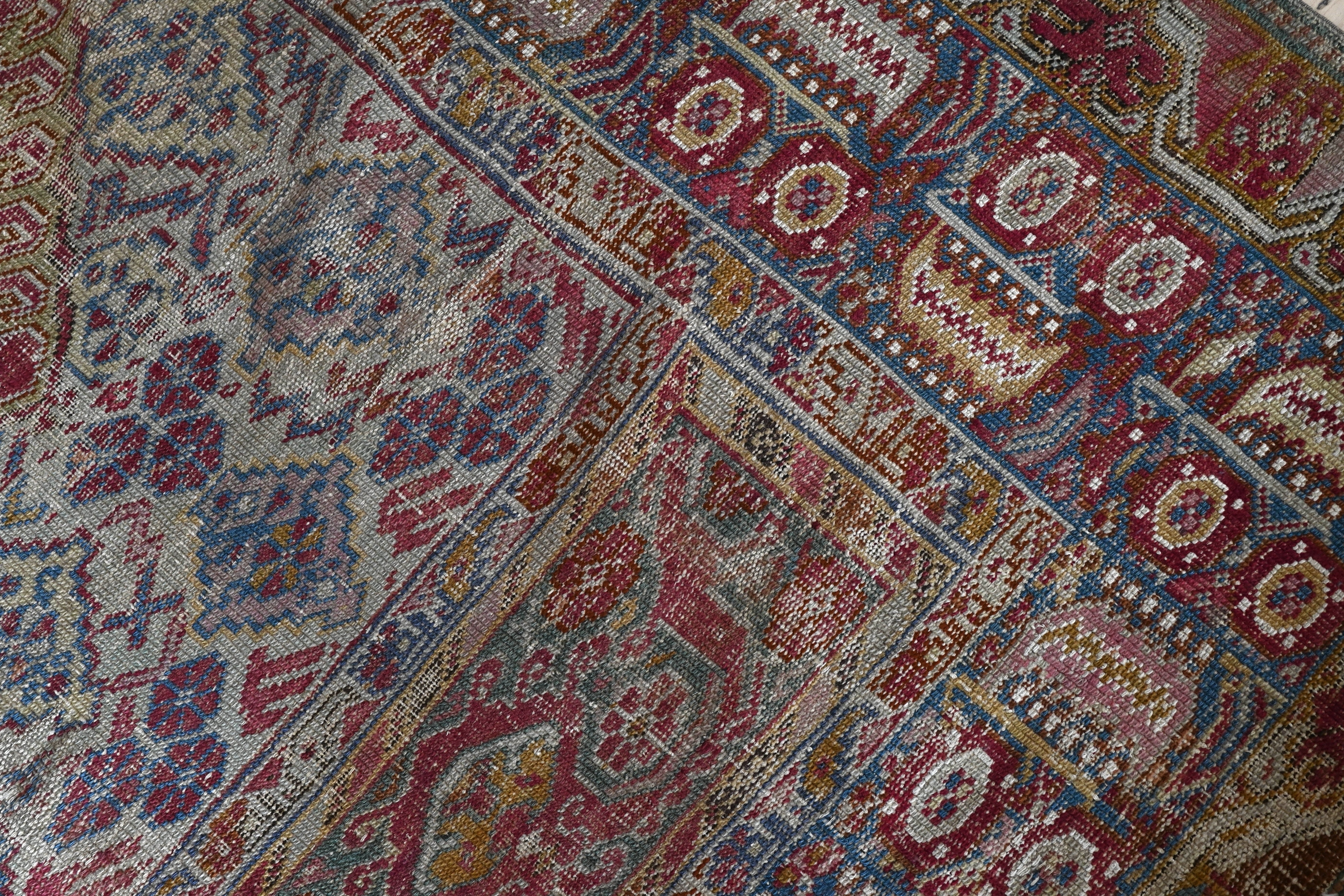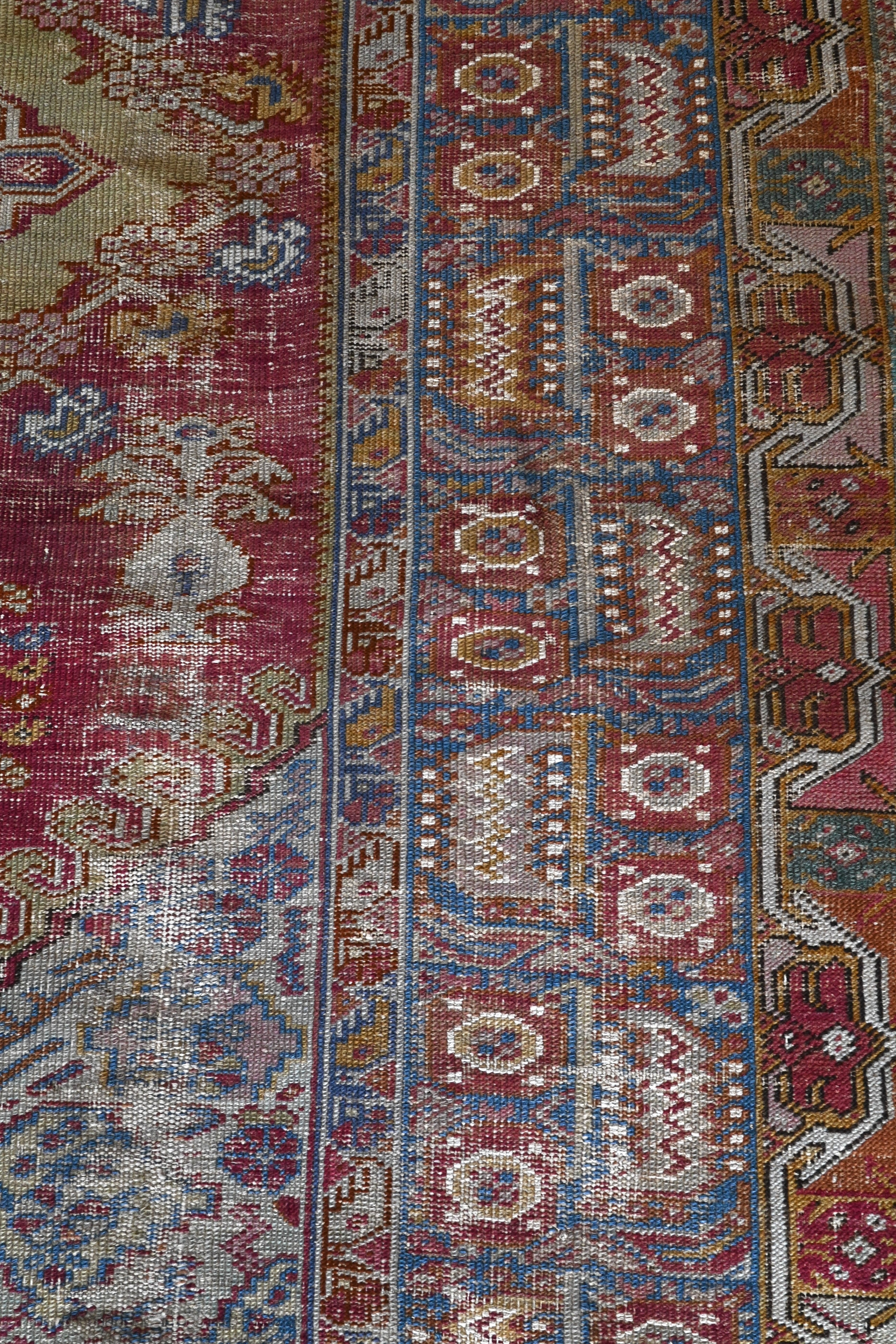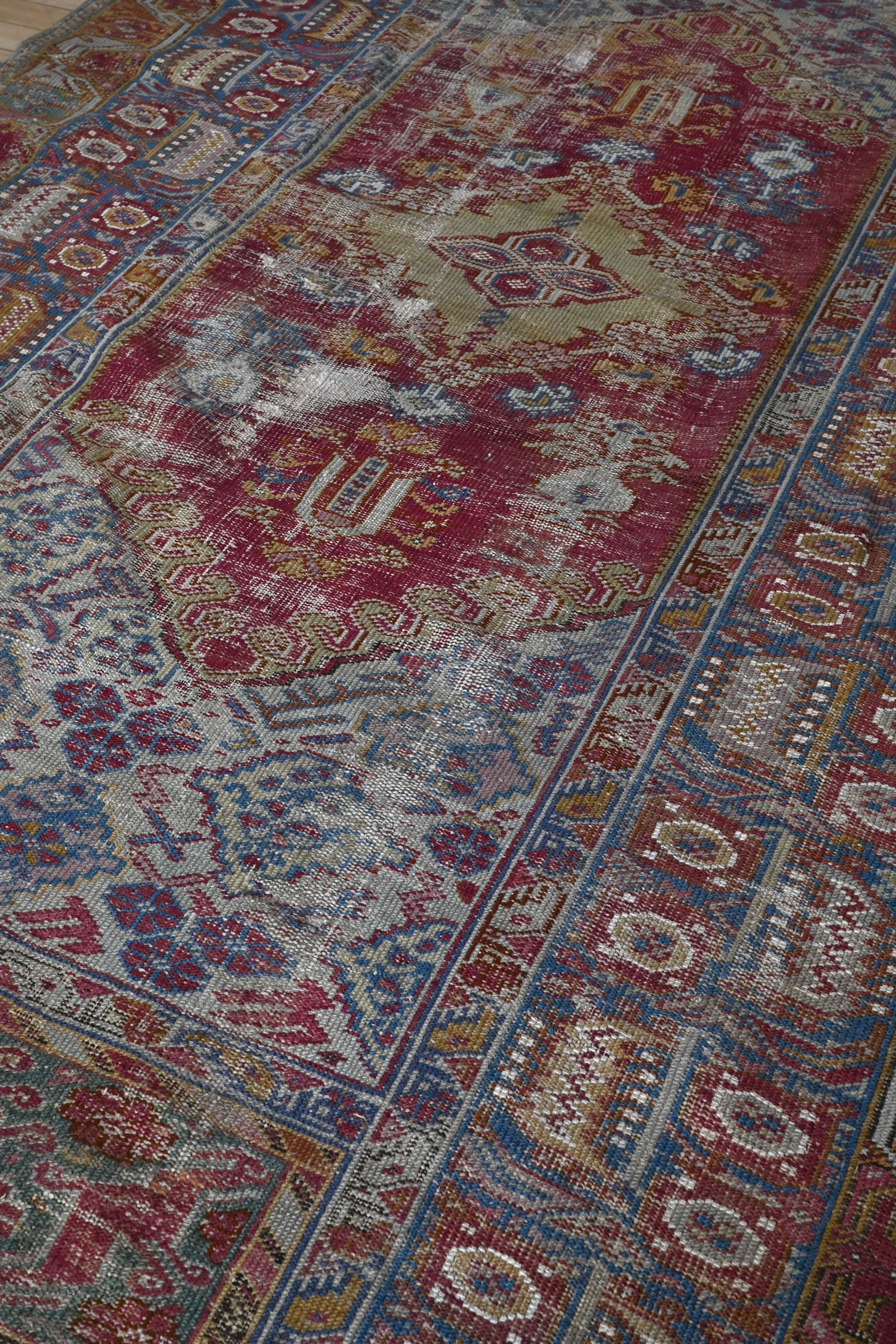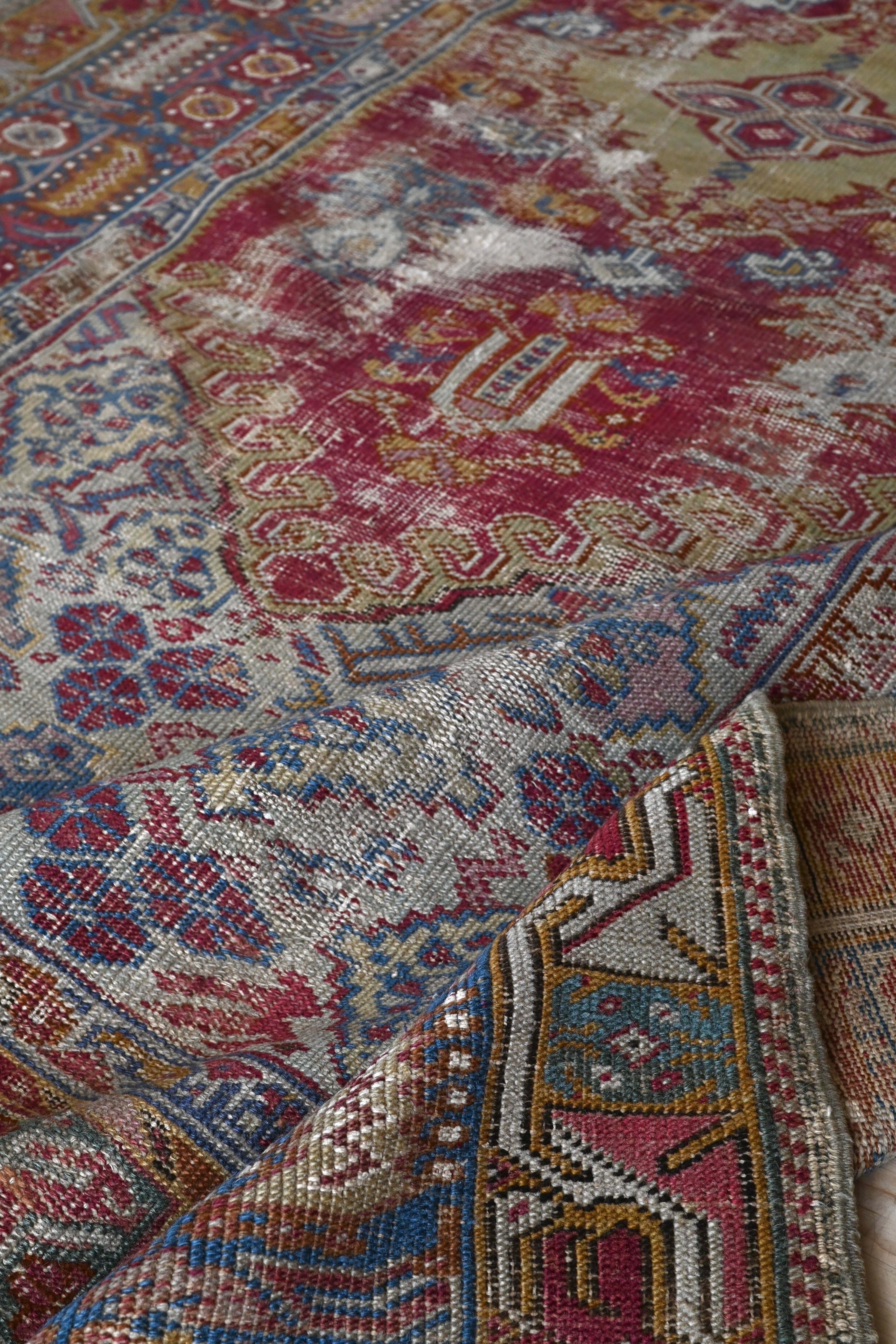 Turkish Ghiordes with beautiful natural distressing and tones of plum, jade, mint, cranberry, indigo and saffron