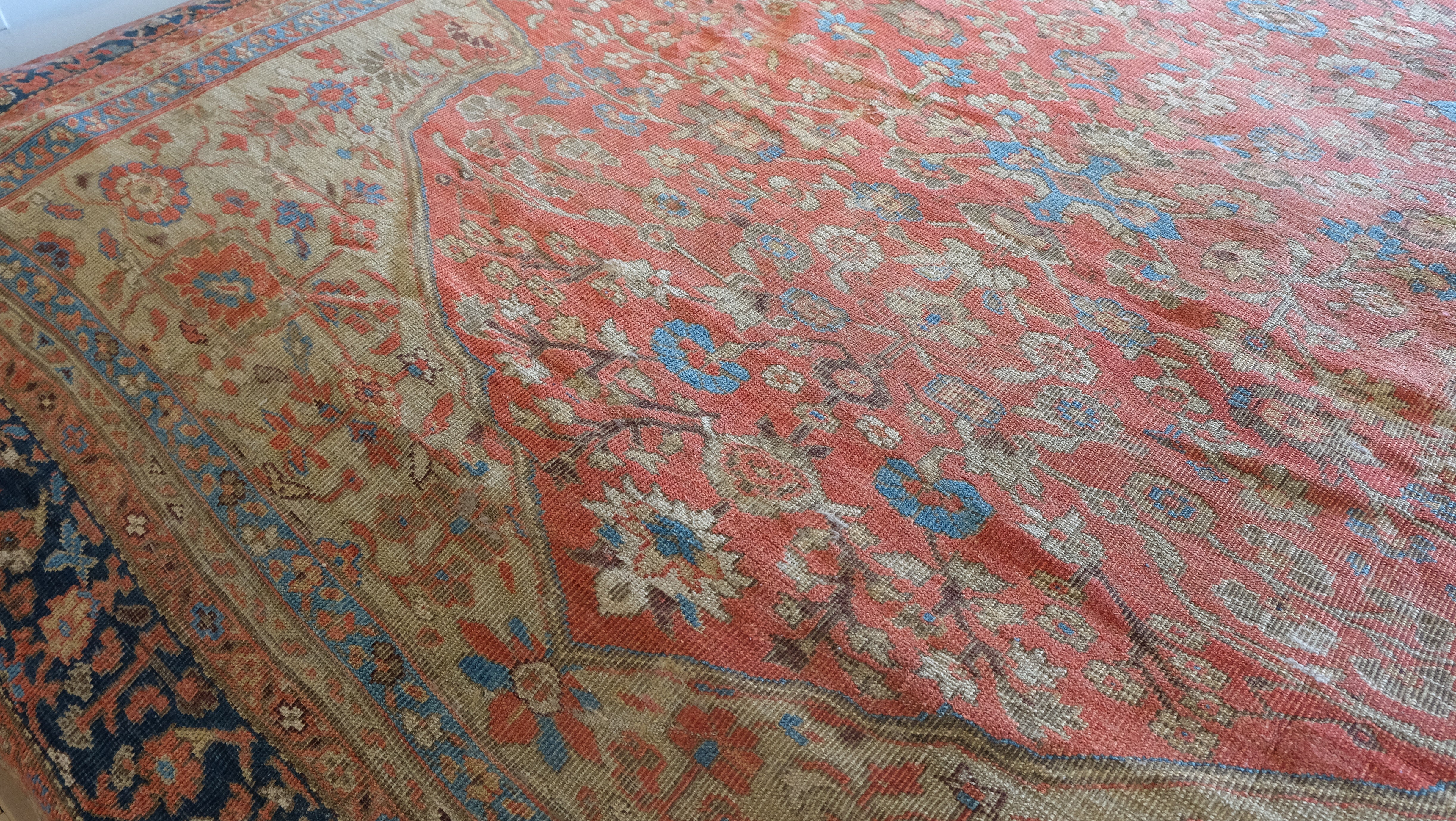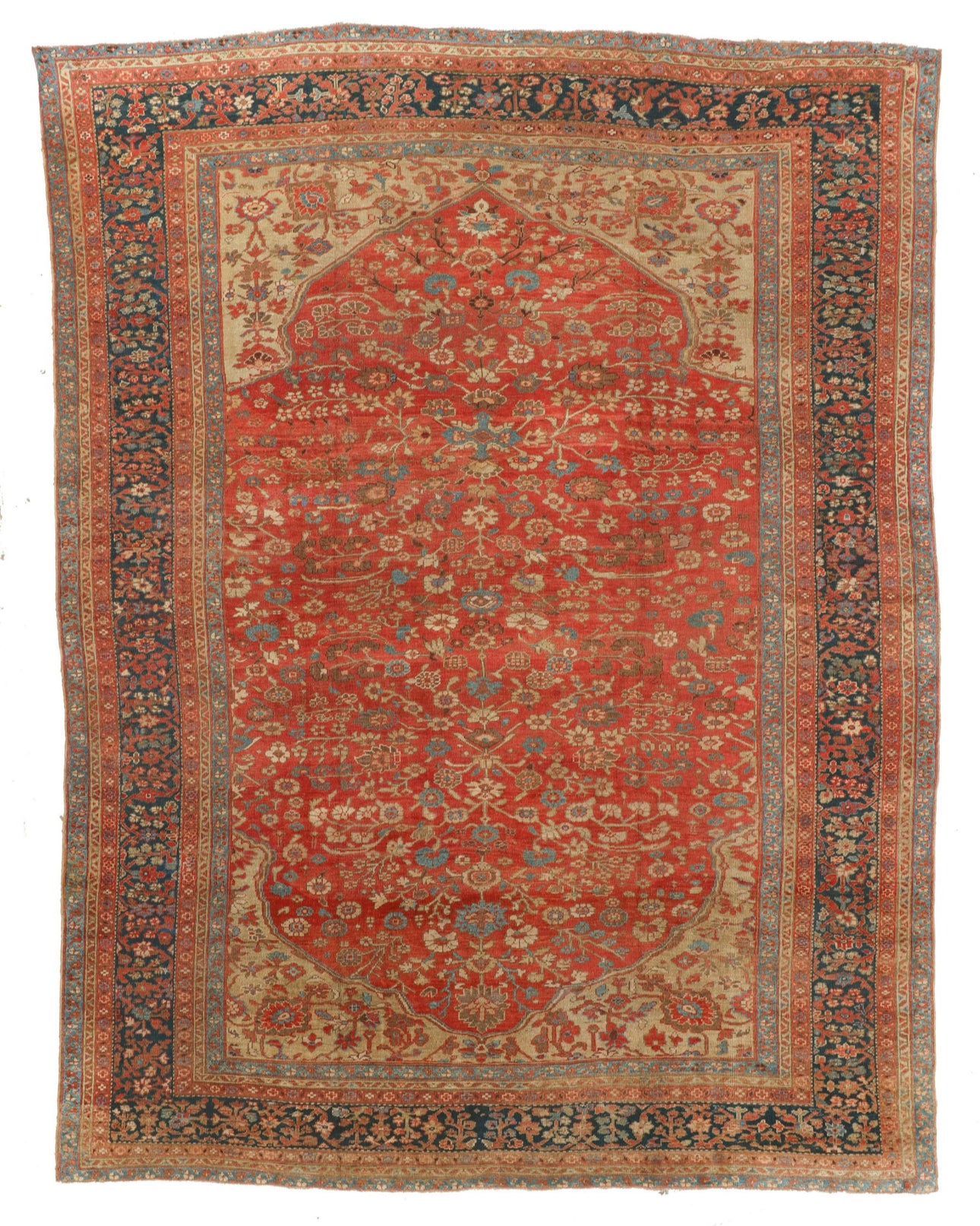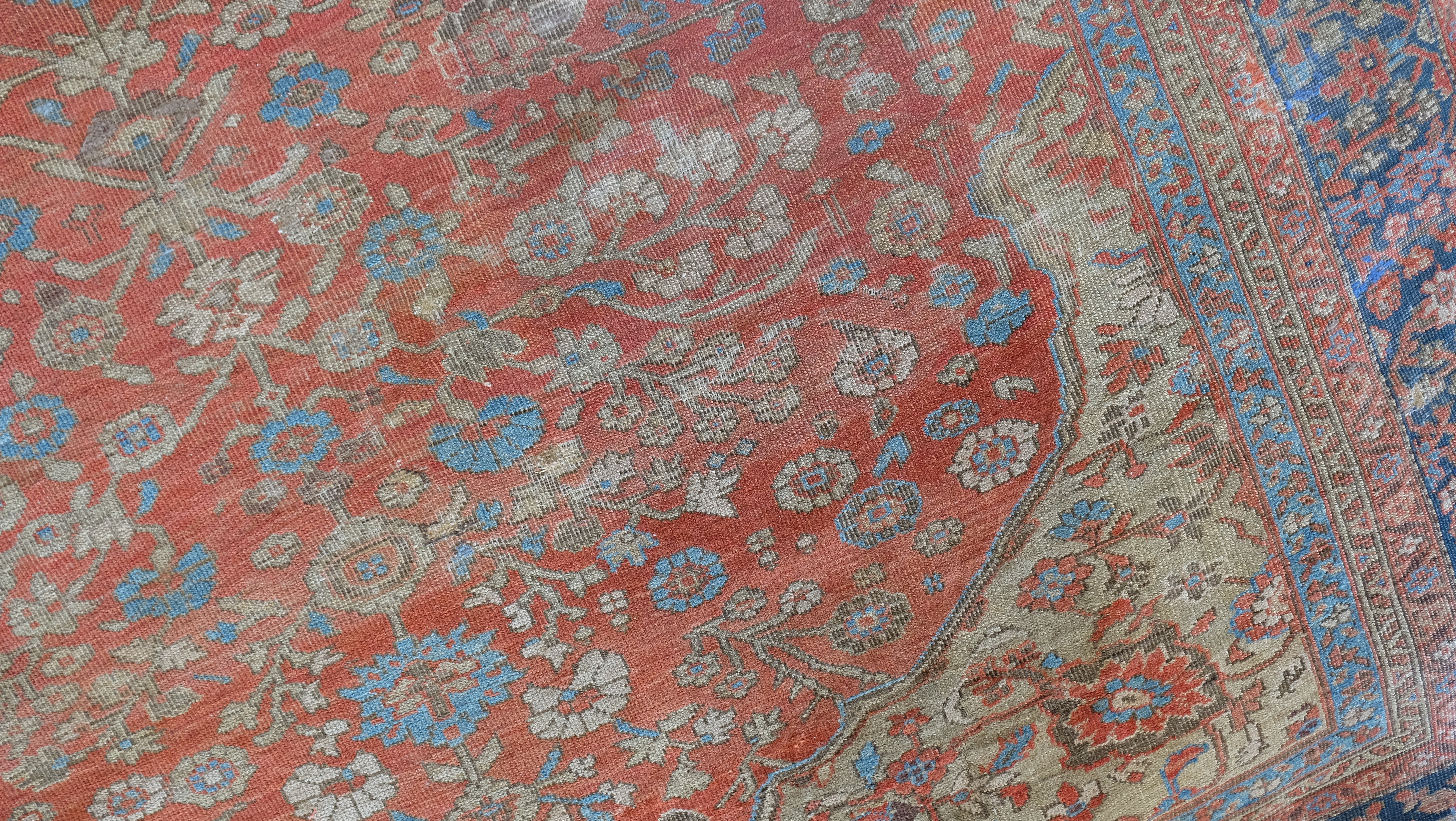 Late 19th Century Sultanabad with a cherry red feild and all over floral design in wheat, cornflower blue, taupe and navy.