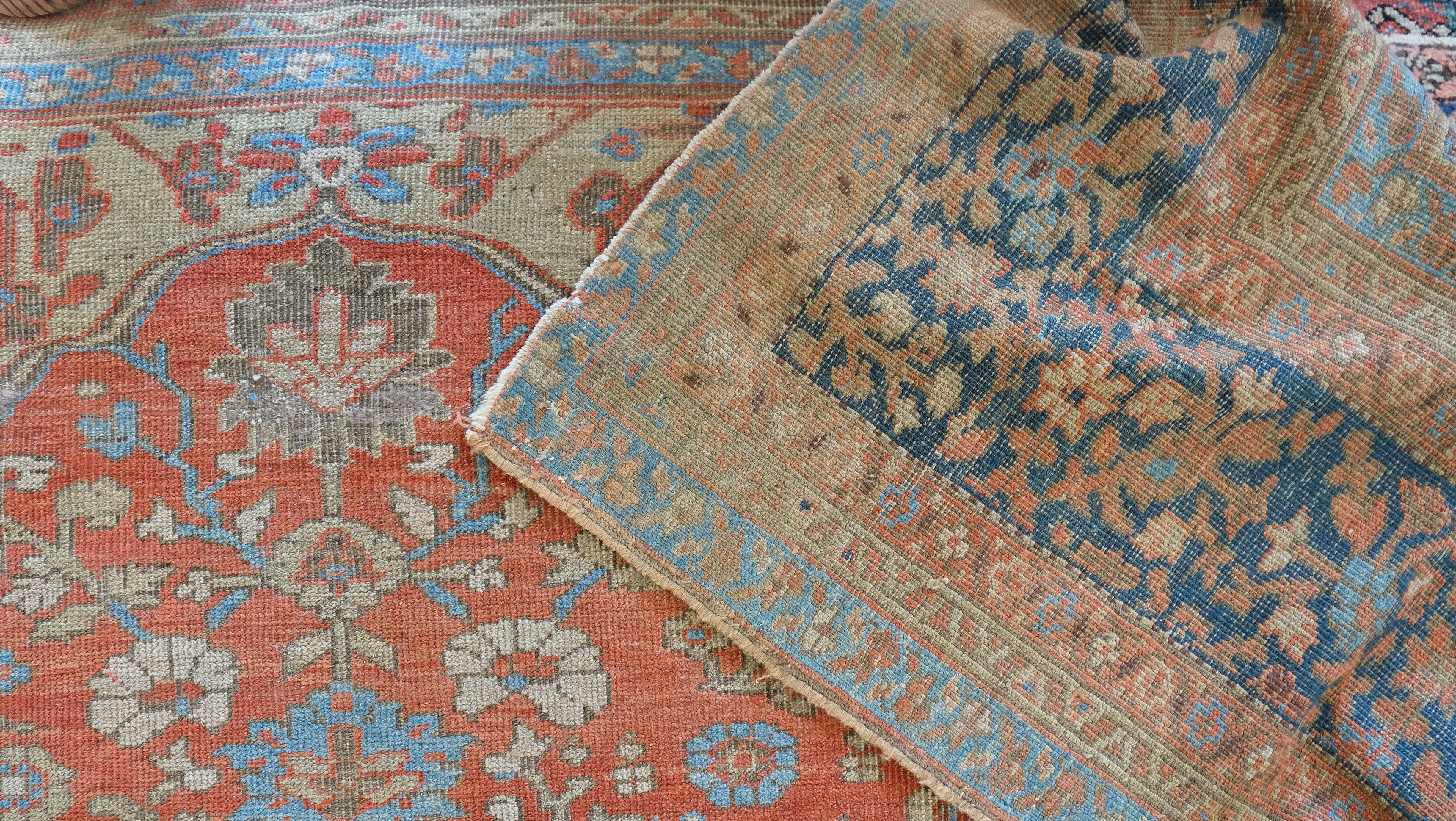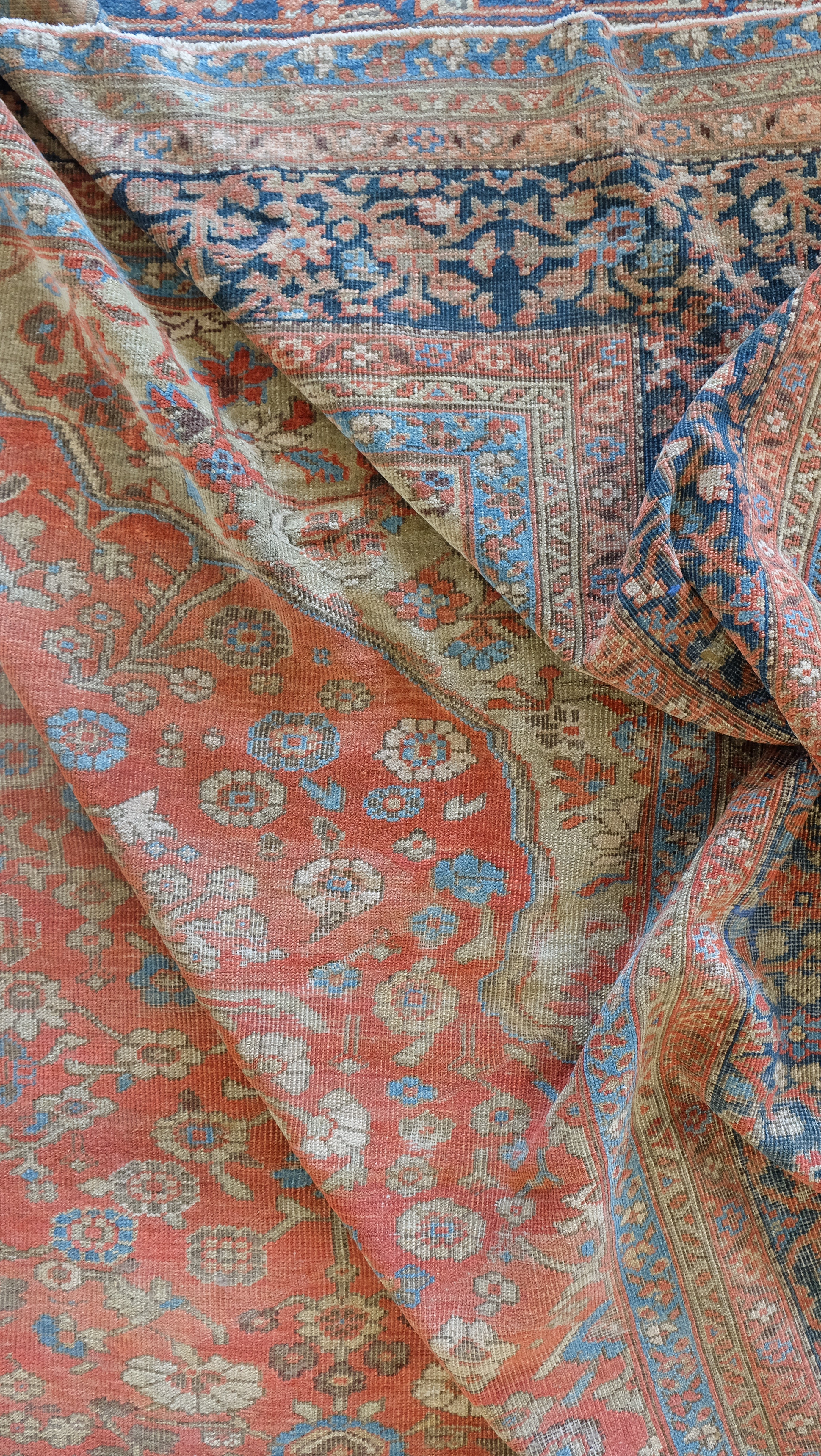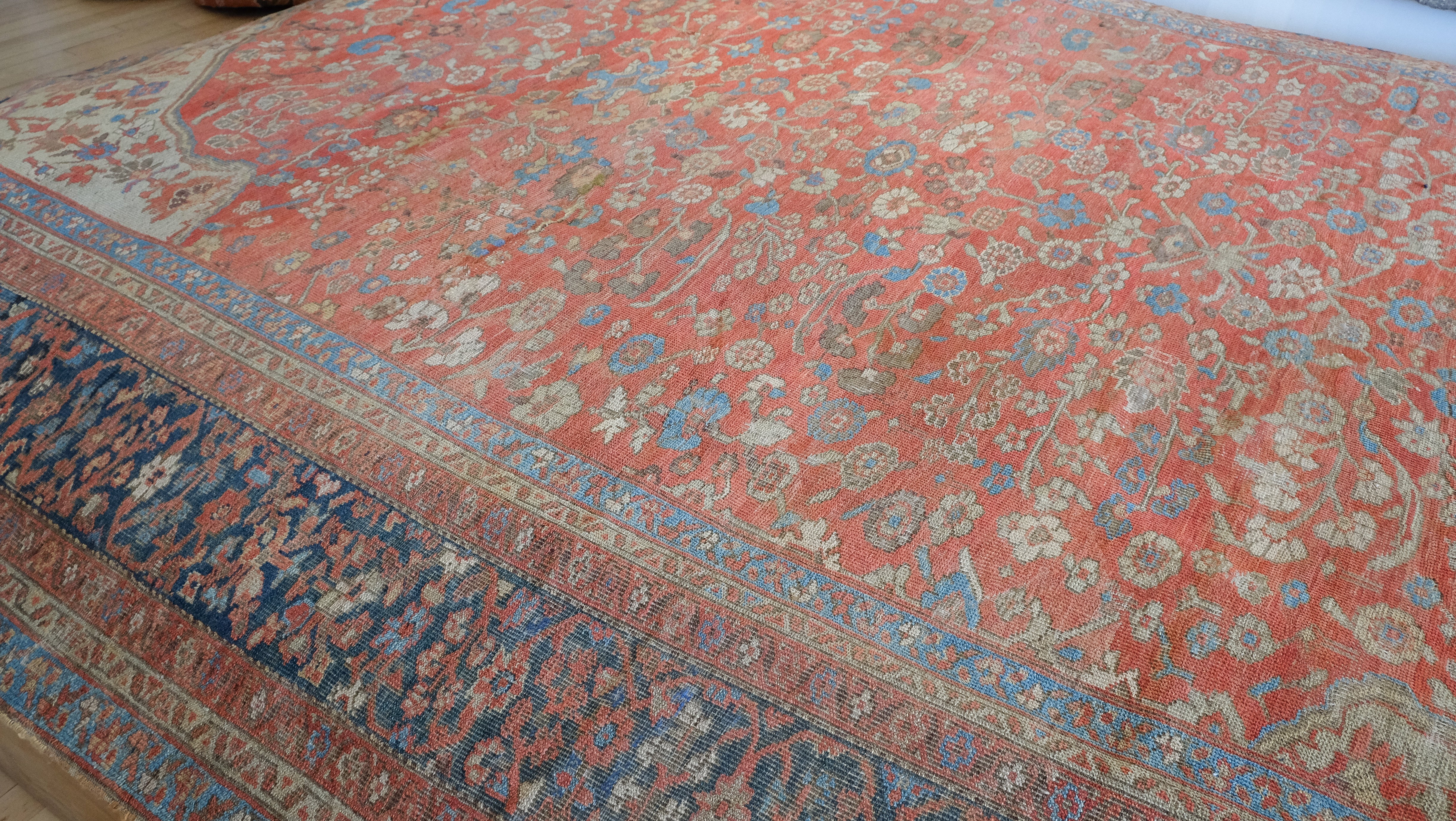 Late 19th Century Sultanabad with a cherry red feild and all over floral design in wheat, cornflower blue, taupe and navy.