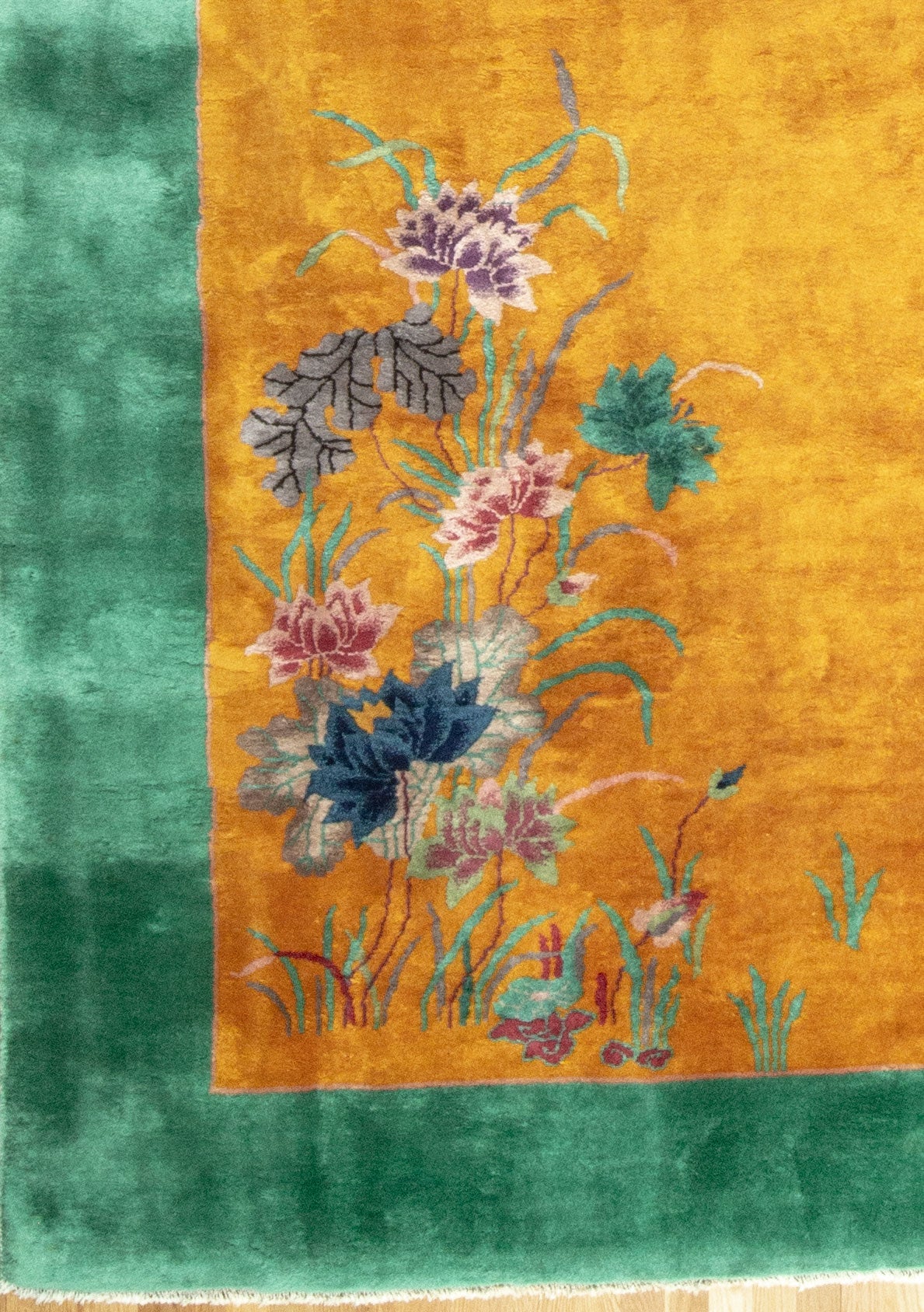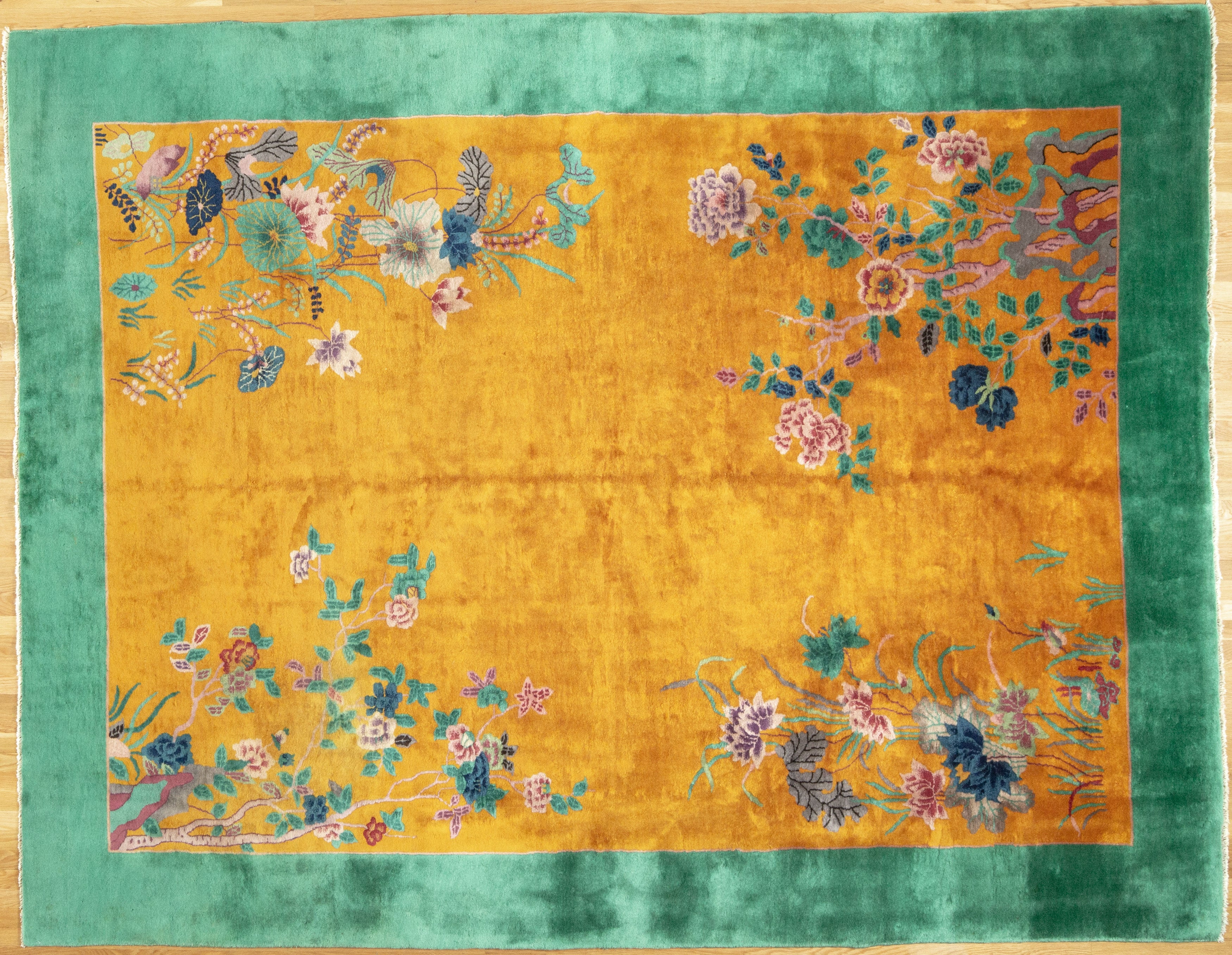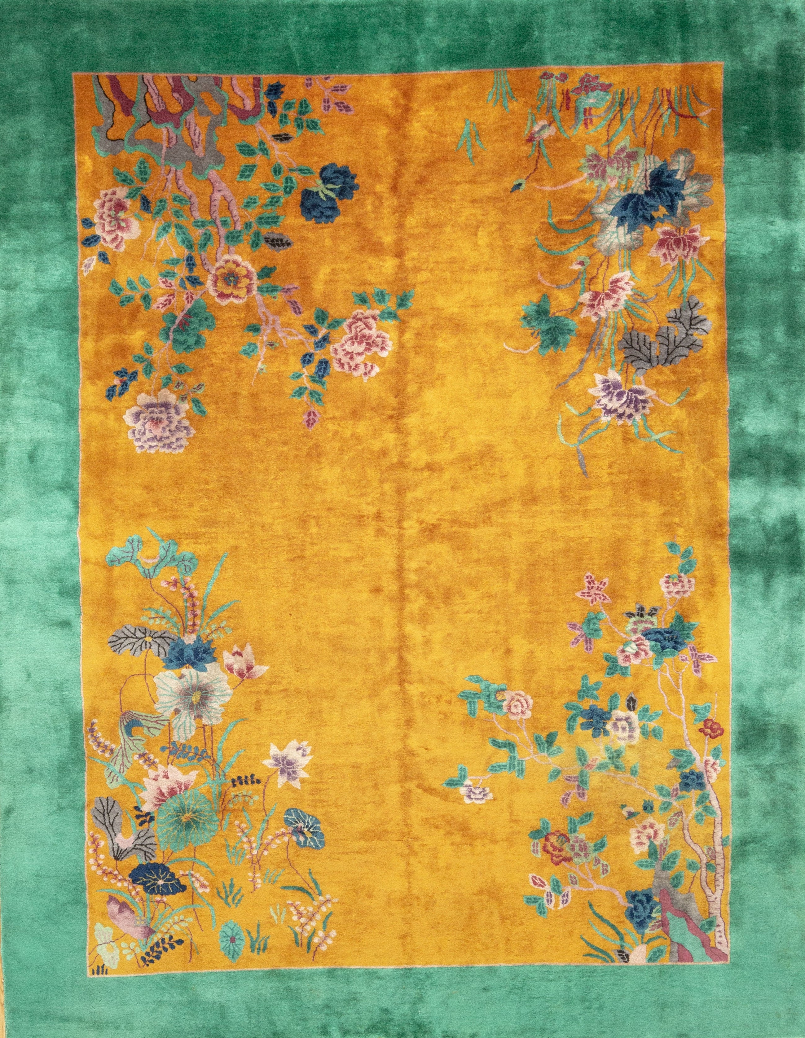 an Art Deco Chinese with a bright vibrant palette of ochre and emerald green with hints of navy, plum and ivory