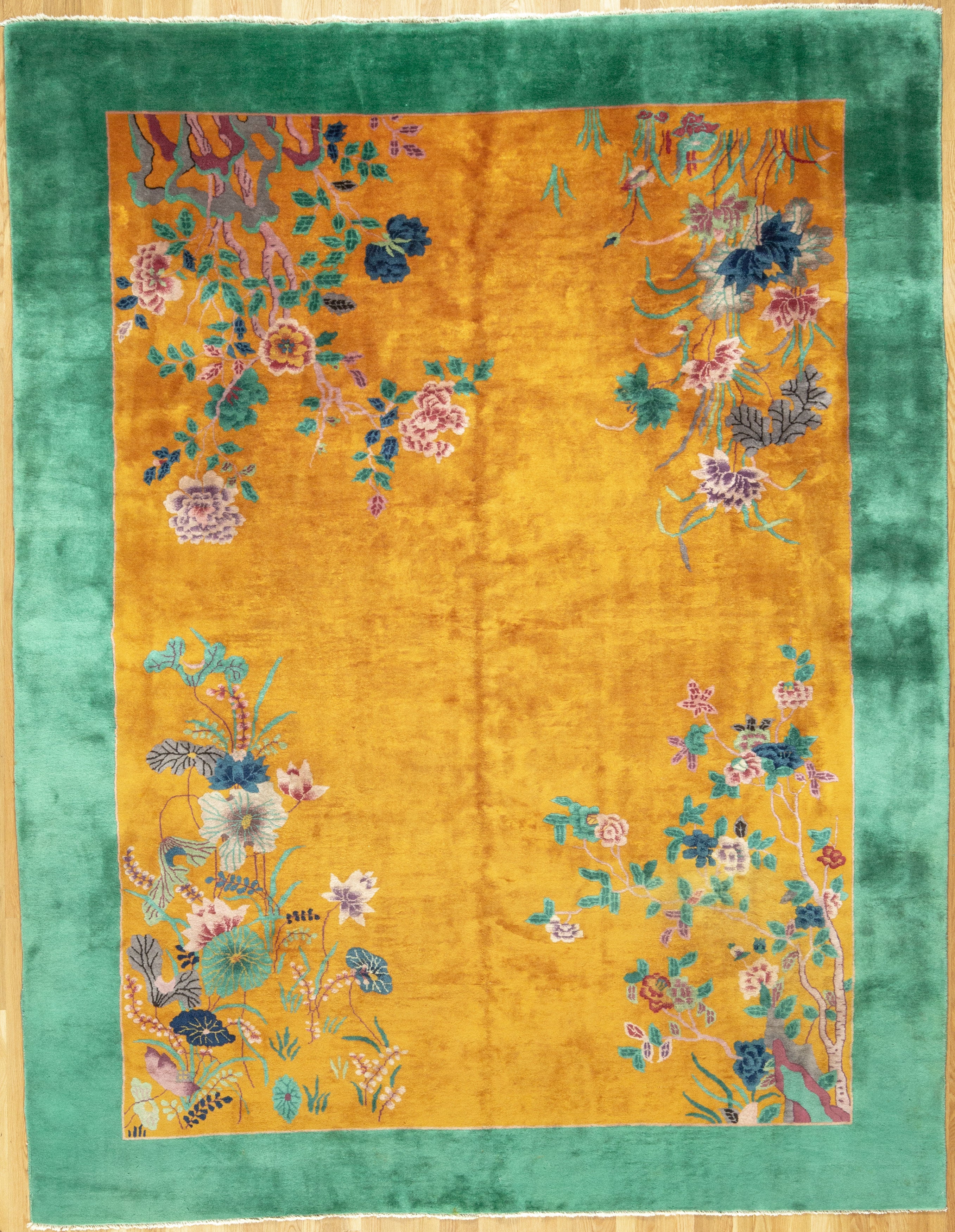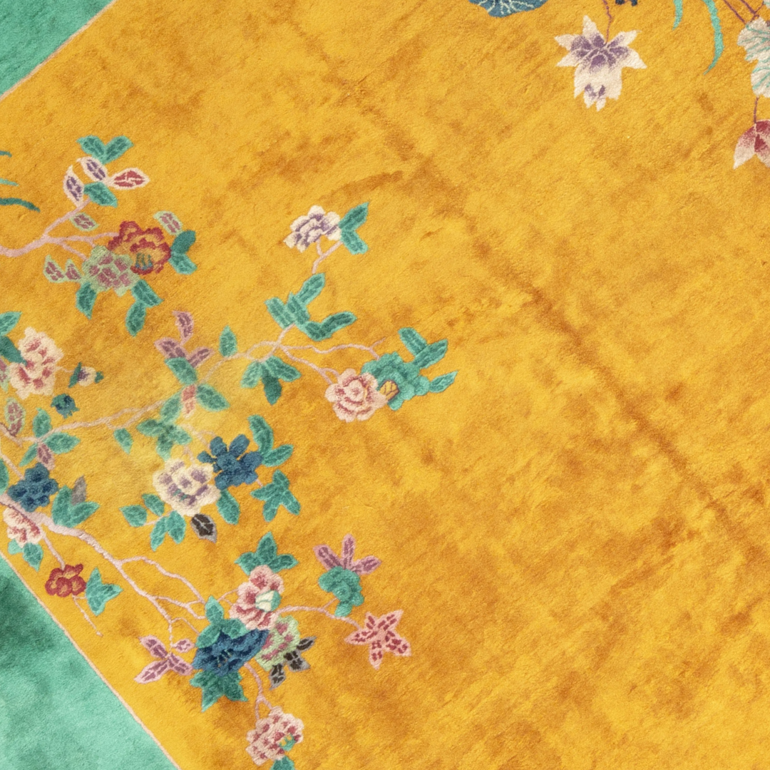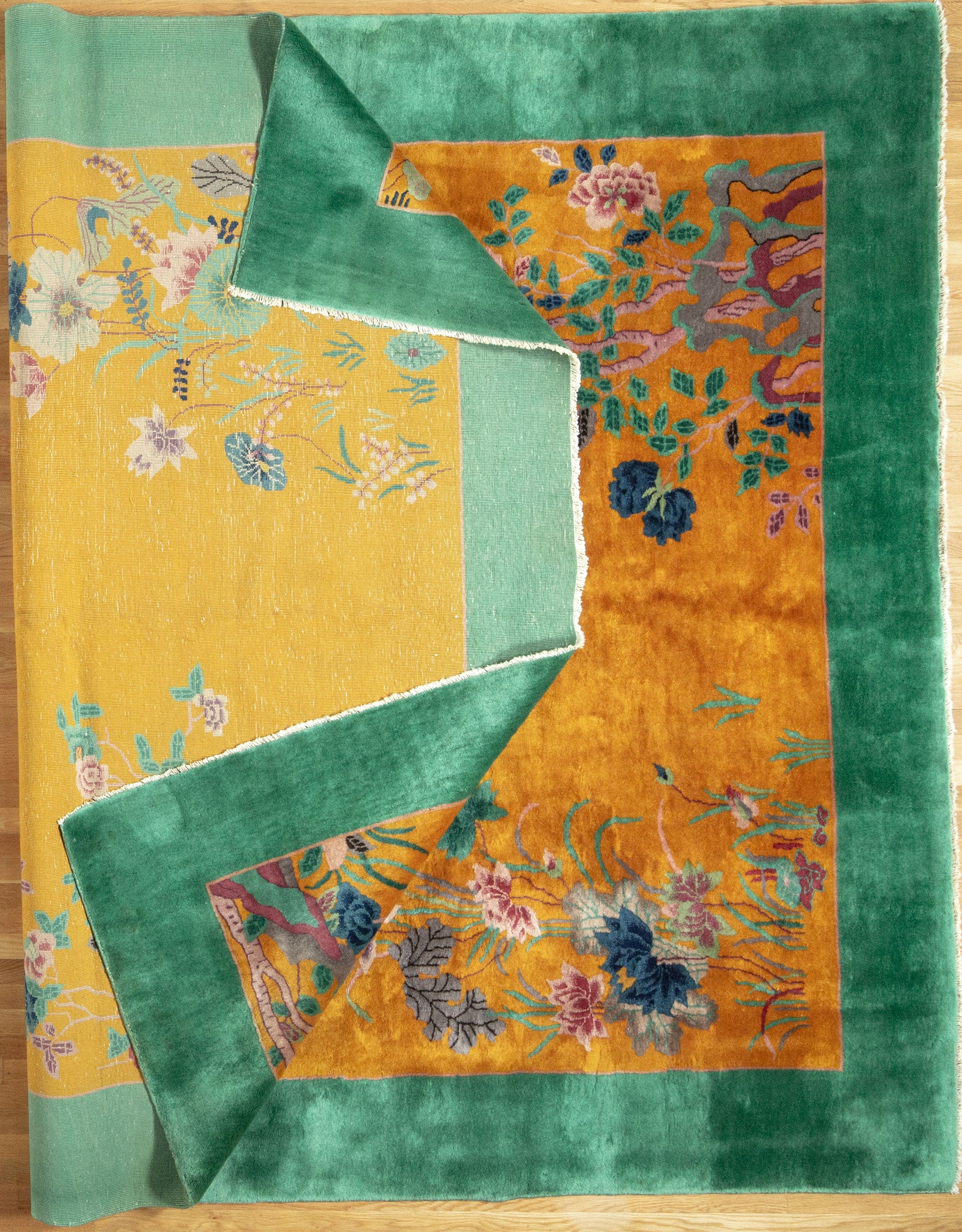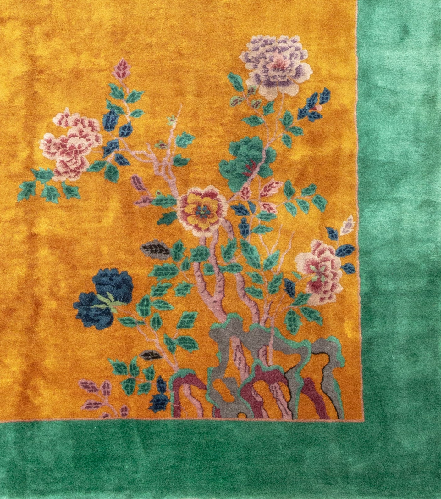 an Art Deco Chinese with a bright vibrant palette of ochre and emerald green with hints of navy, plum and ivory