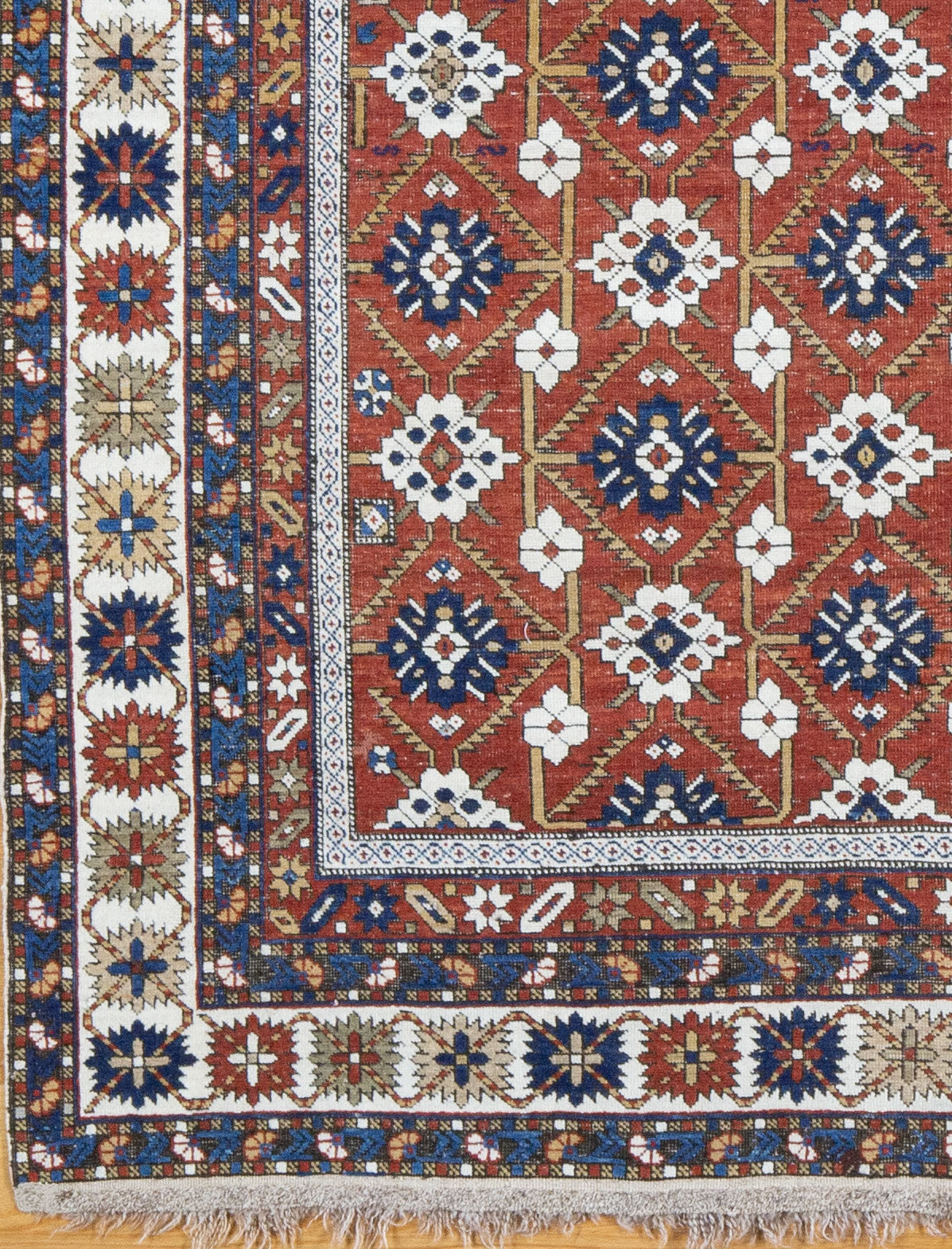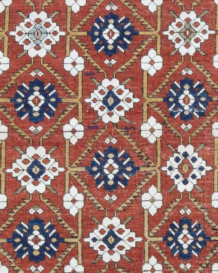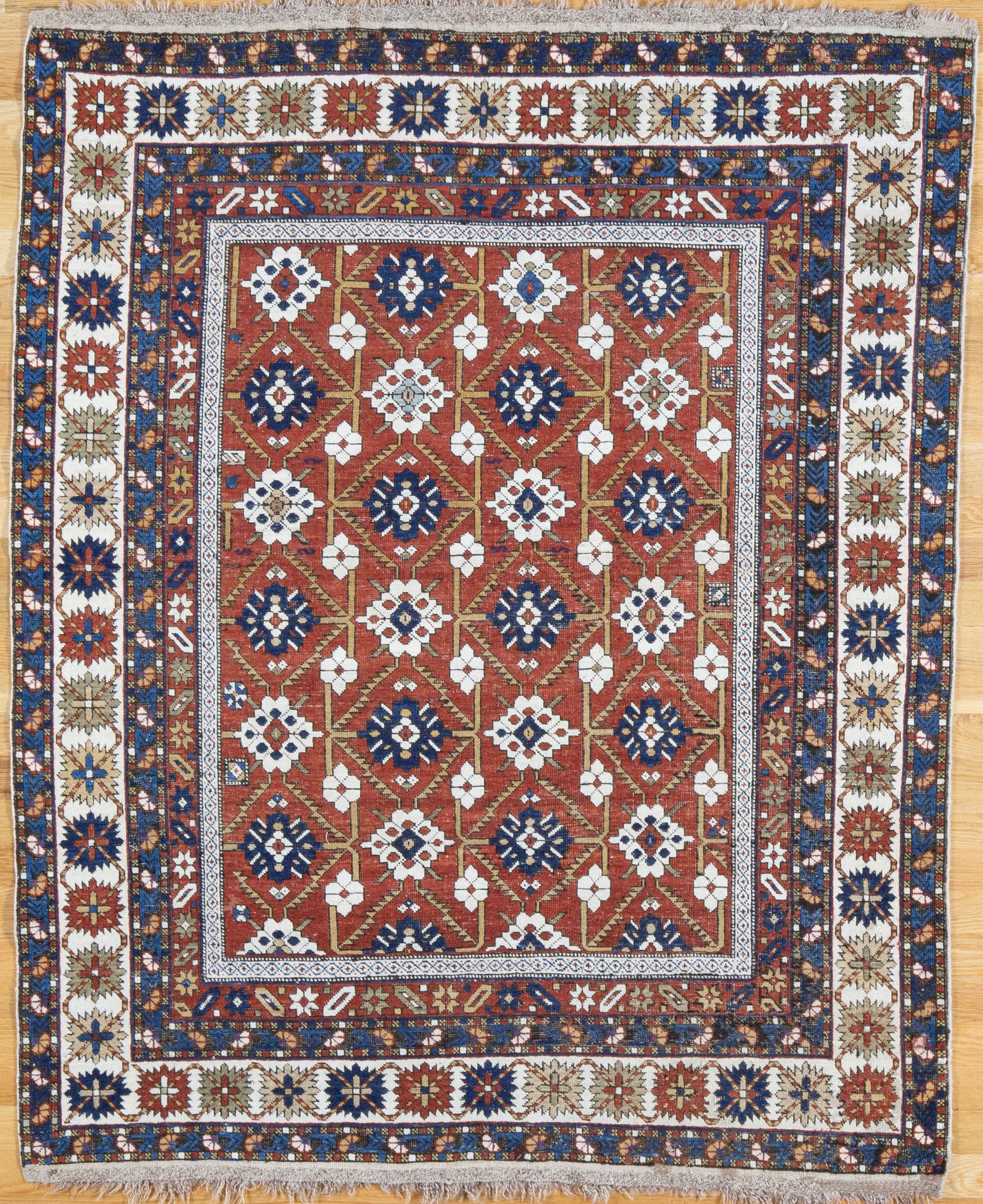 Turn on the century Shirvan Kazak with a rust brown field an allover design in navy, ivory, jade green and camel.