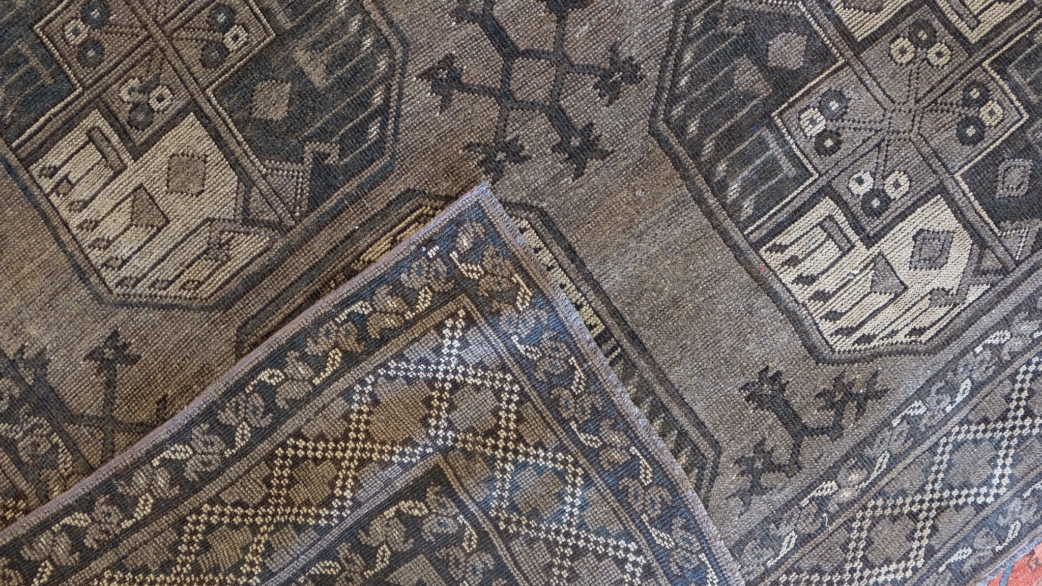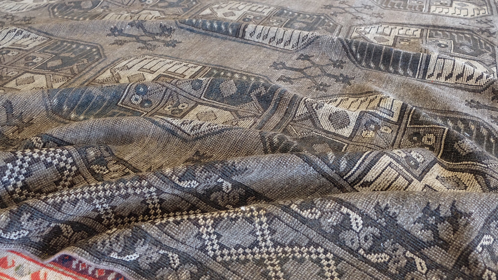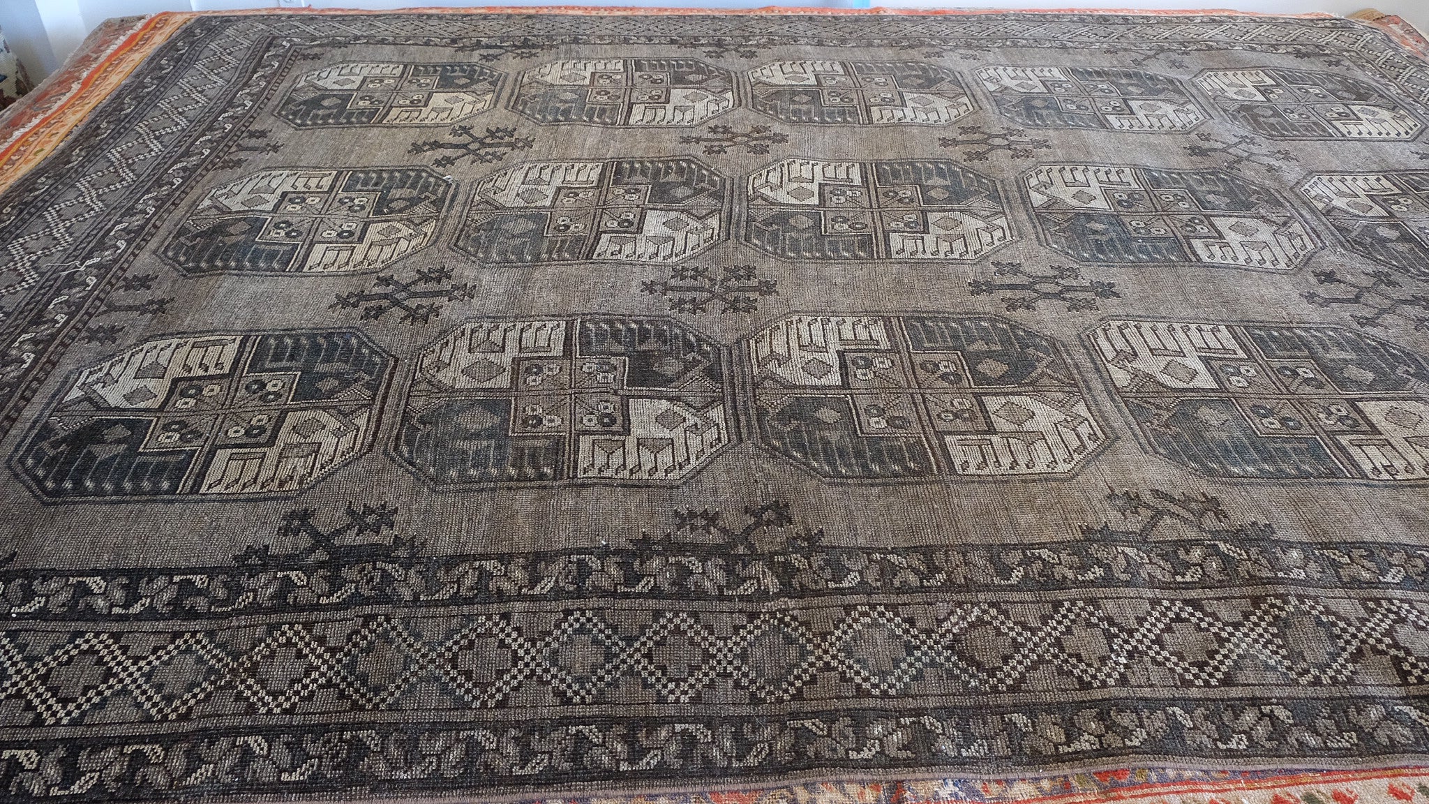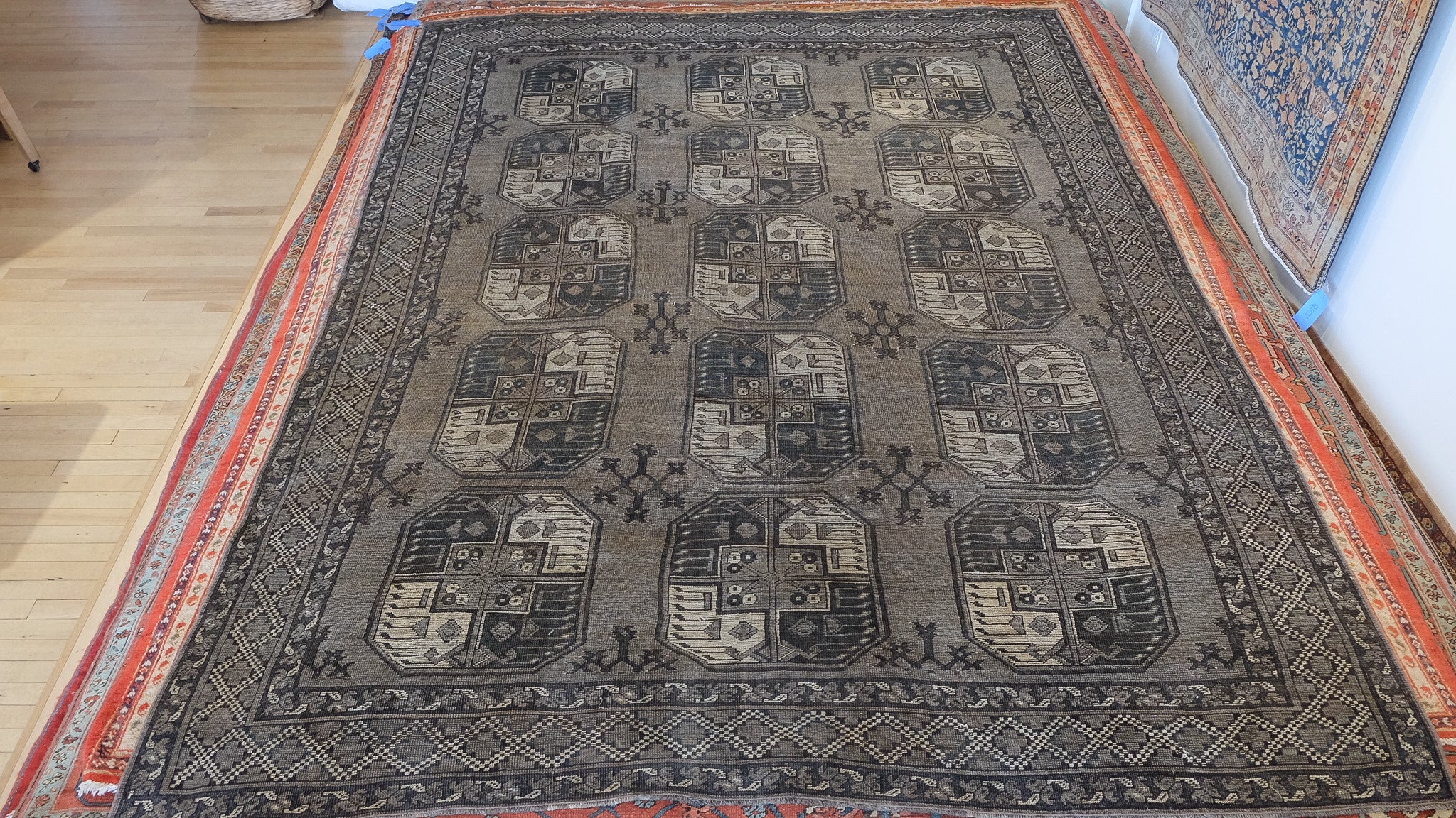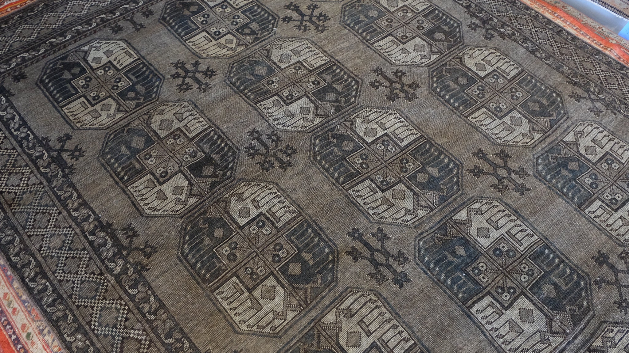 Ersari rug with a gray field with an allover design in charcoal and ivory