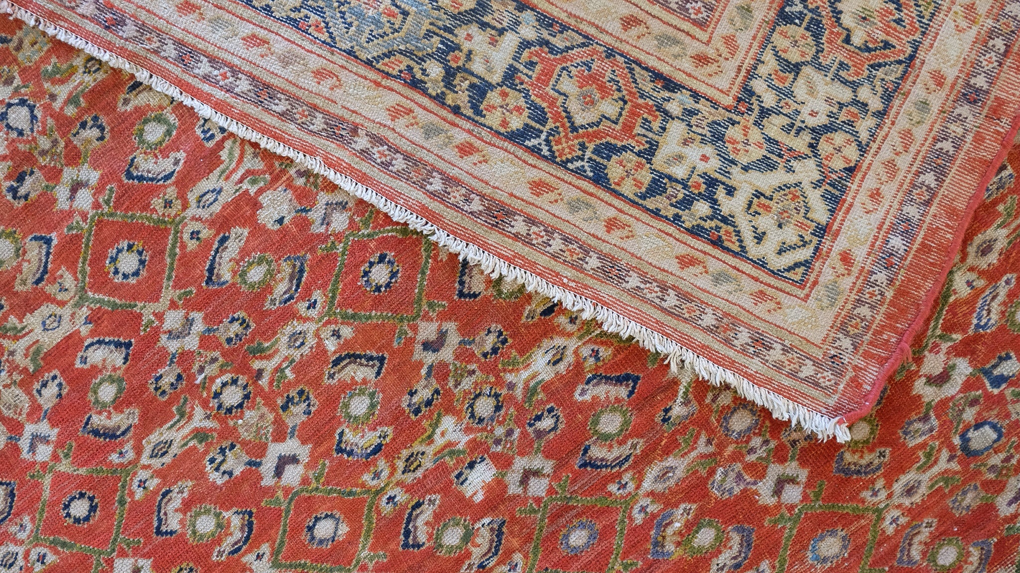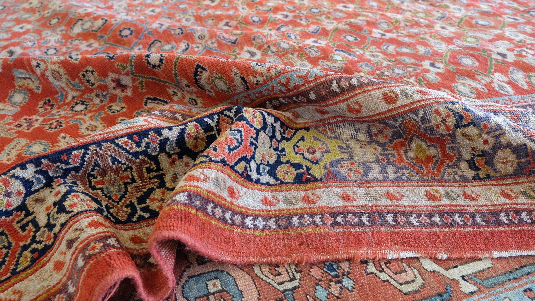 Late 19th century Sultanabad with a watermelon red field and all over design with deep navy, ivory and chartreuse.