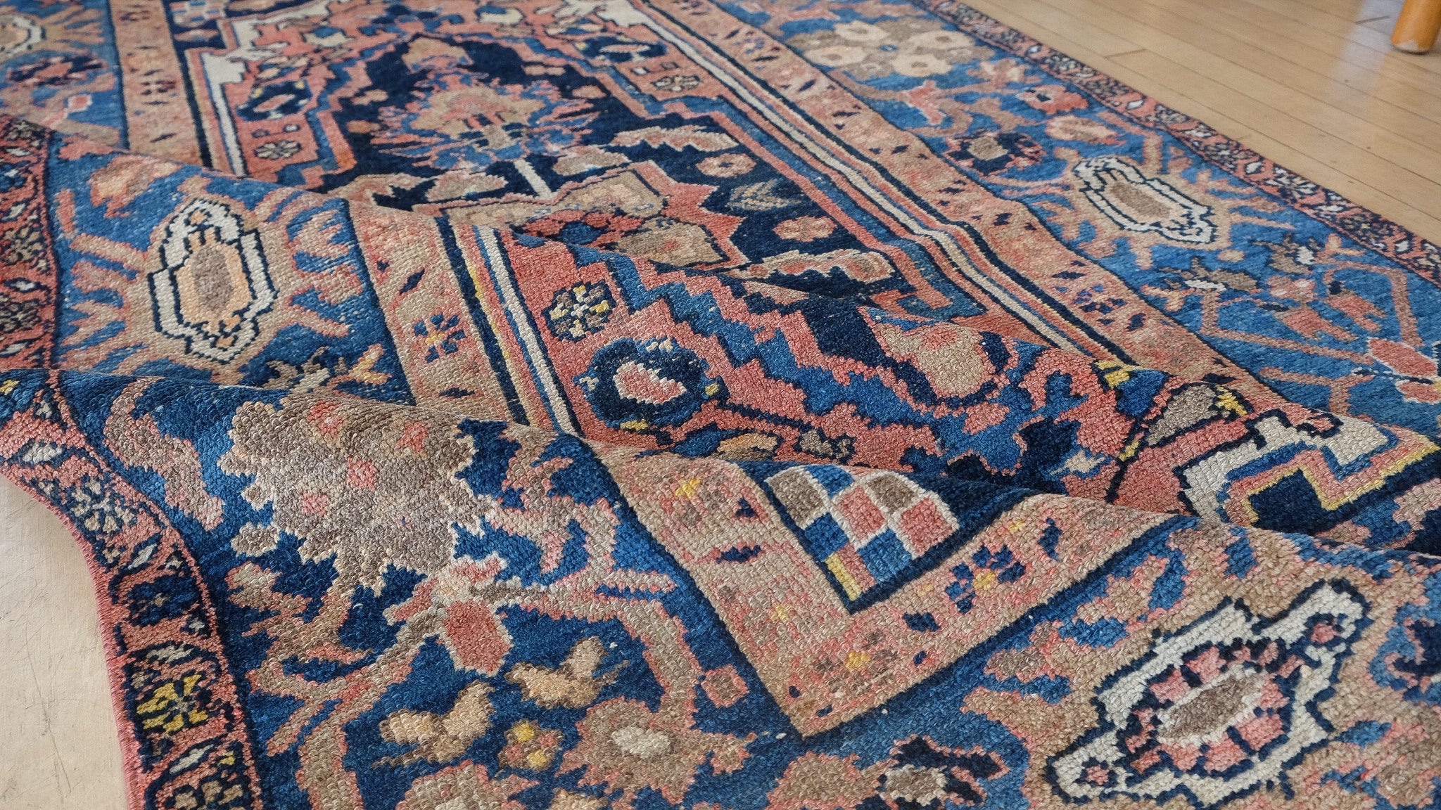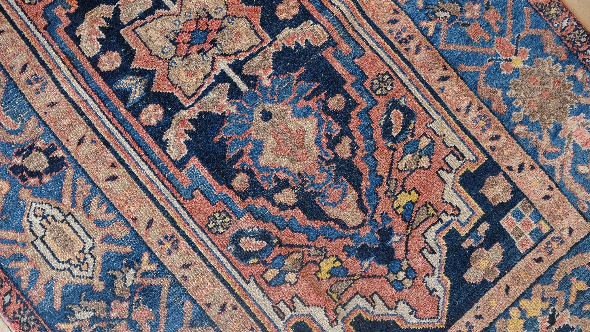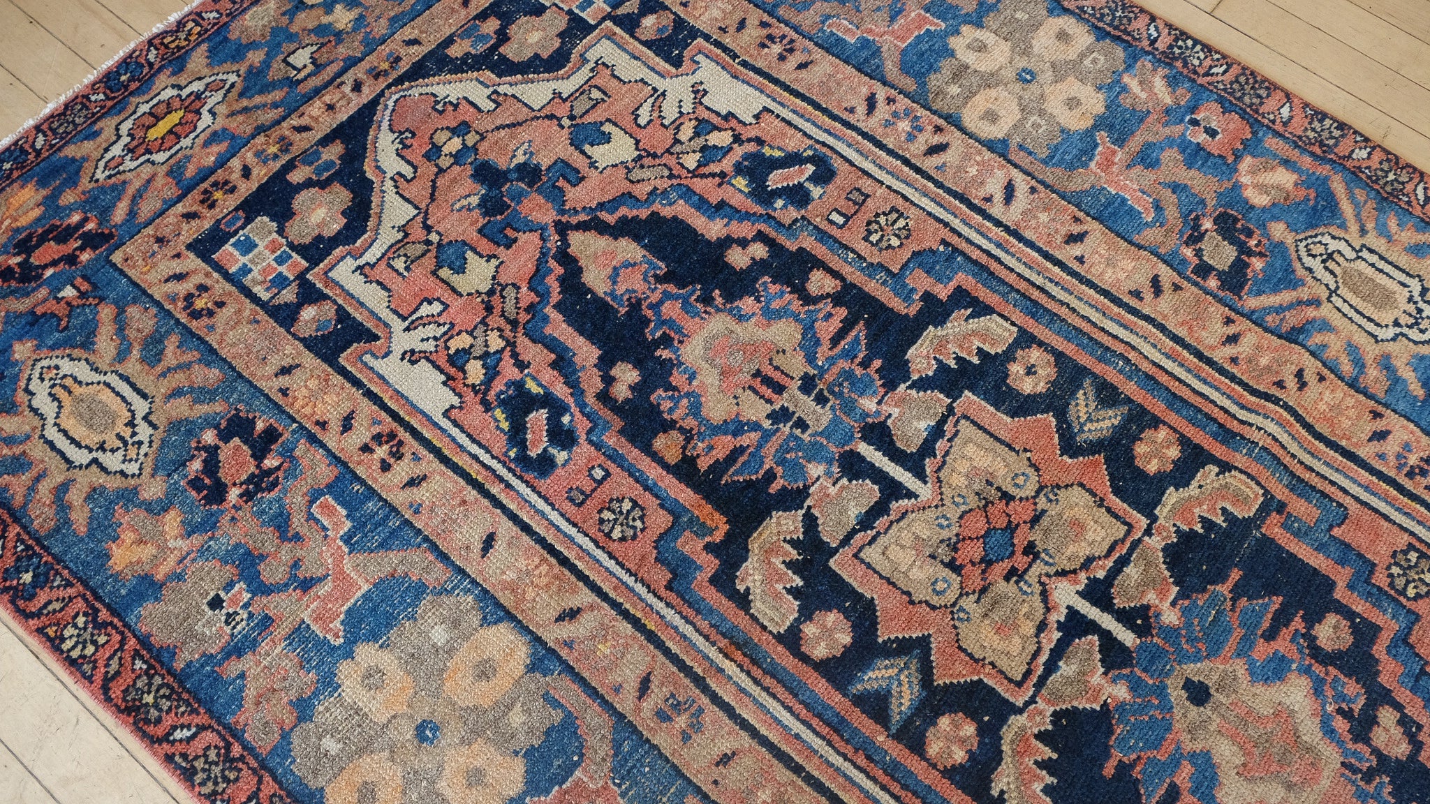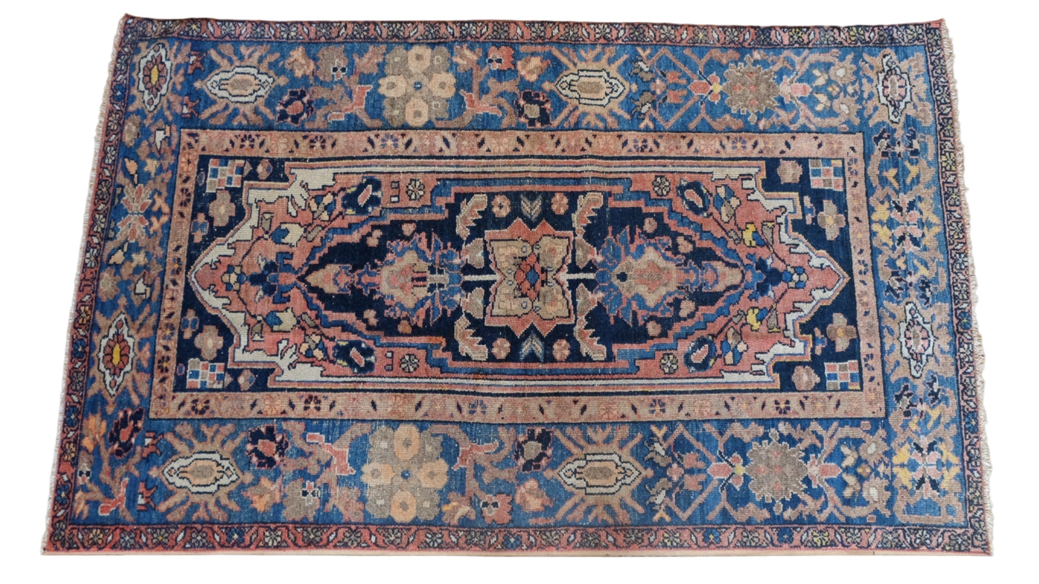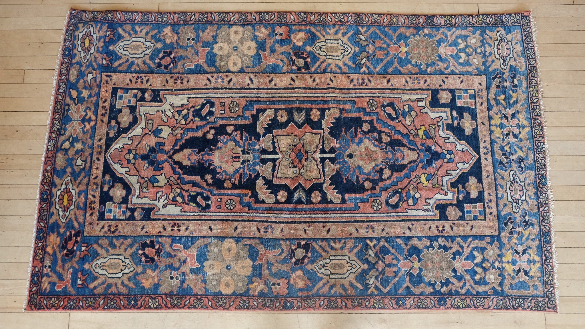 a fine Hamadan with shades of blush, coral, bright yellow, cornflower blue, deep navy and ivory