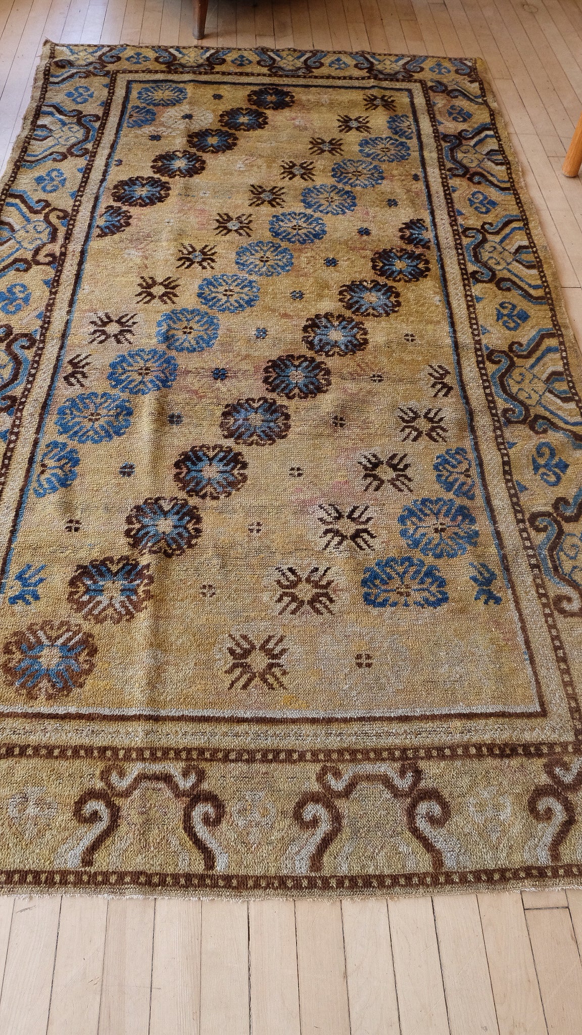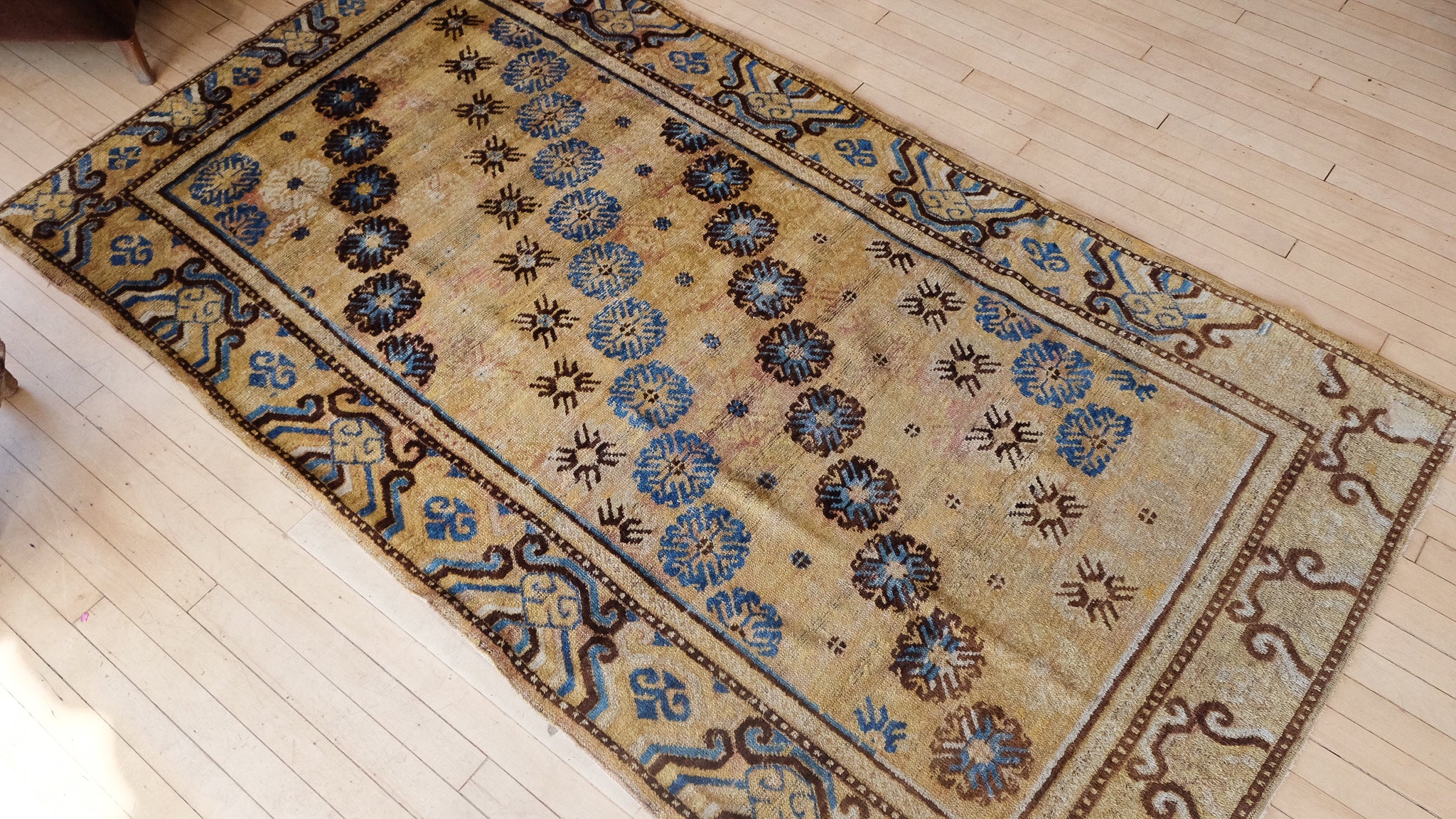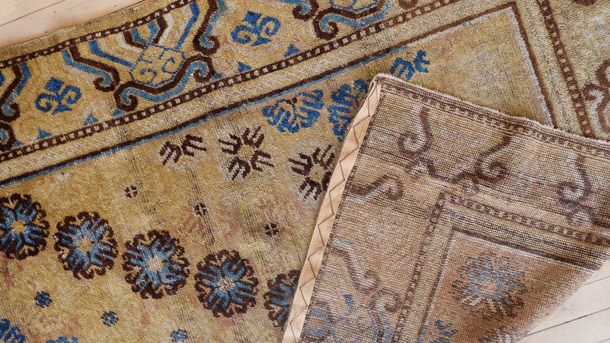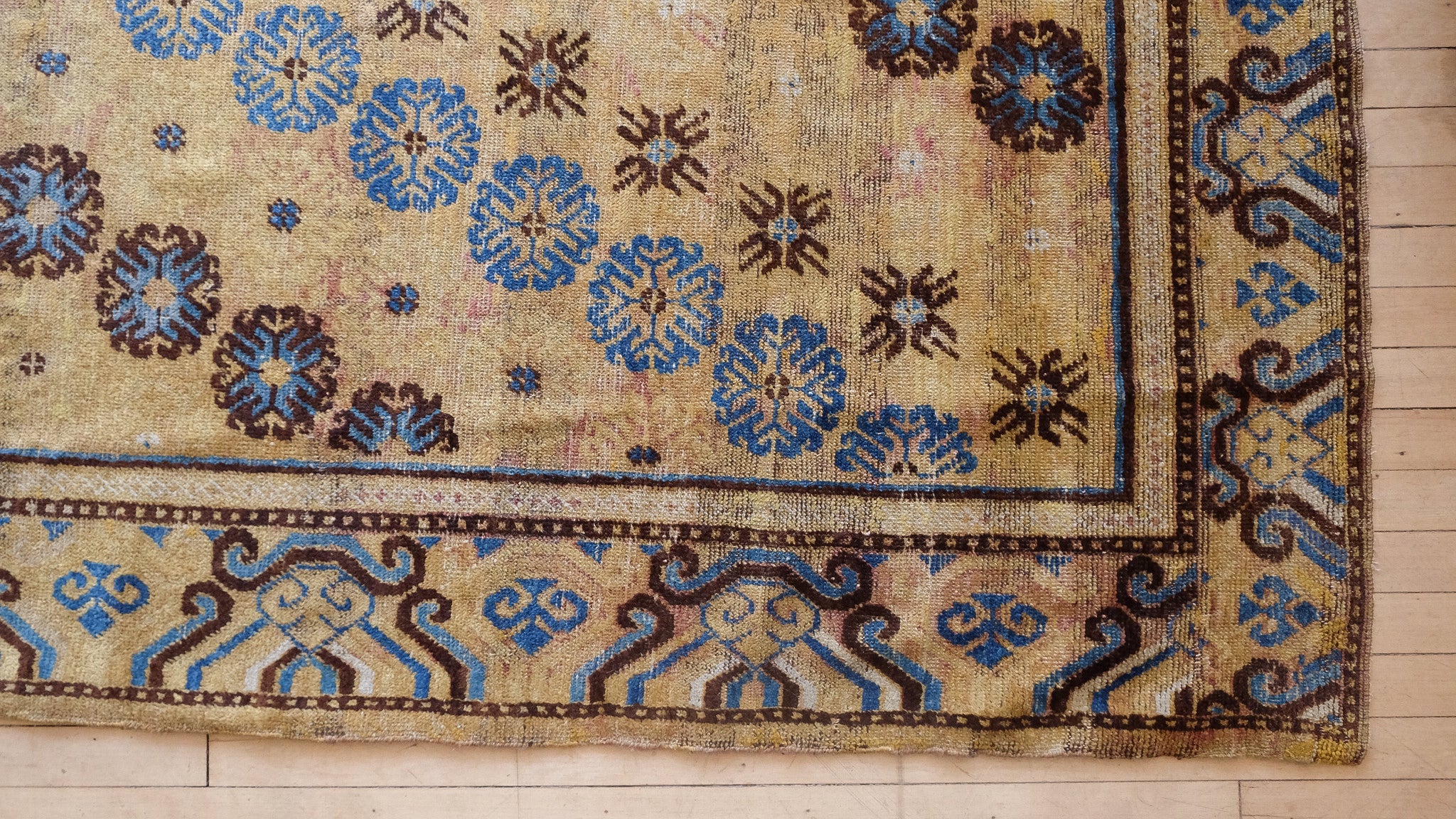 Khotan with varying shades of ochre, cocoa, cornflower blue and hints of lavender