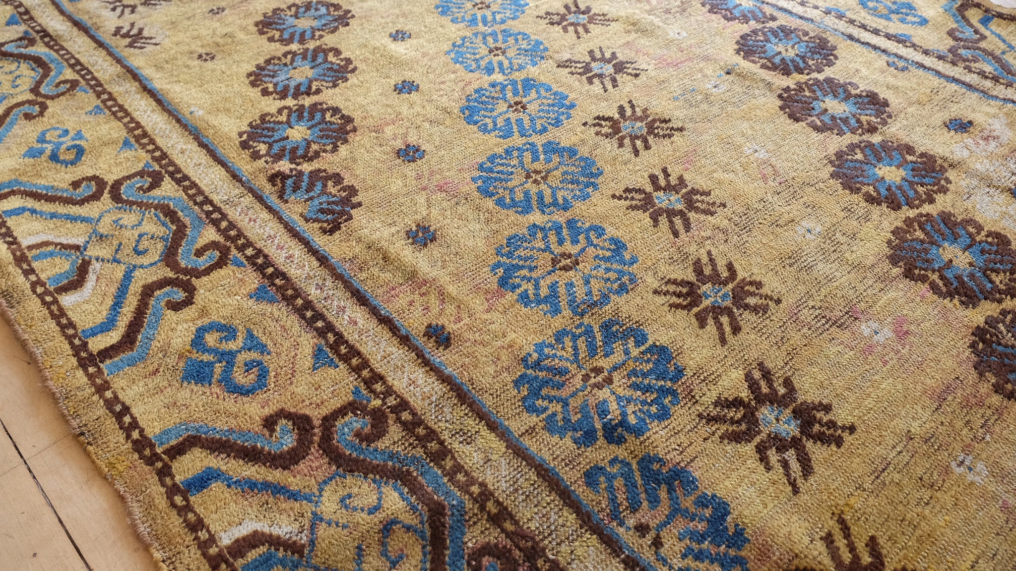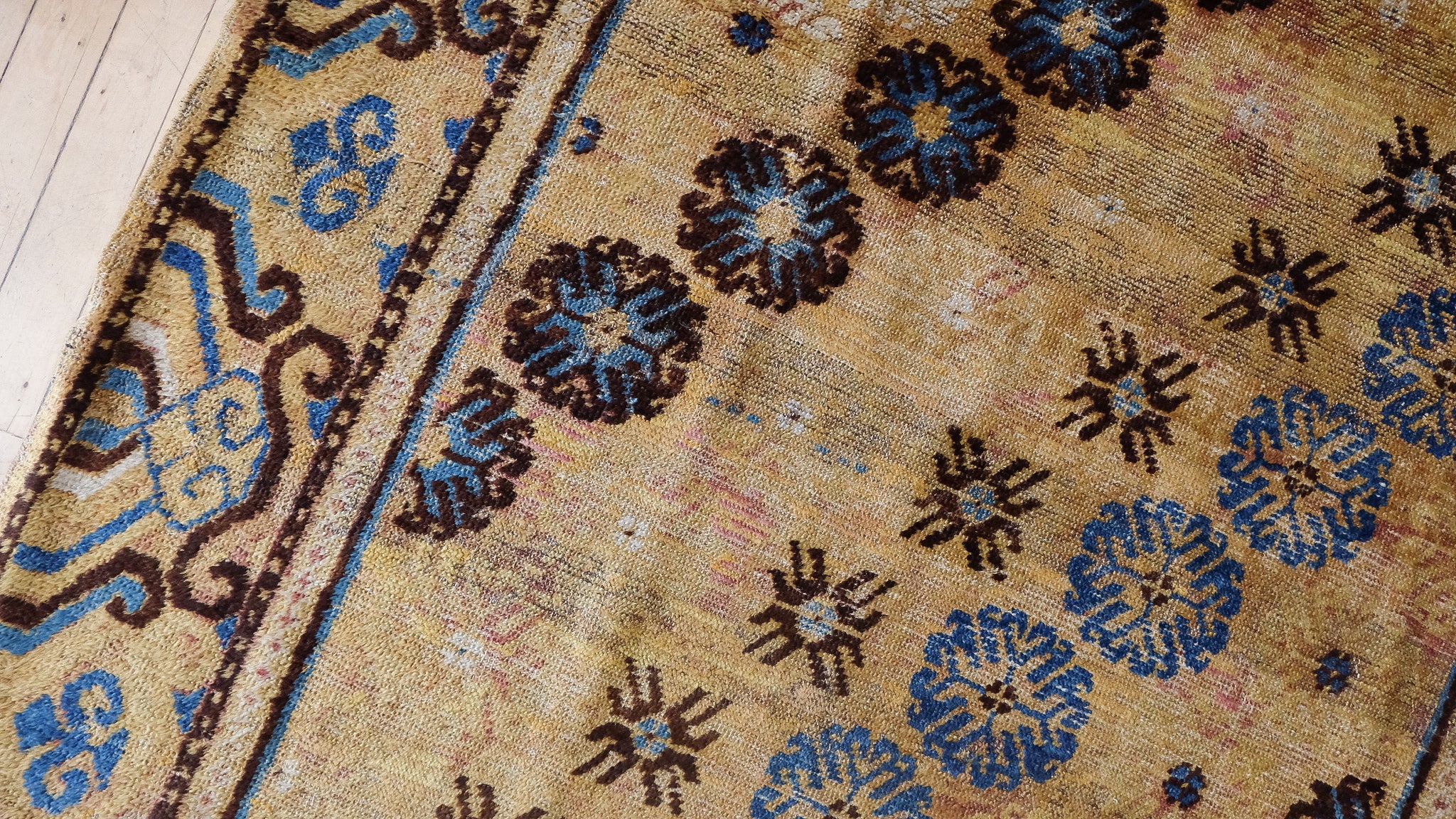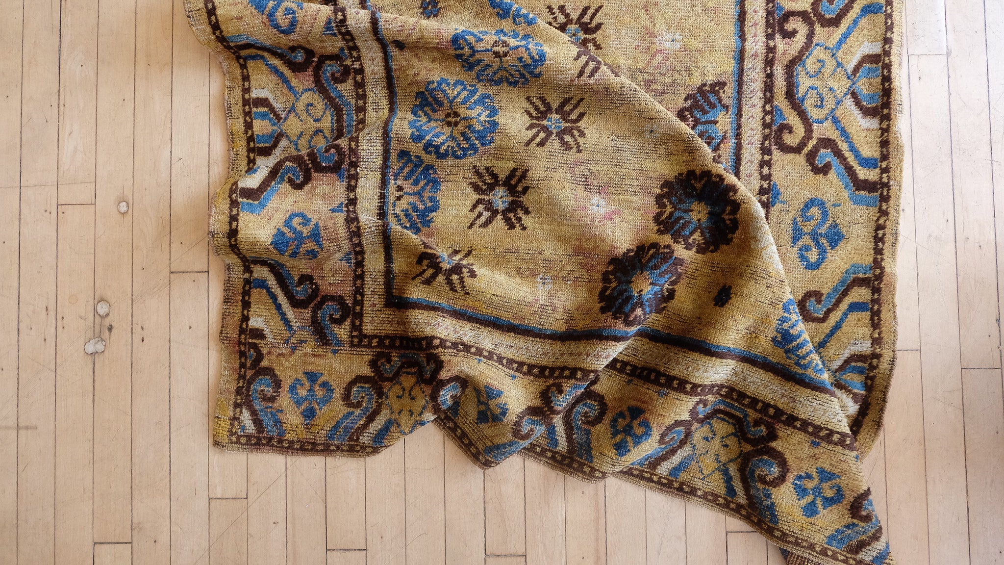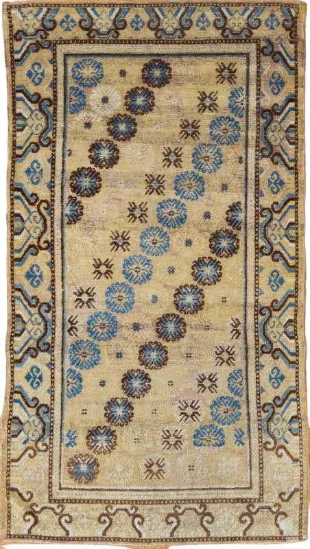 Khotan with varying shades of ochre, cocoa, cornflower blue and hints of lavender