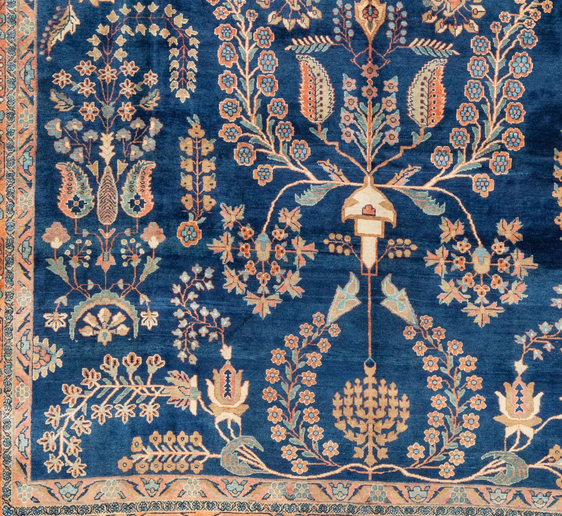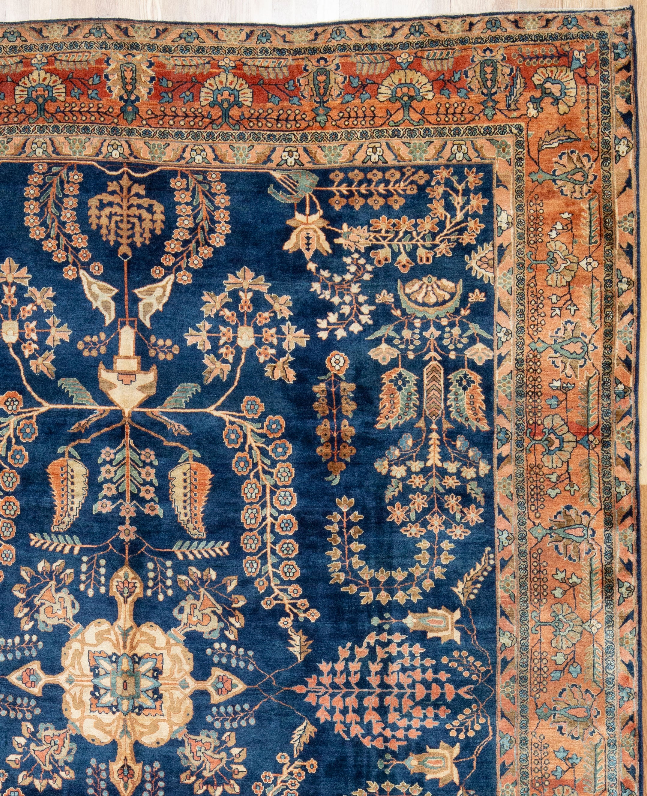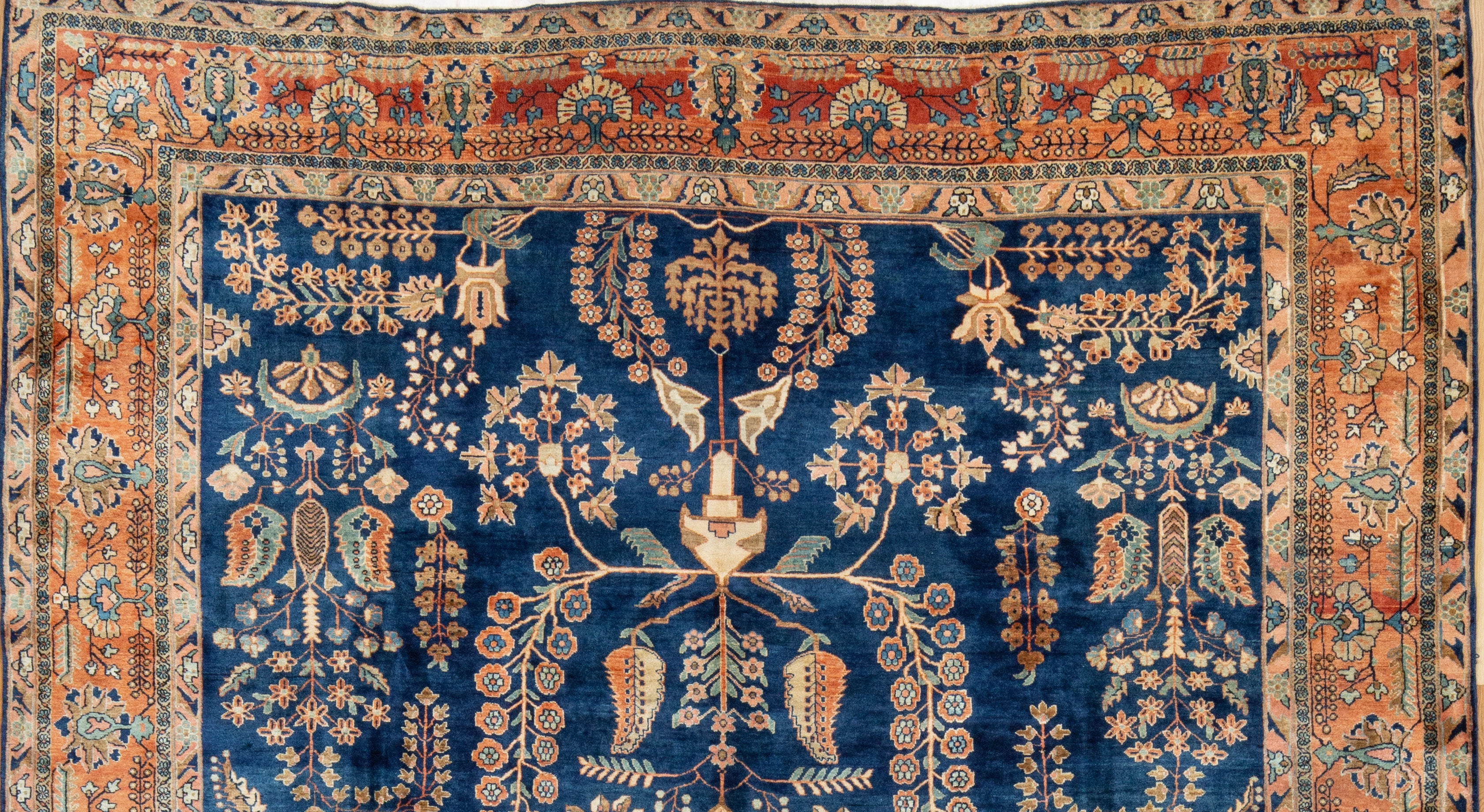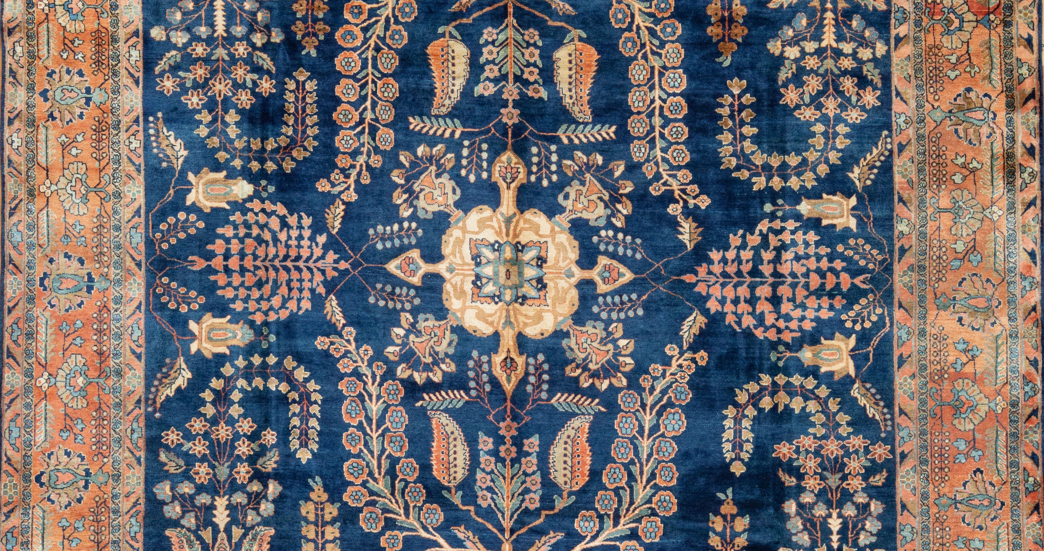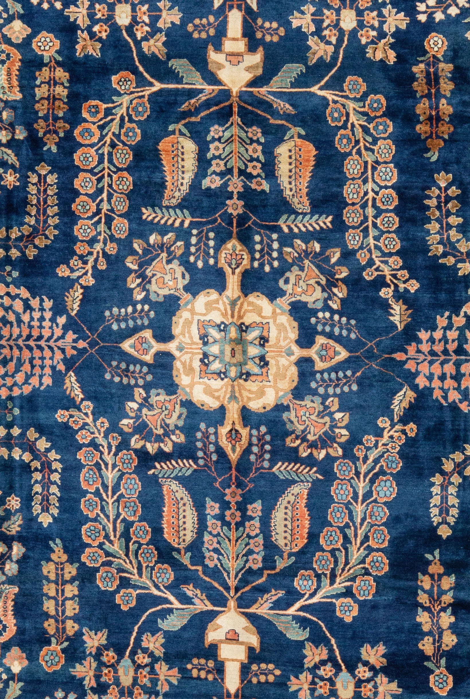 Sarouk with a deep navy field and tones of peach, blush, rust,