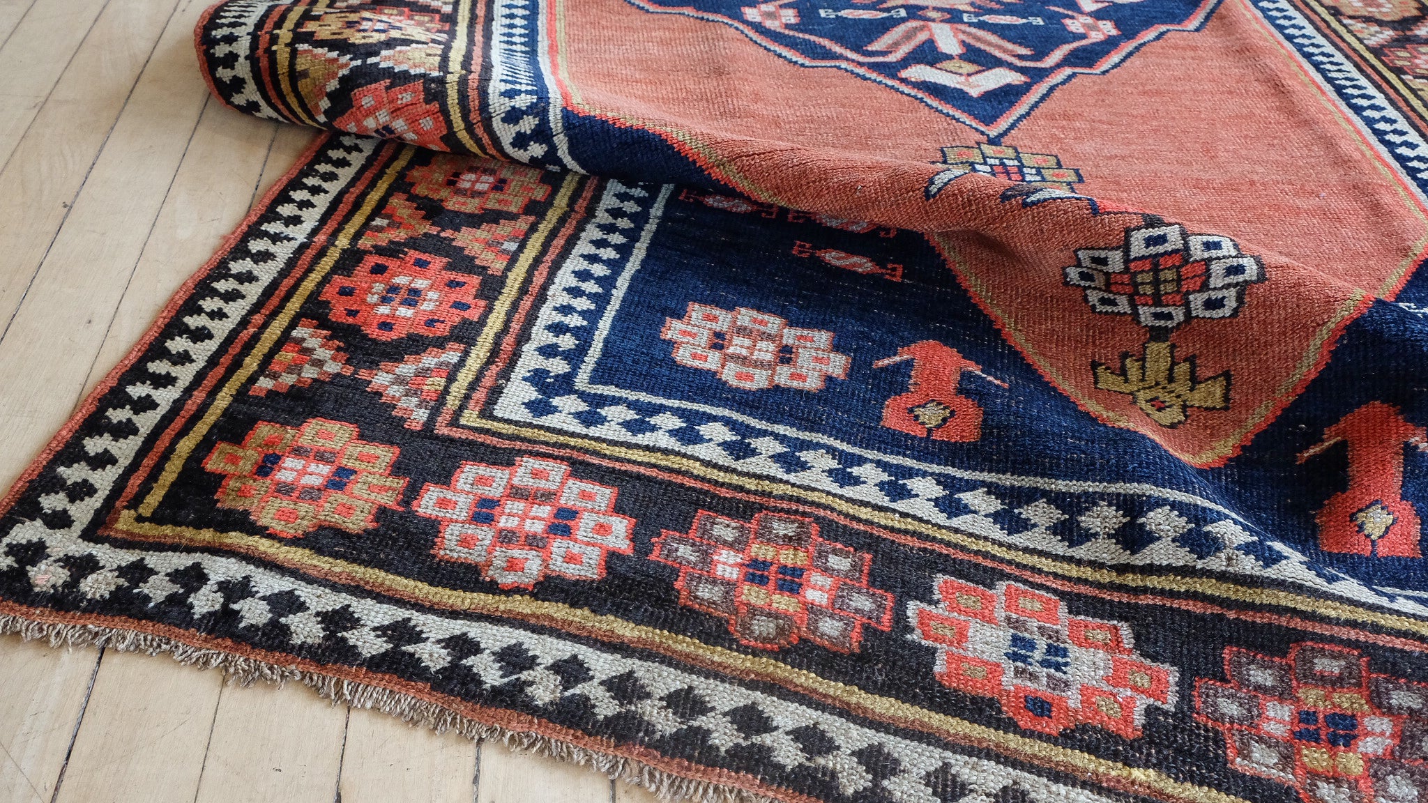 Bidjar with shades of rust, coral, bright pink, sunny yellow and navy