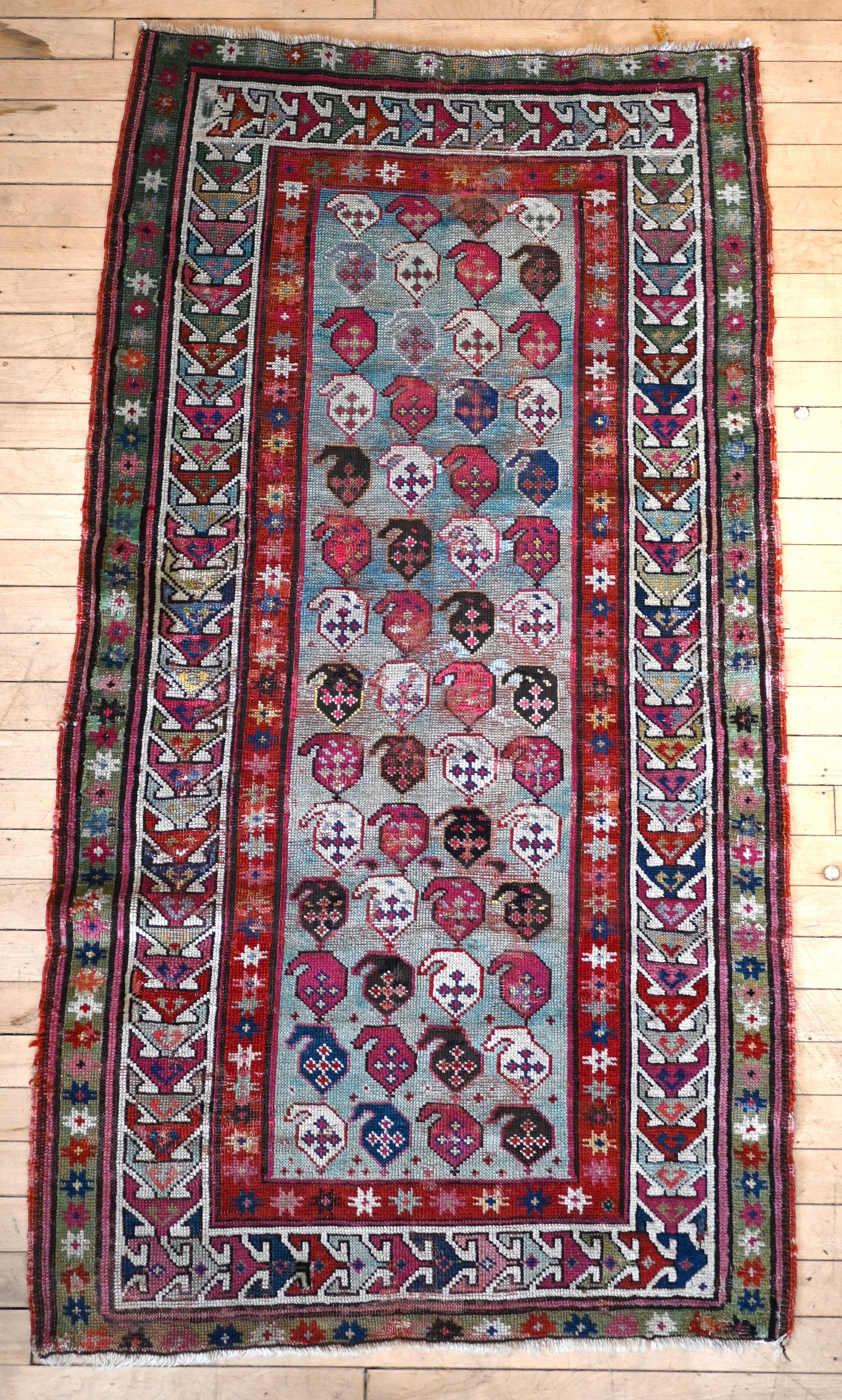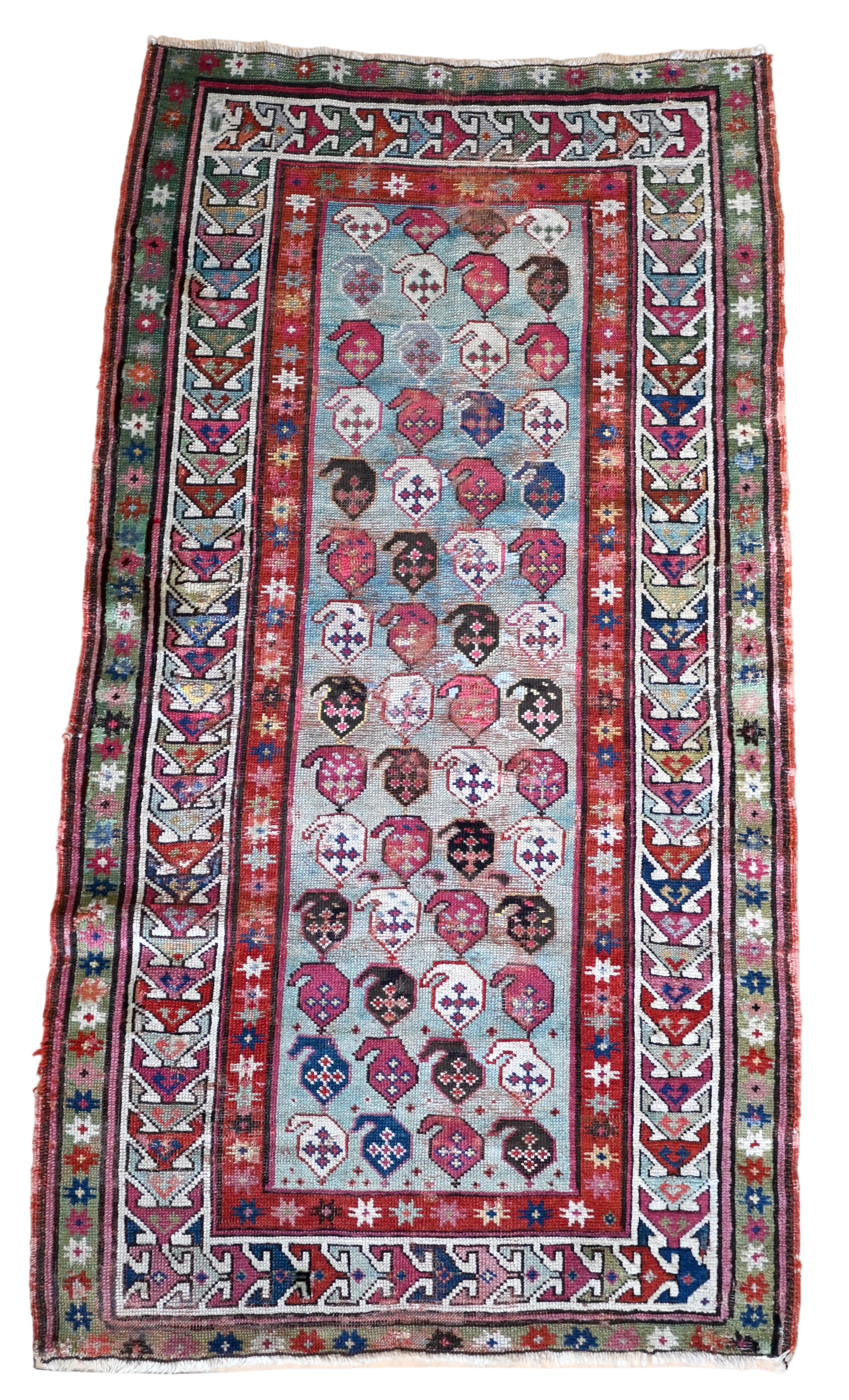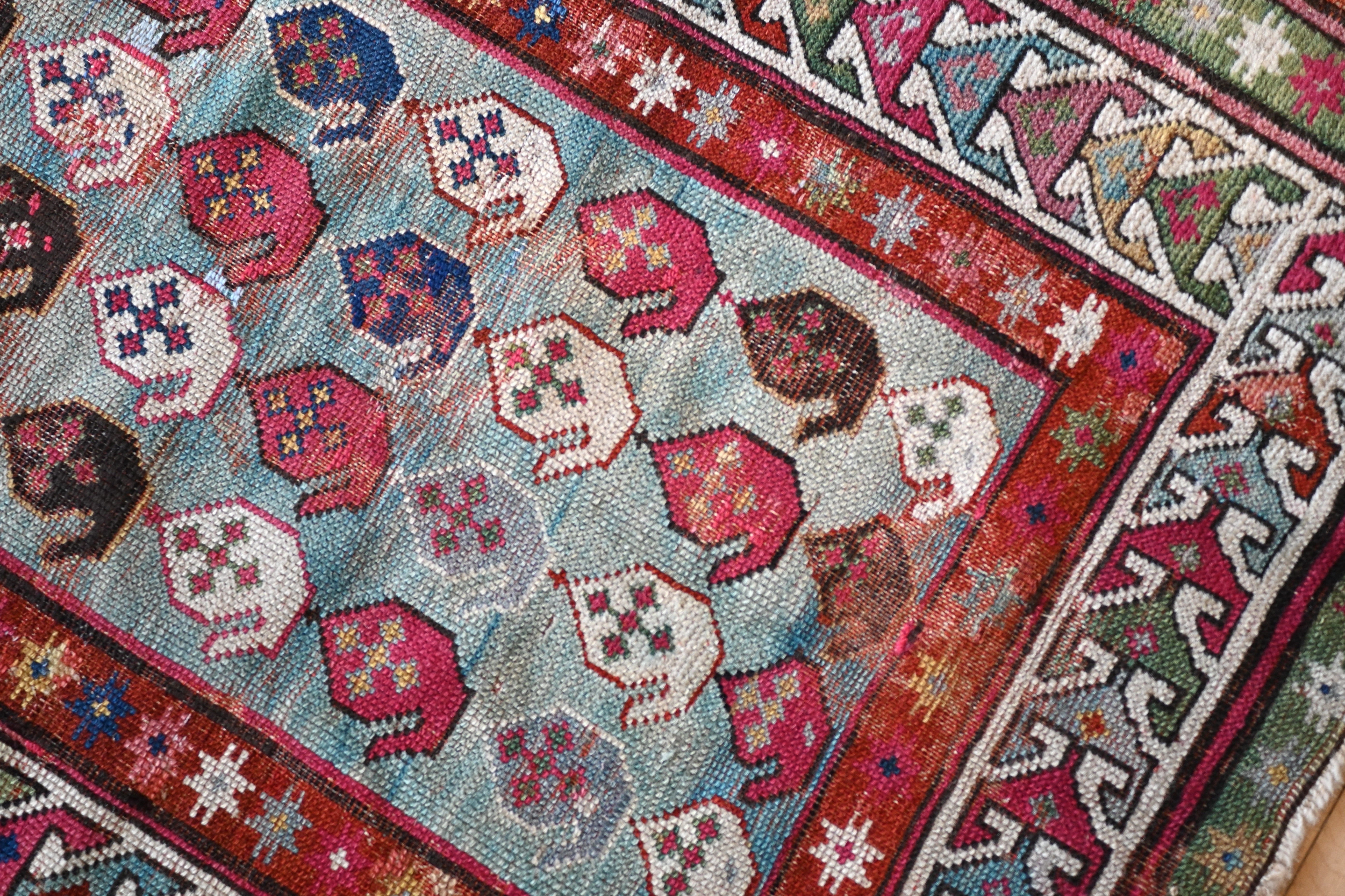 19th century Karabagh rug with stunning aqua blue field and accents of raspberry, teal, indigo, ivory and chocolate brown.
