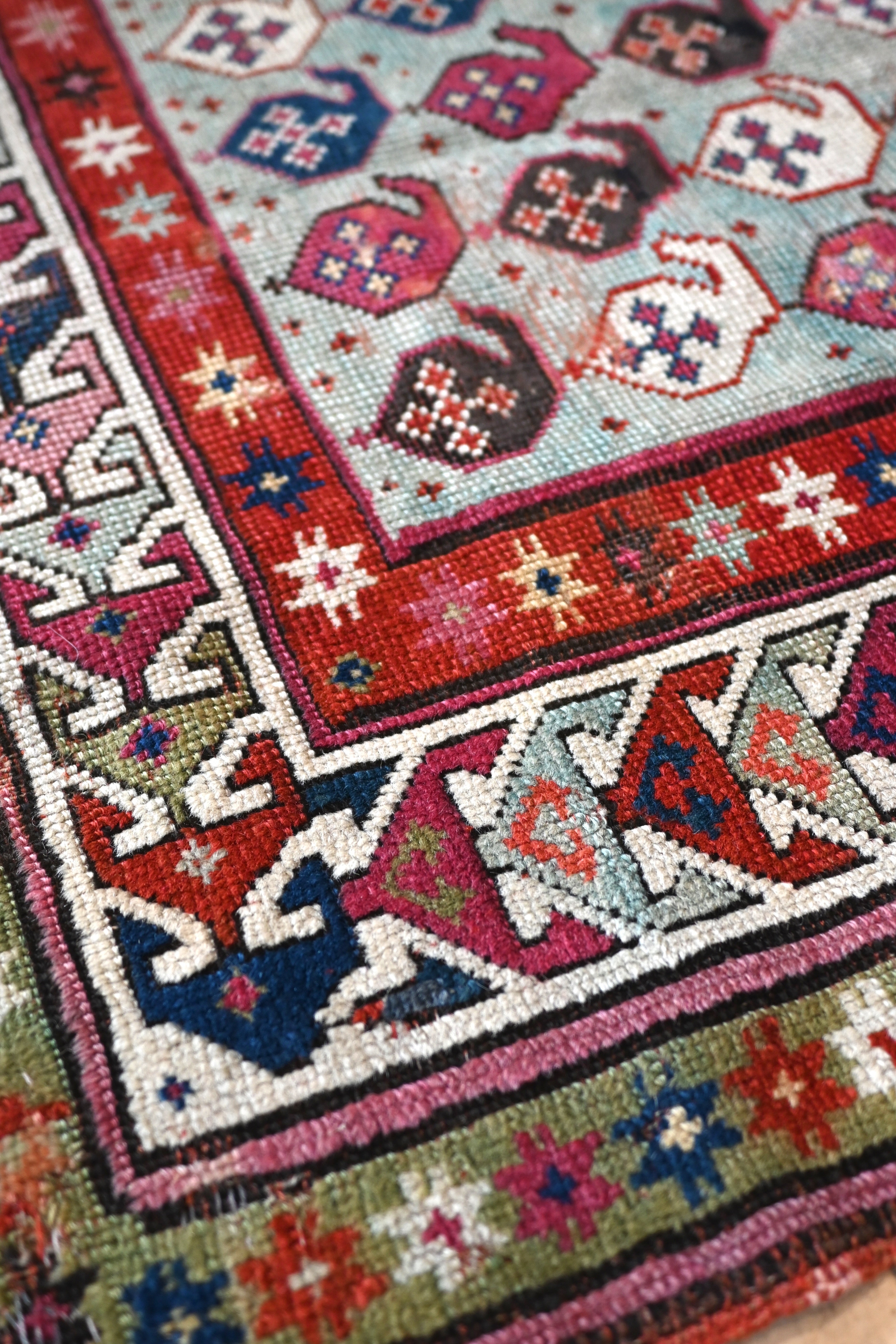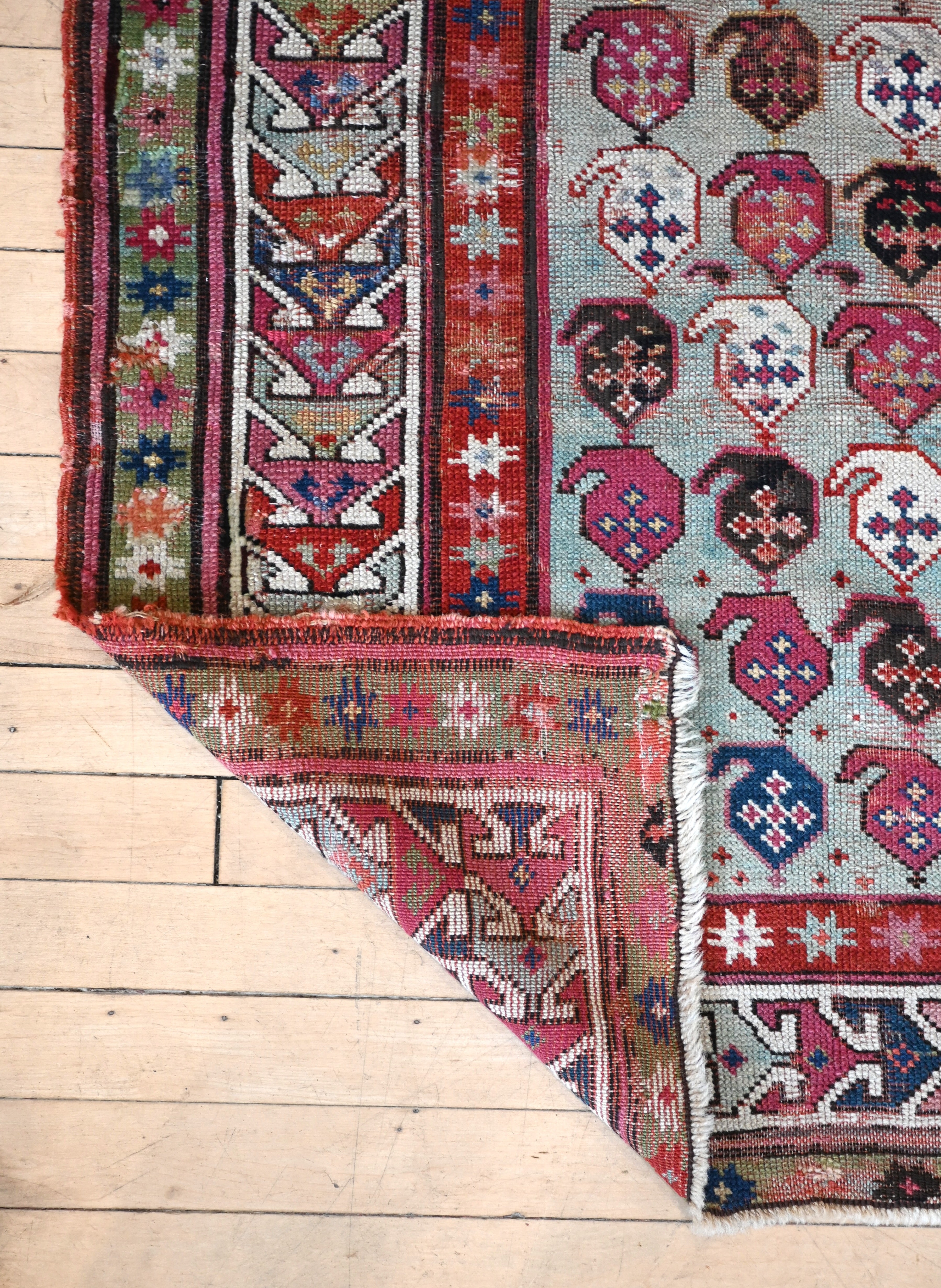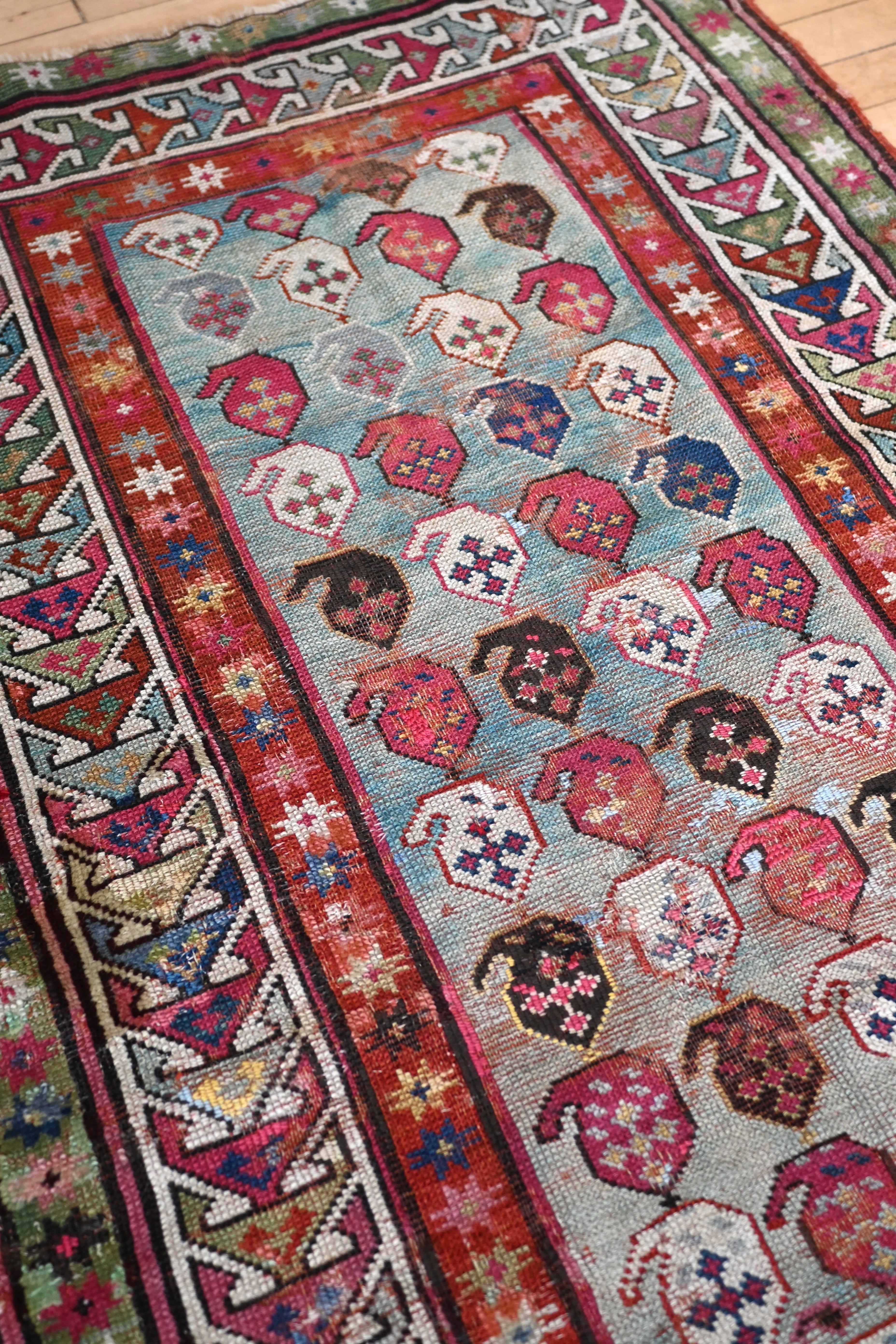 19th century Karabagh rug with stunning aqua blue field and accents of raspberry, teal, indigo, ivory and chocolate brown.