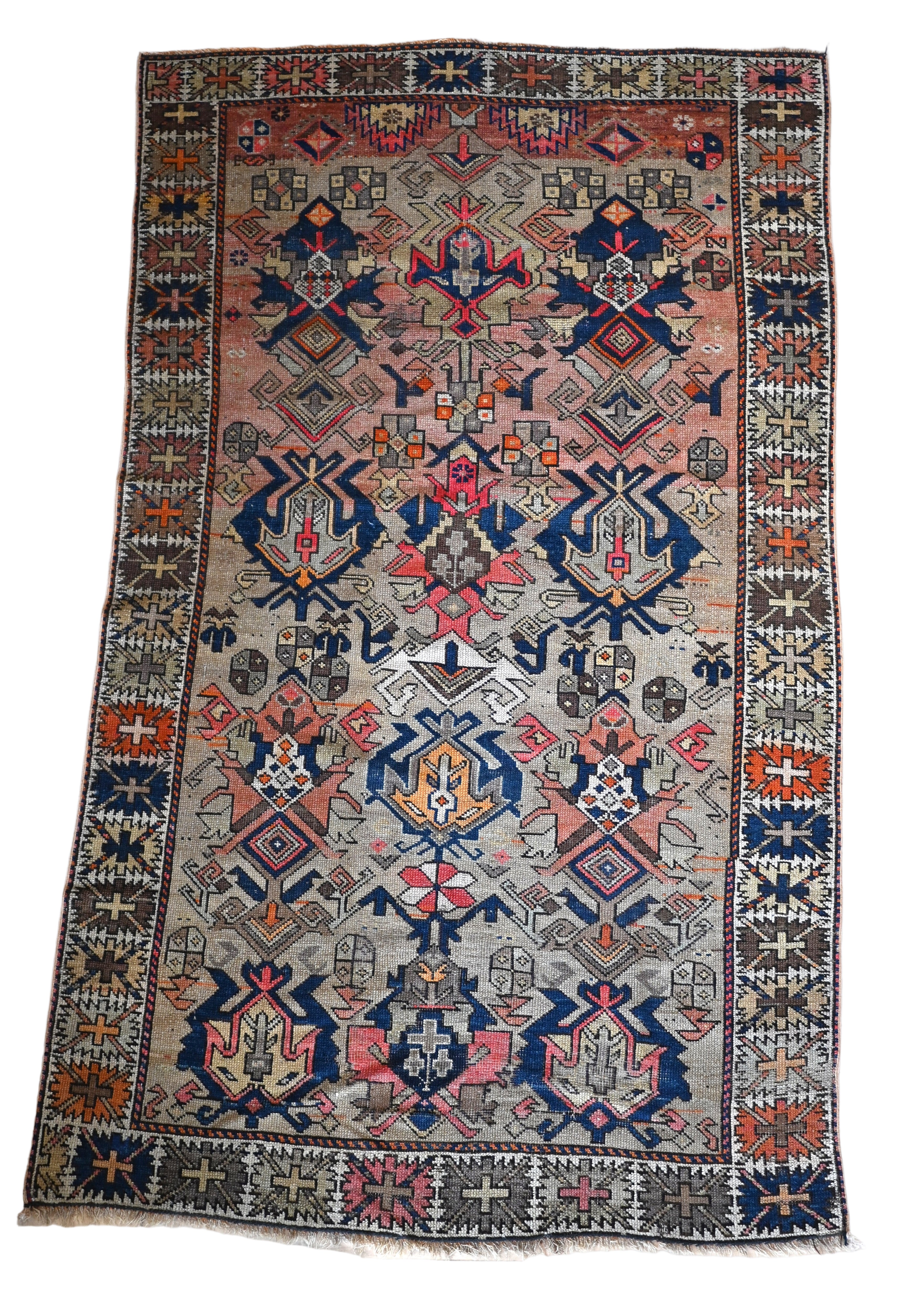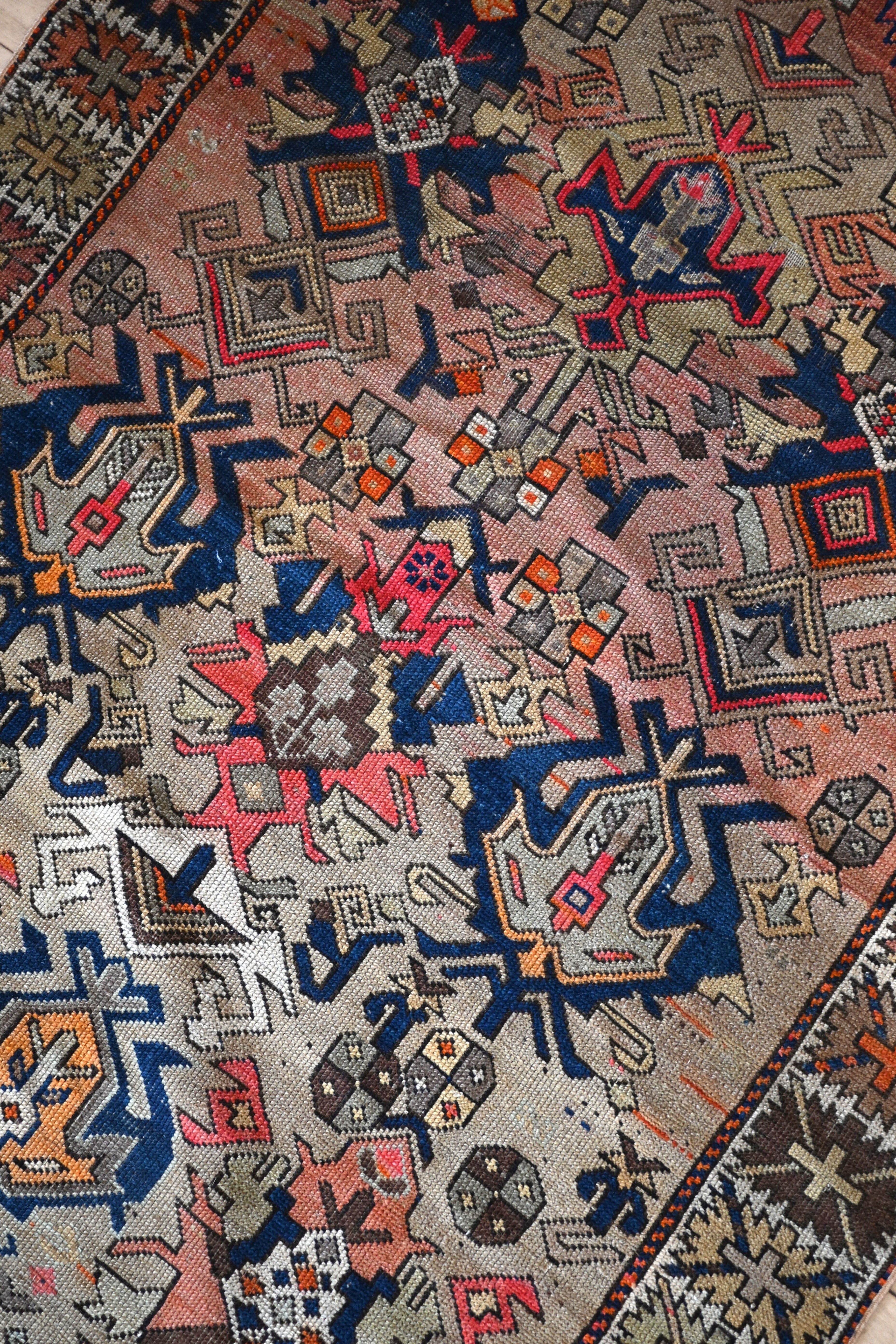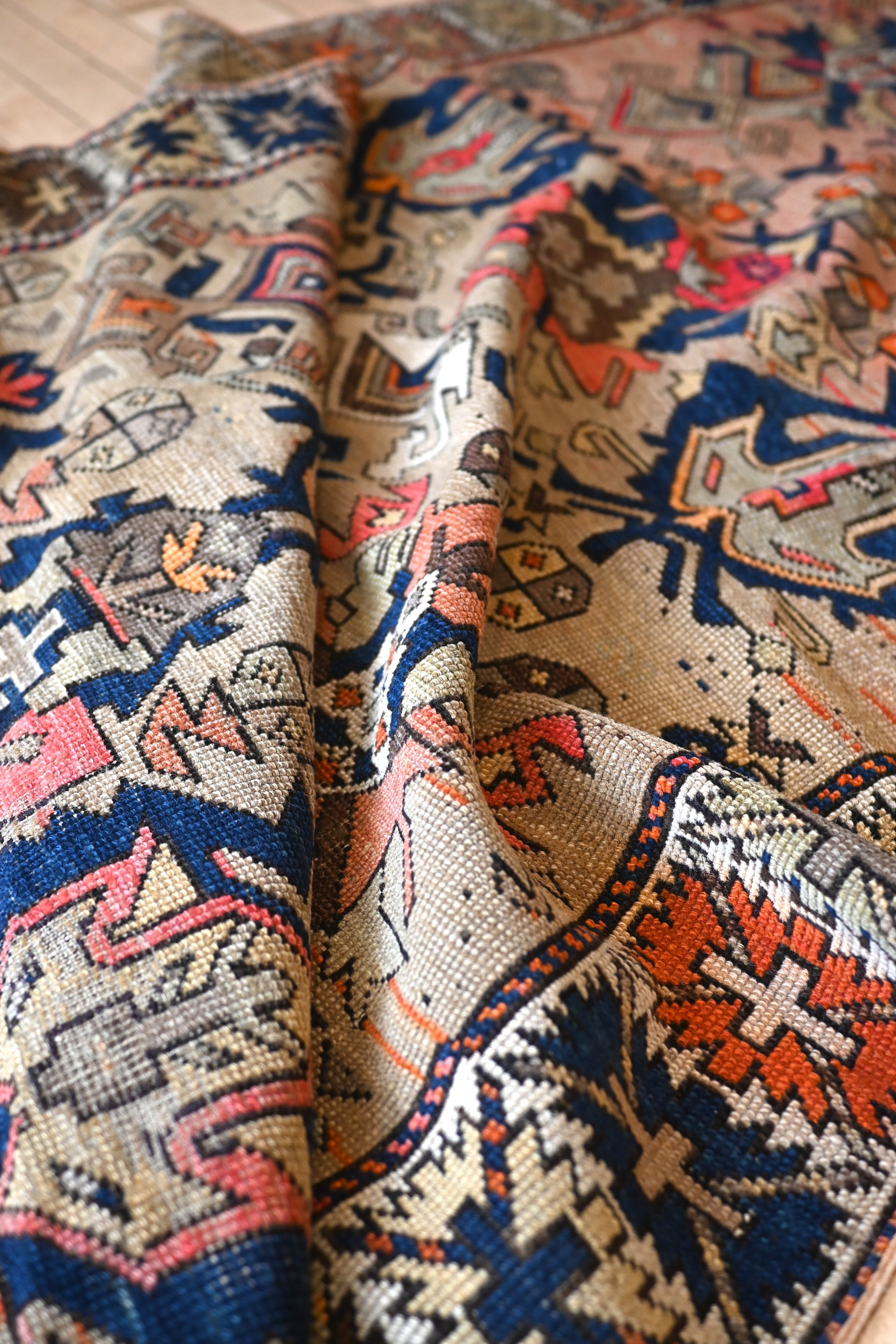 Turn of the century Kazak with camel, pinks, indigo blue and orange.