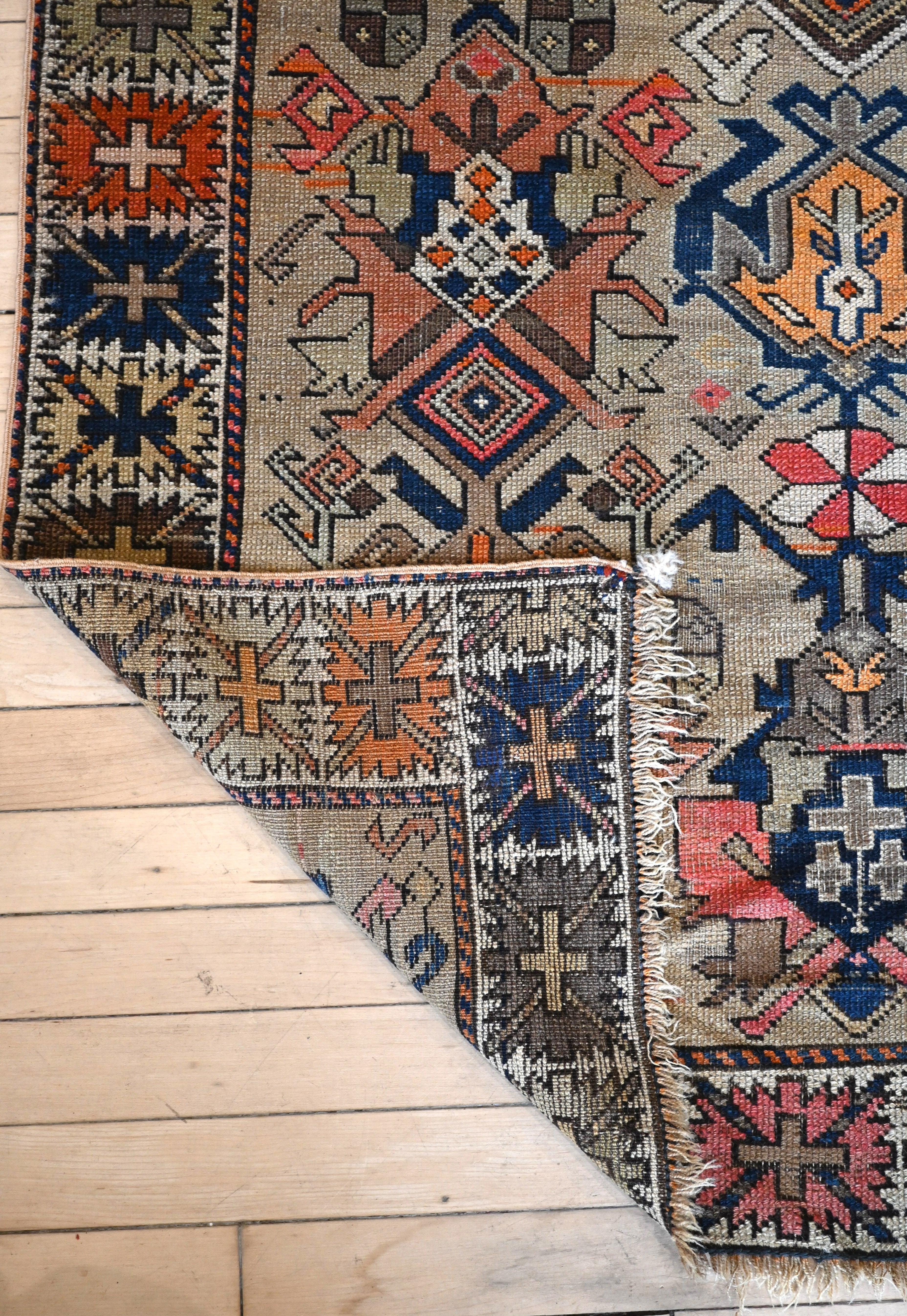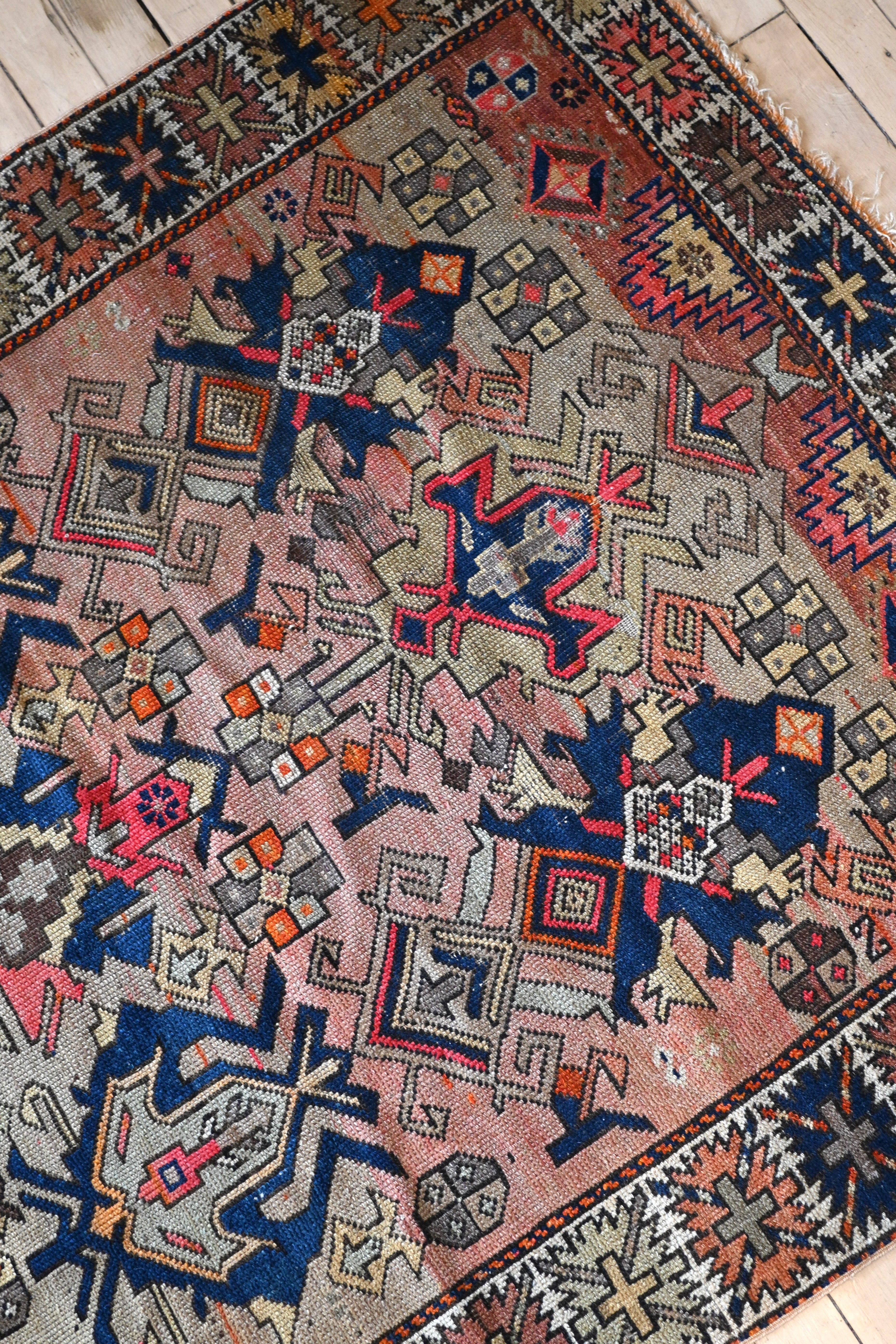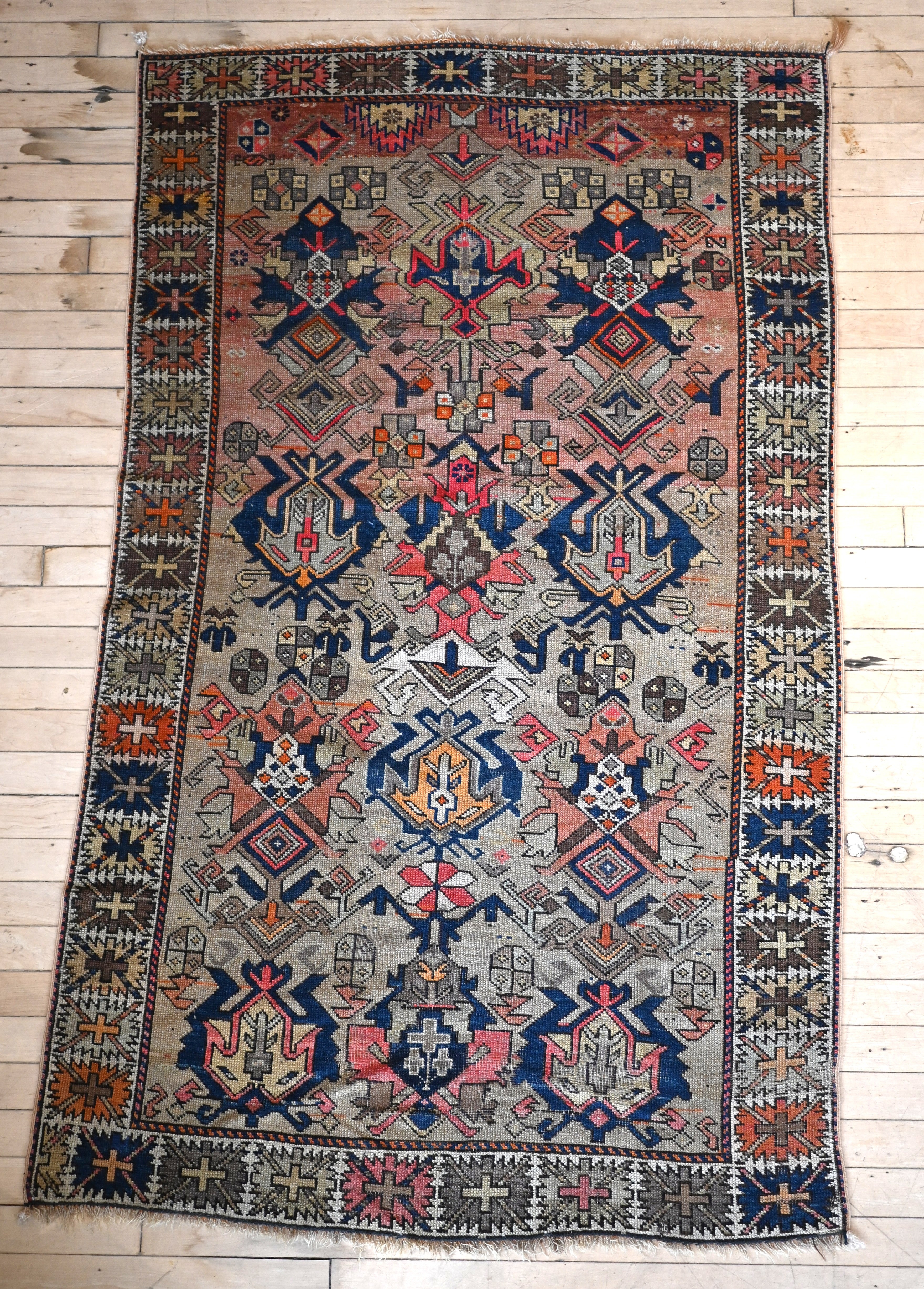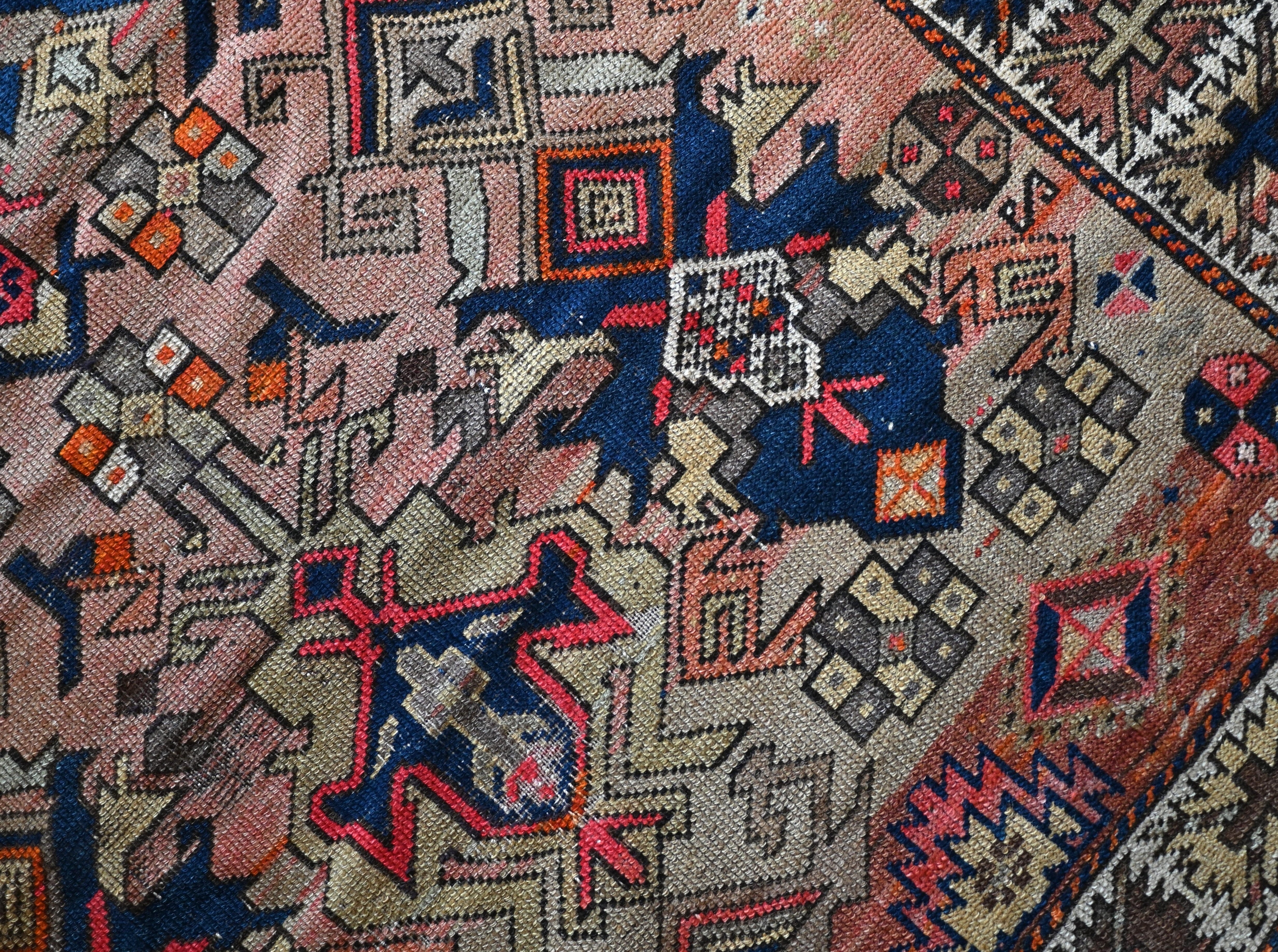 Turn of the century Kazak with camel, pinks, indigo blue and orange.