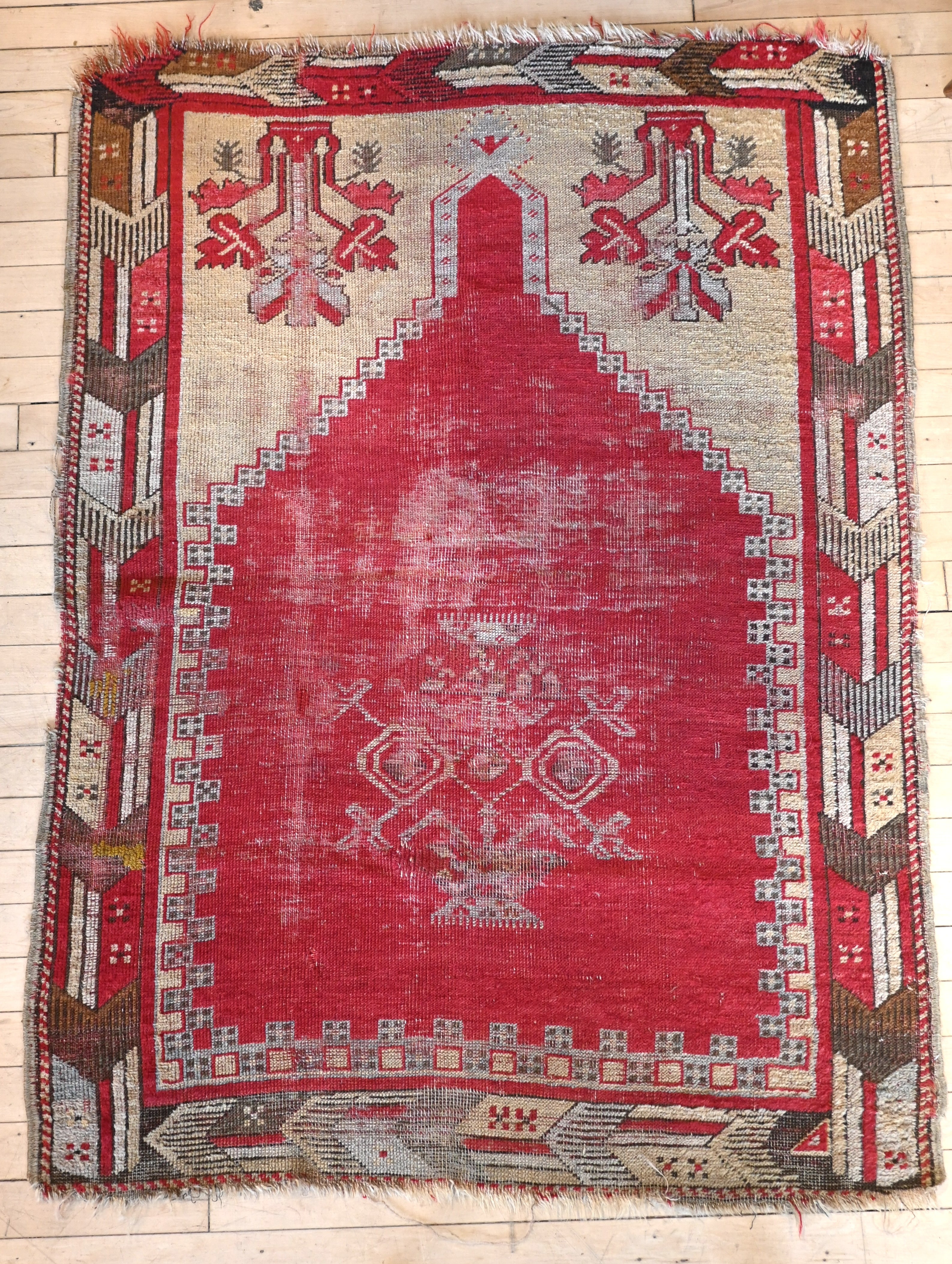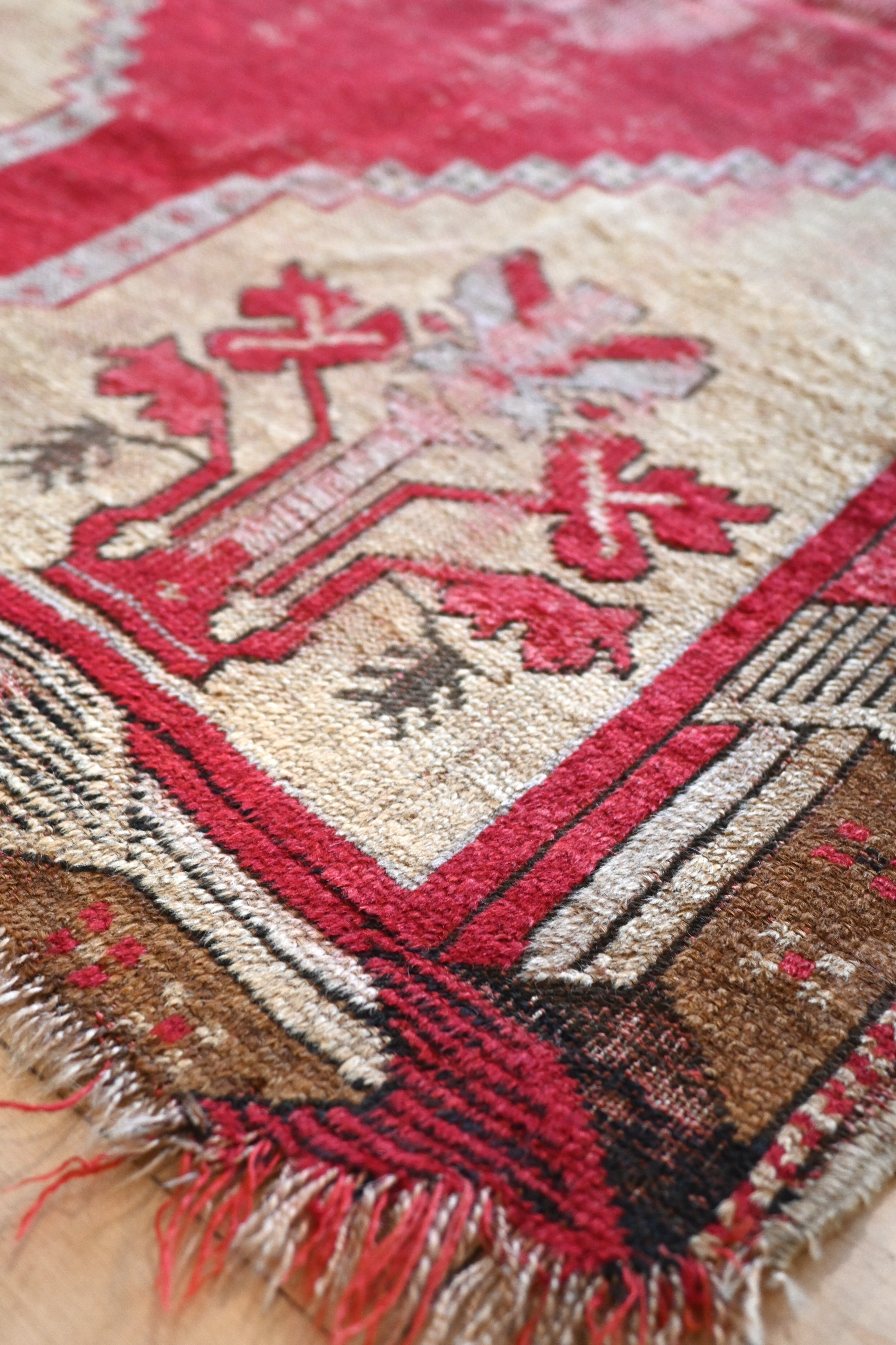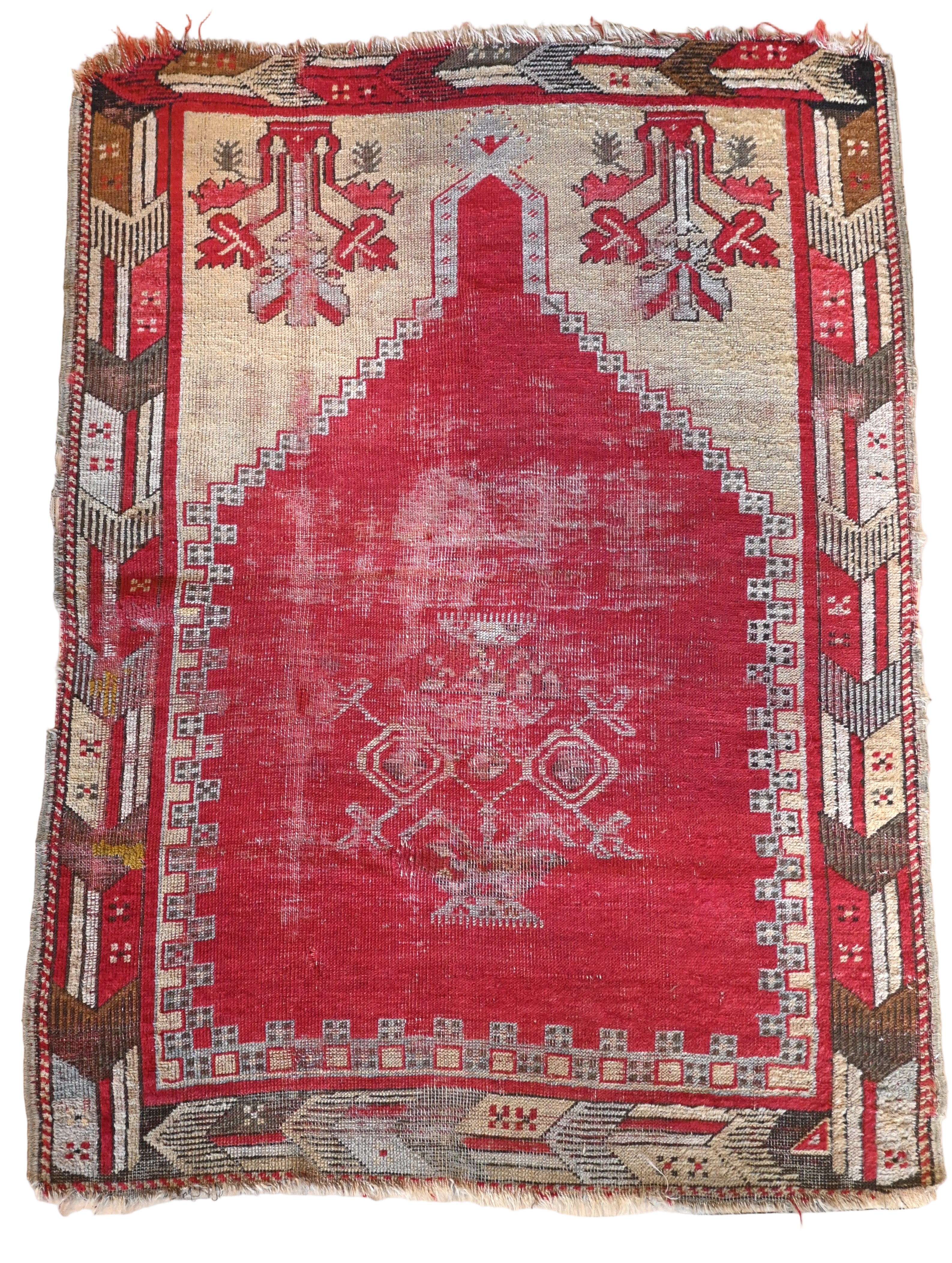 19th century Turkish prayer rug with vibrant pink, brown, soft yellow and gray