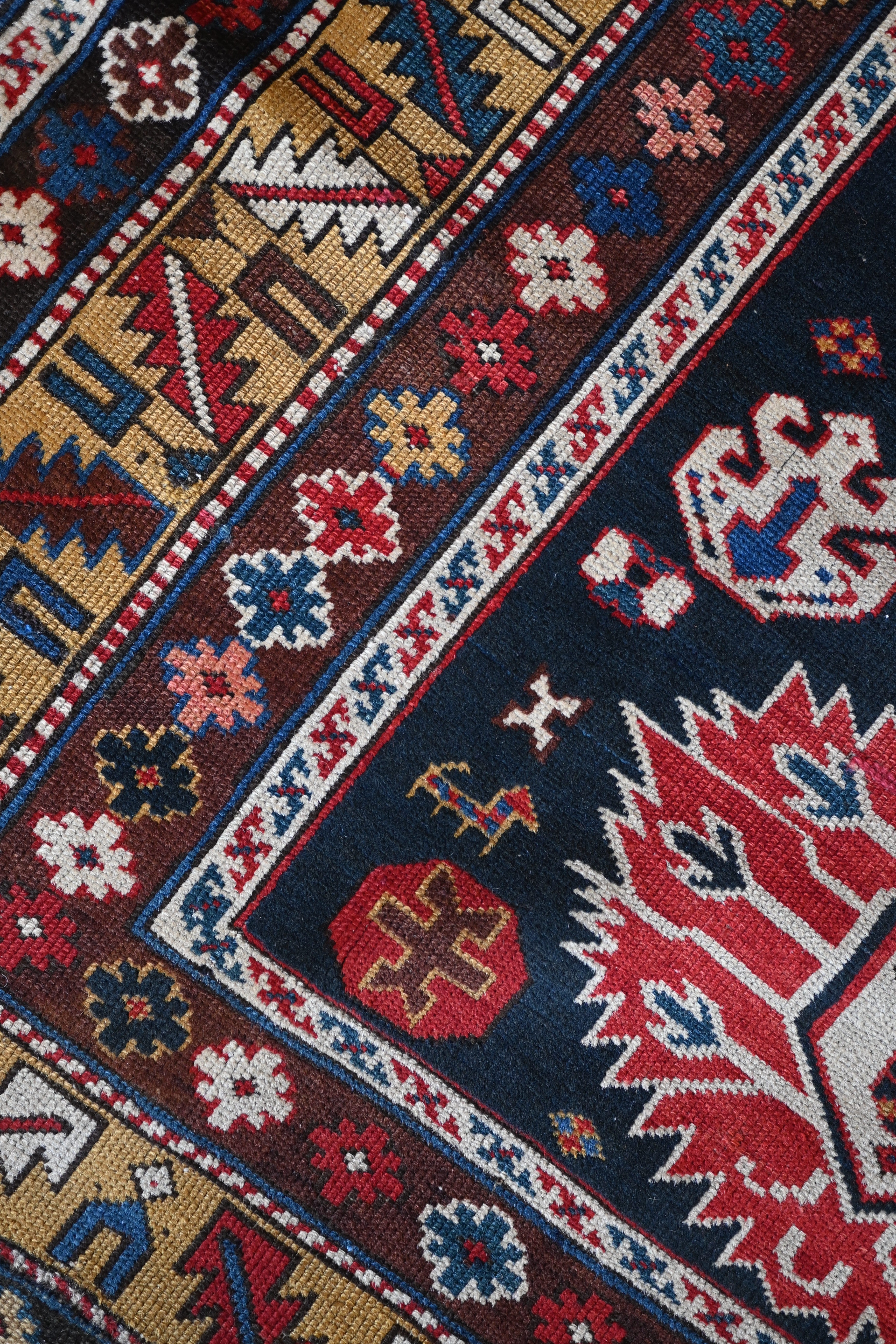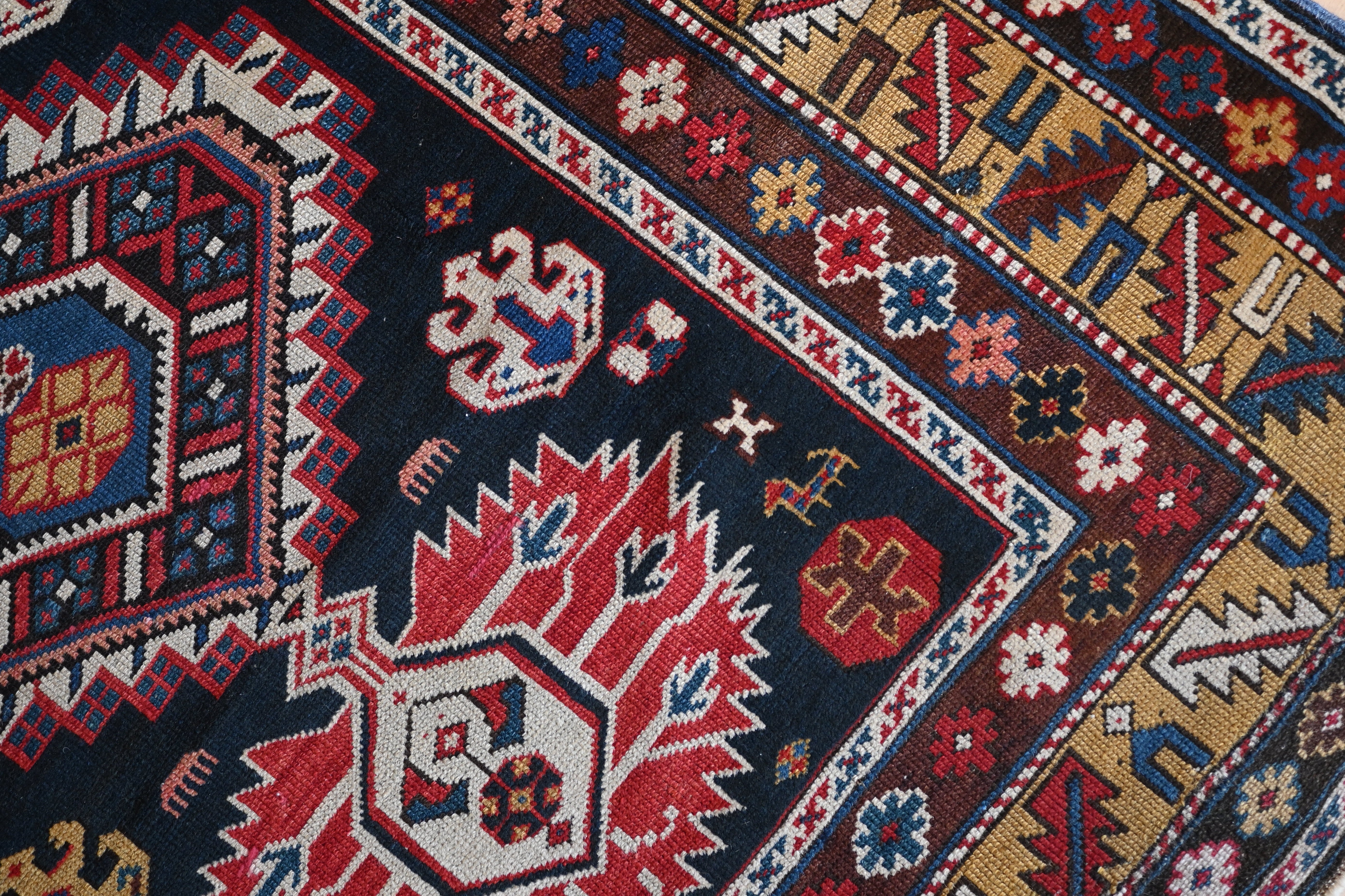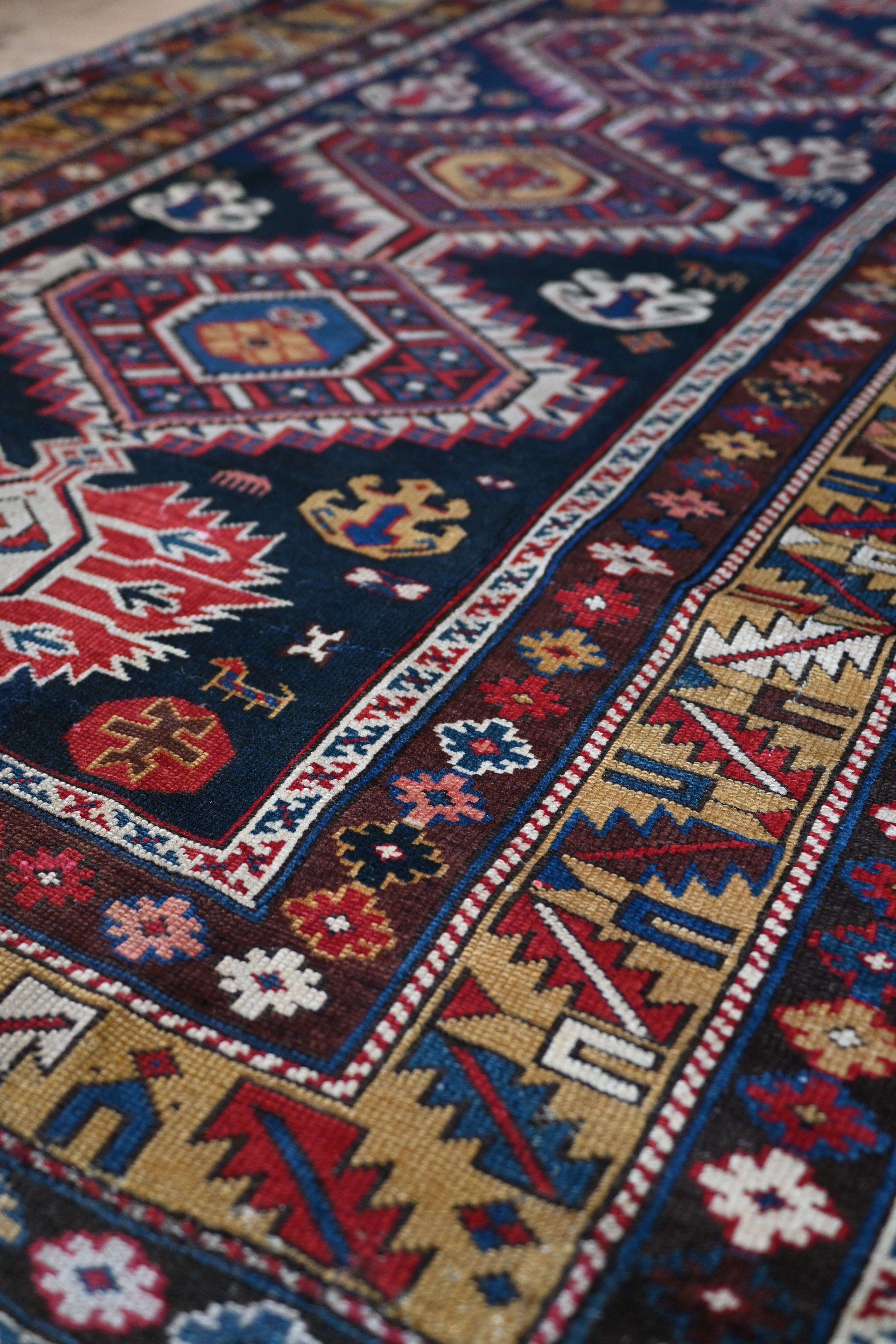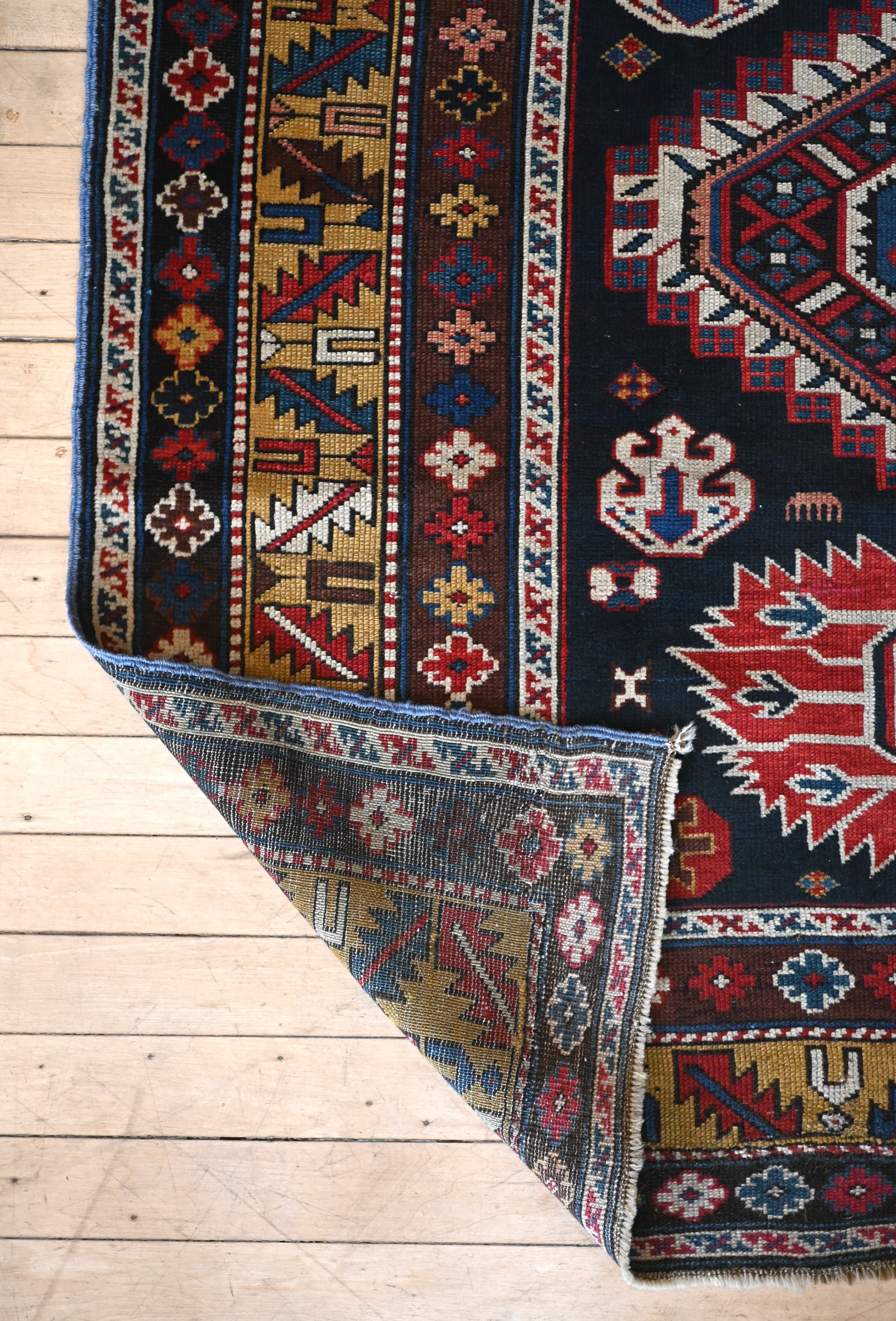 Late 19th century Qaraqashli kazak with deep navy, vibrant red and accents of wheat, indigo and ivory
