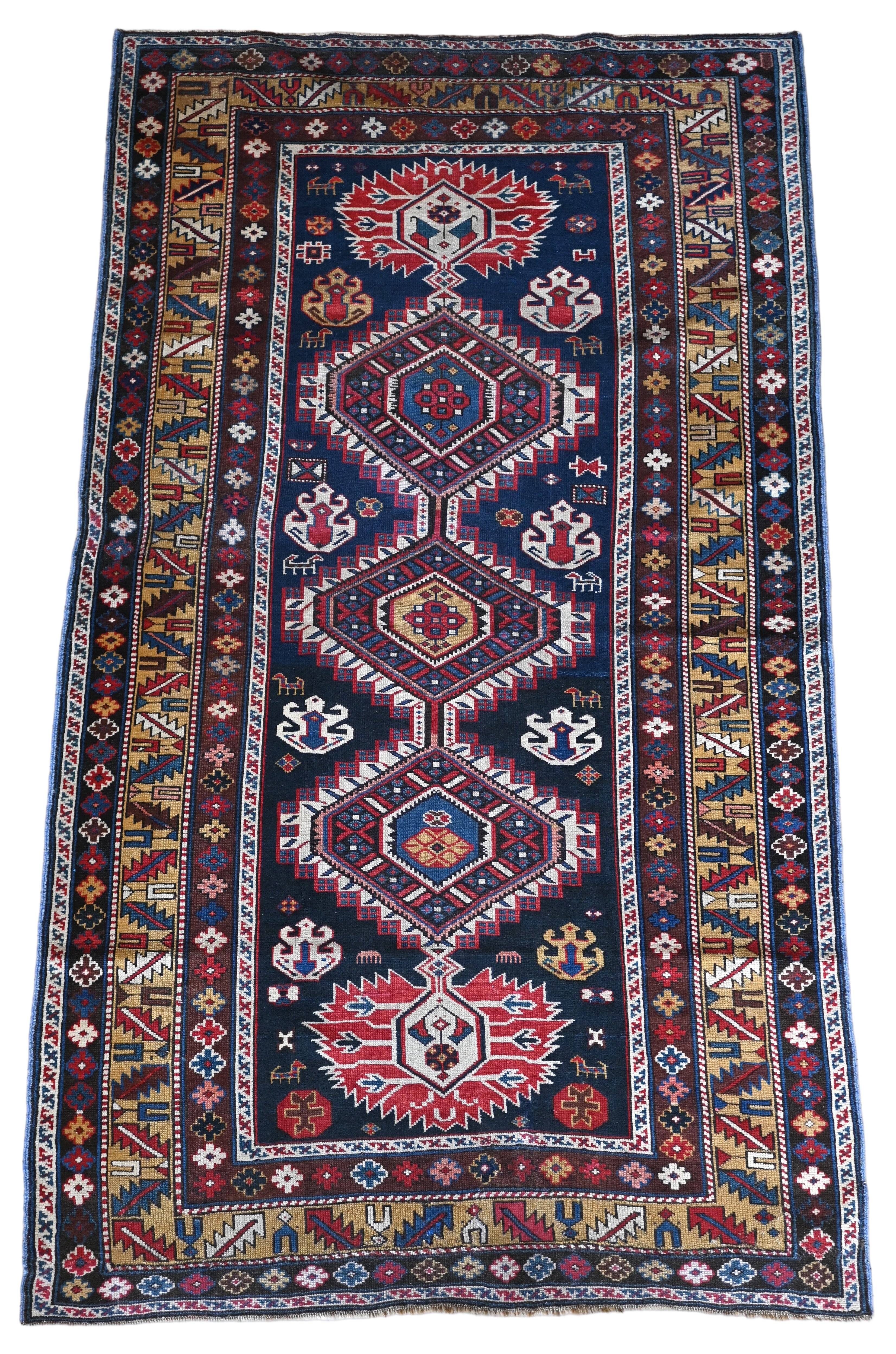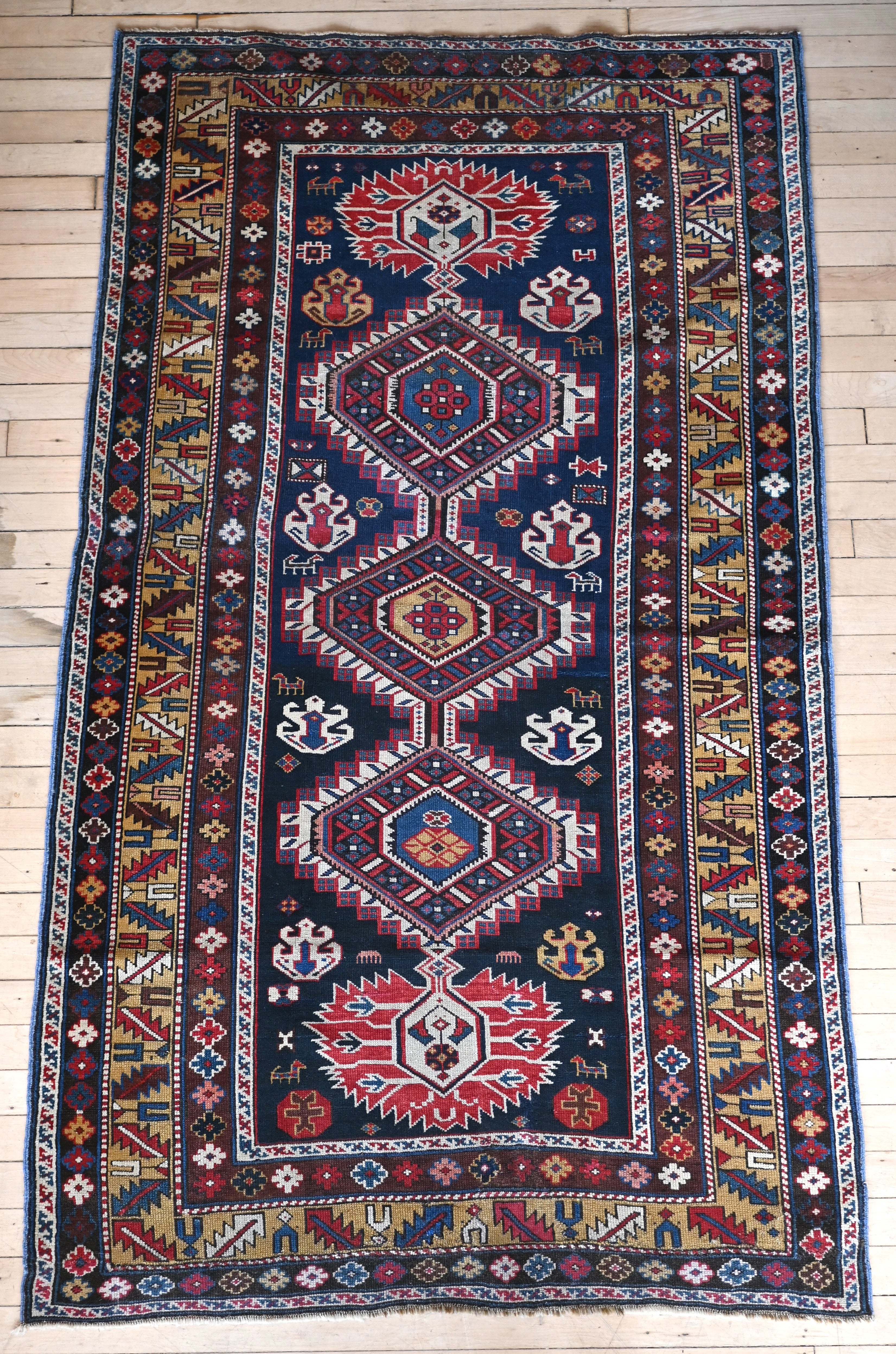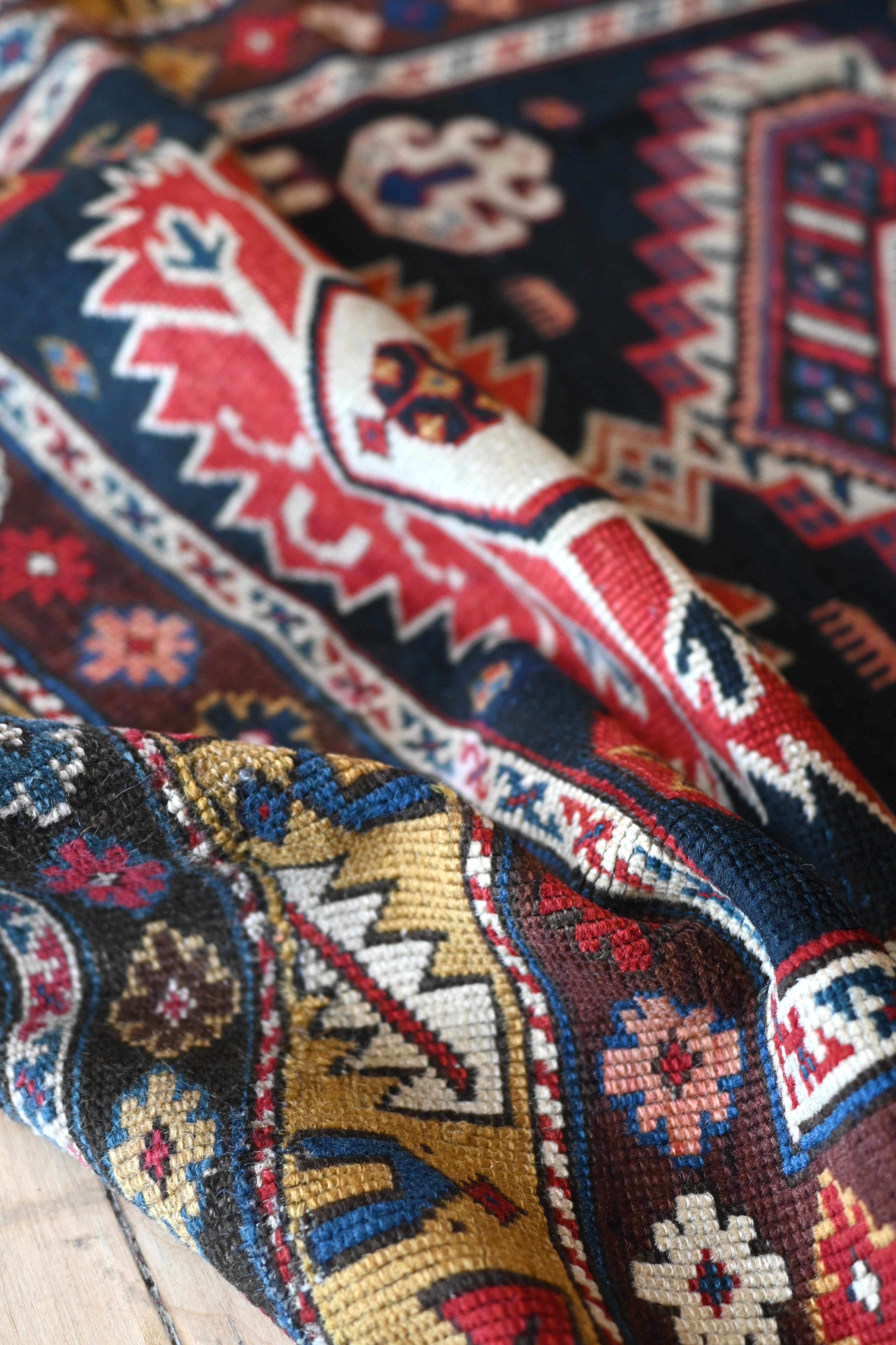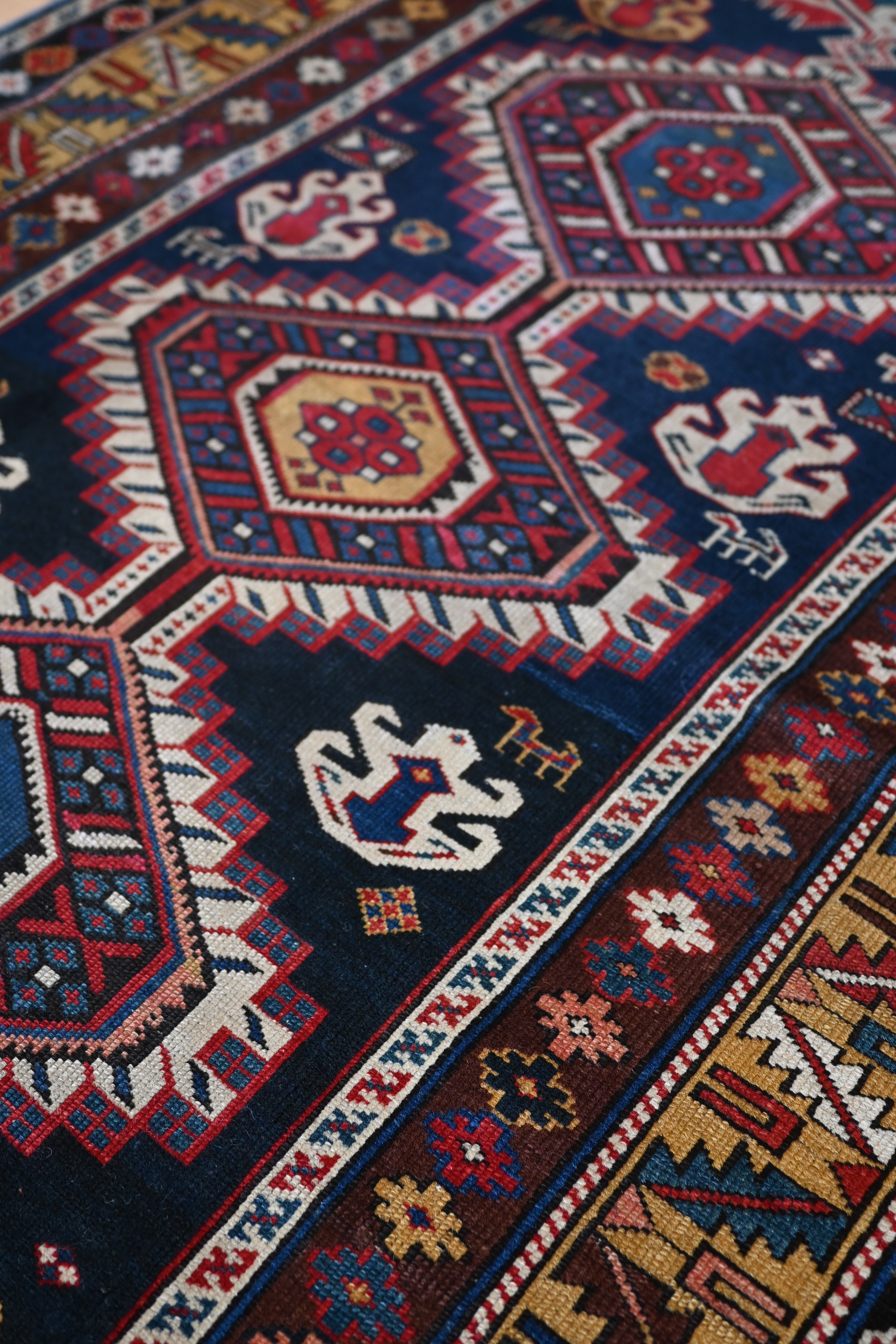 Late 19th century Qaraqashli kazak with deep navy, vibrant red and accents of wheat, indigo and ivory