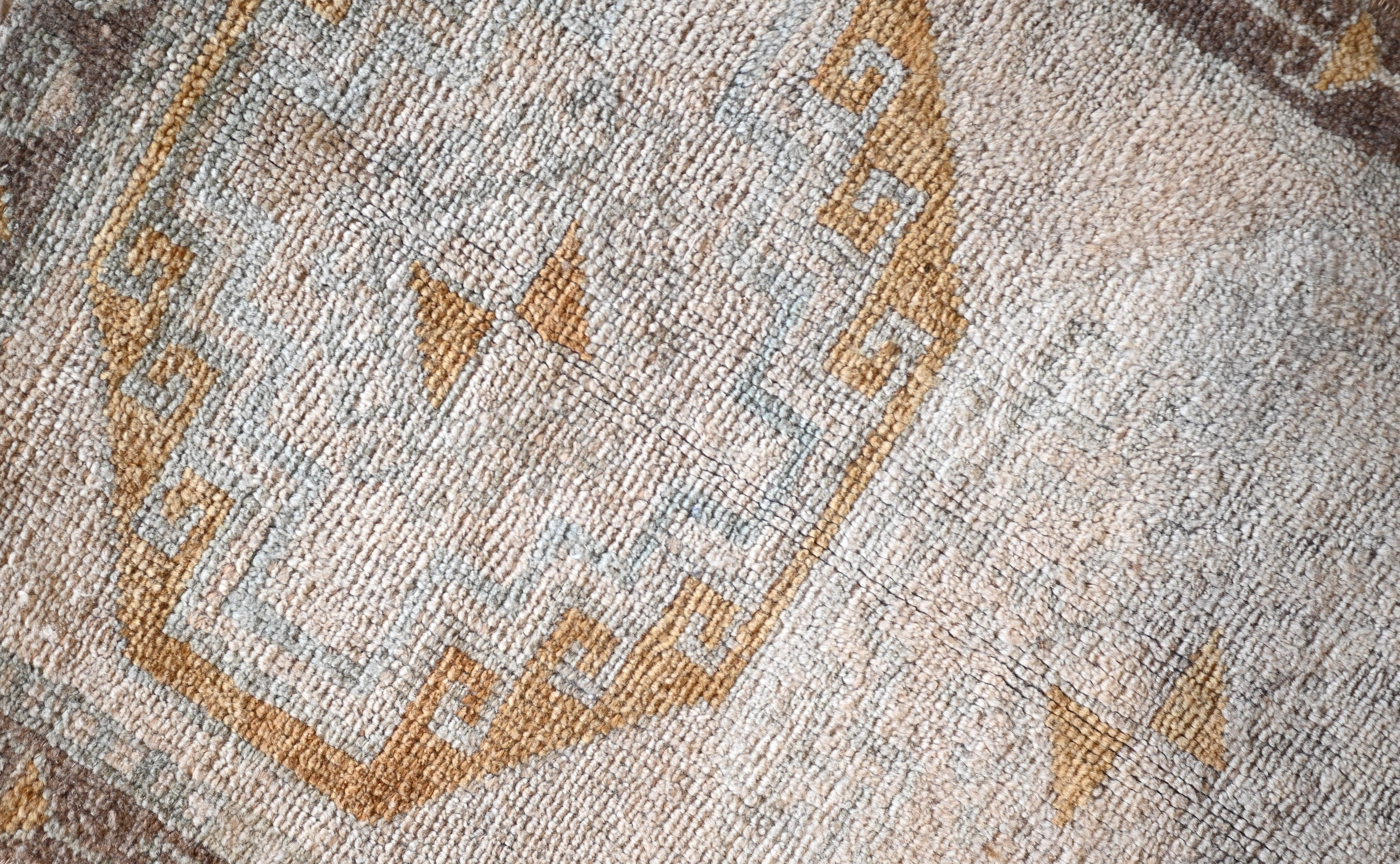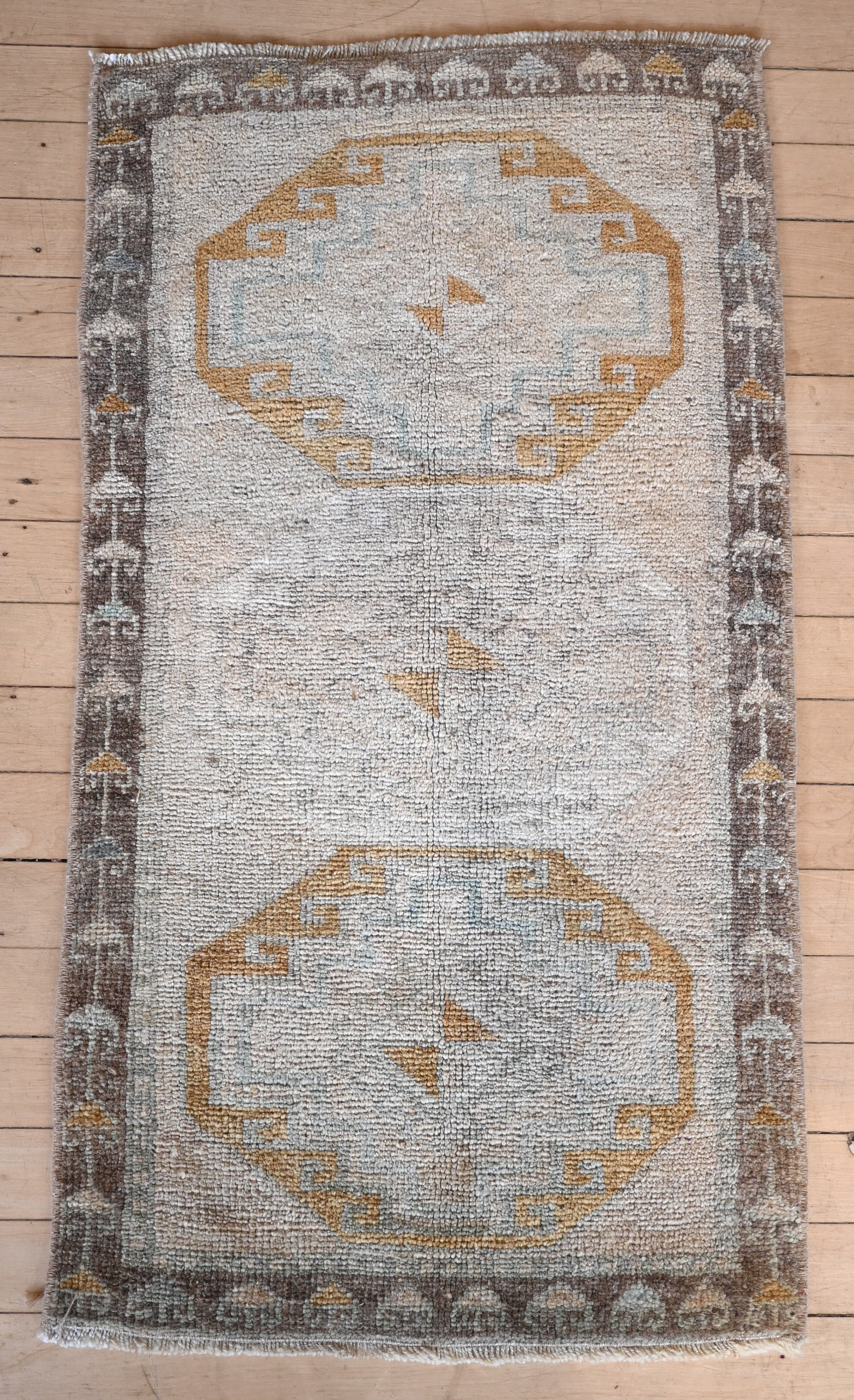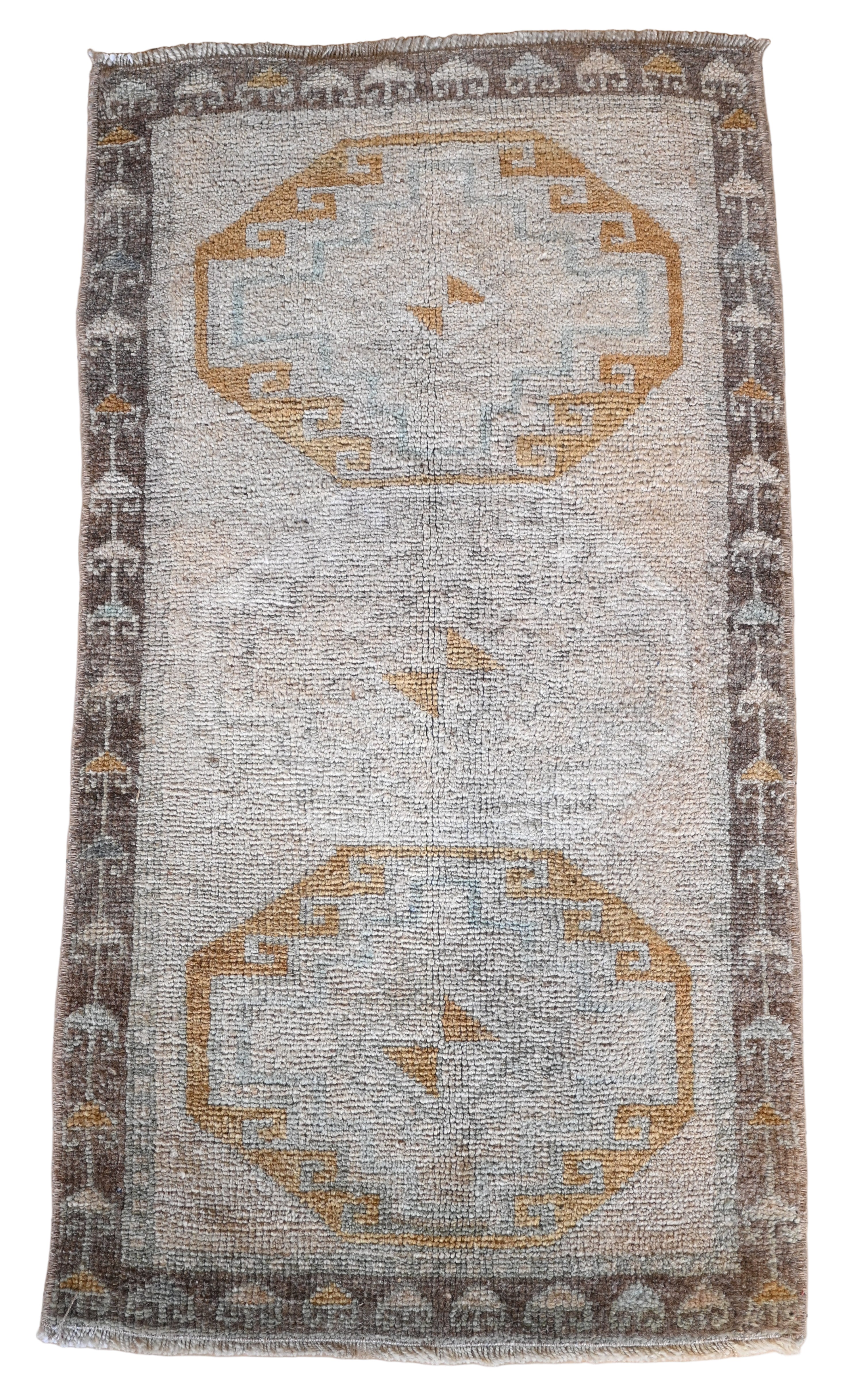 Turkish mat with cream, gray and accents of chartreuse and soft blue
