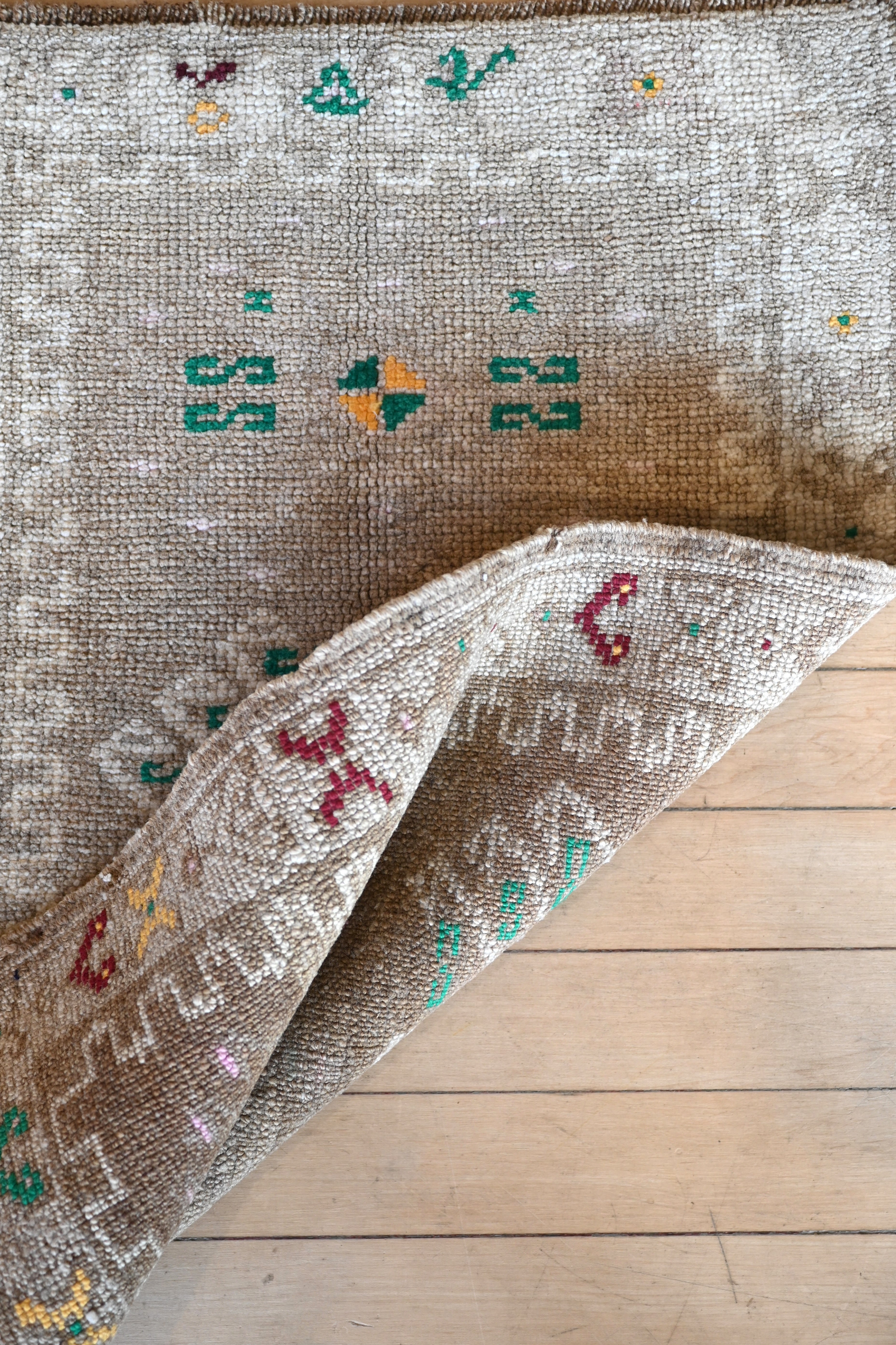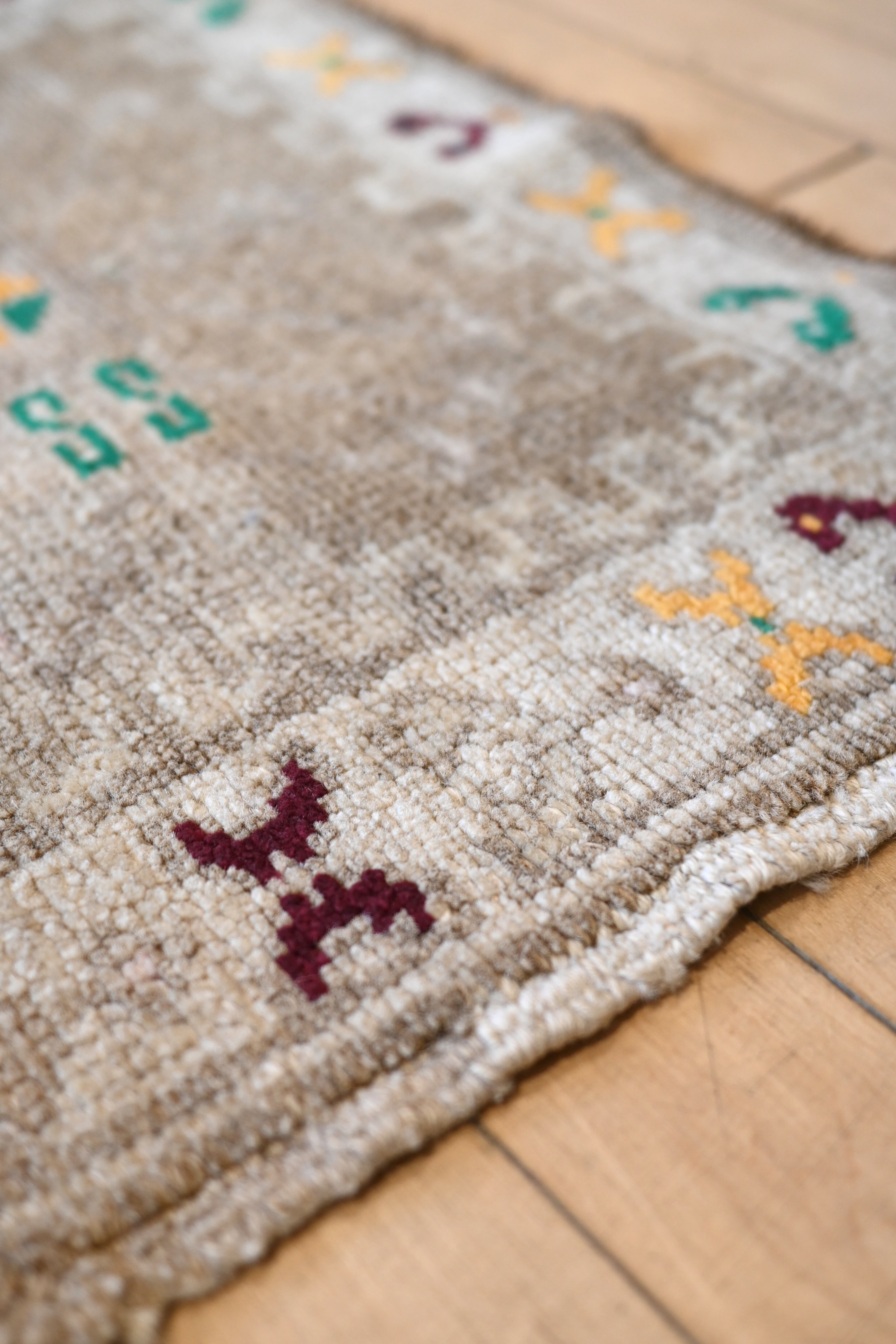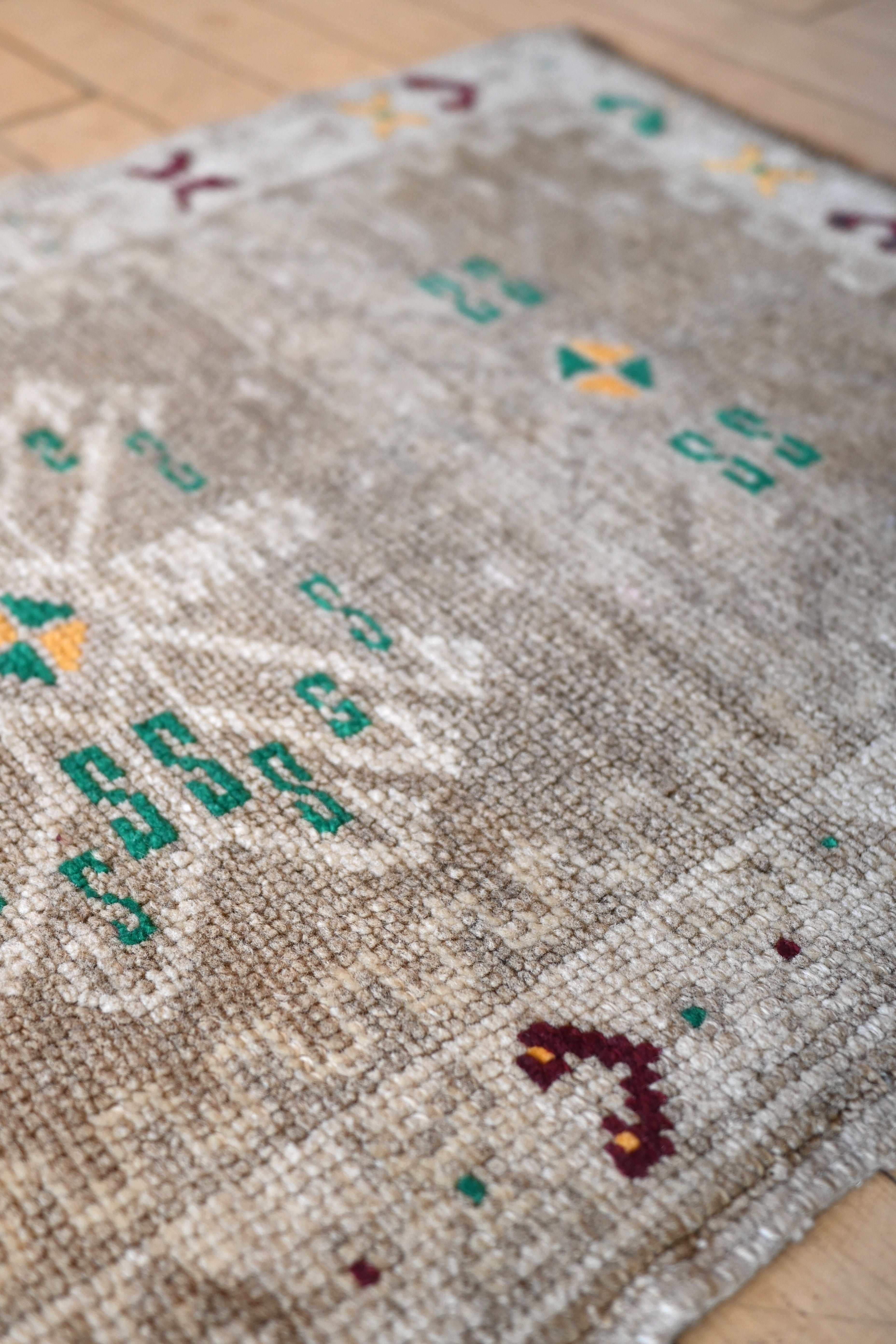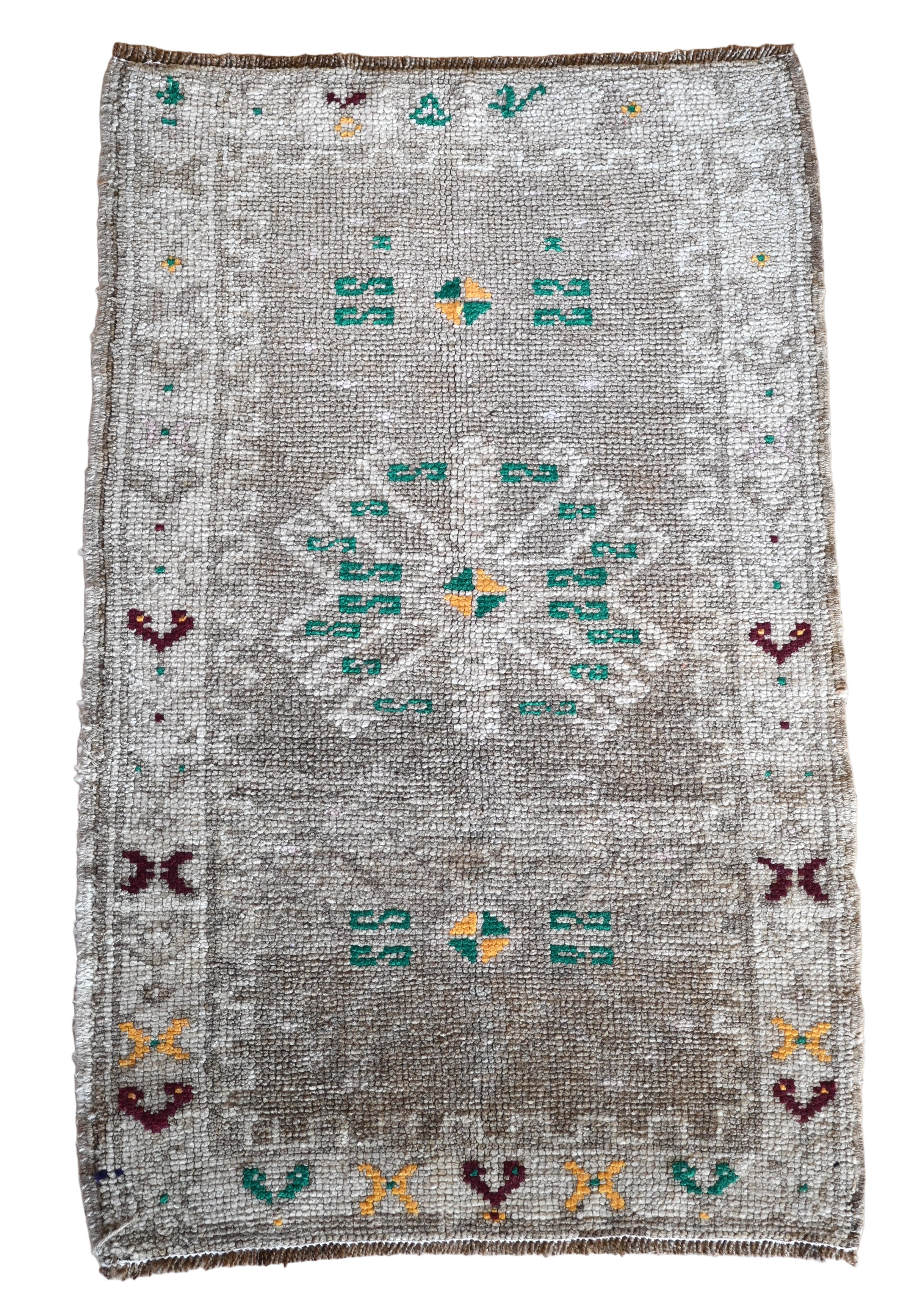 Turkish mat with gray toned neutrals, ivory and accents of primary green, yellow and burgundy