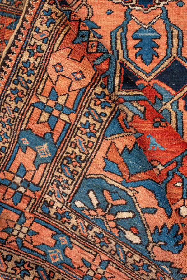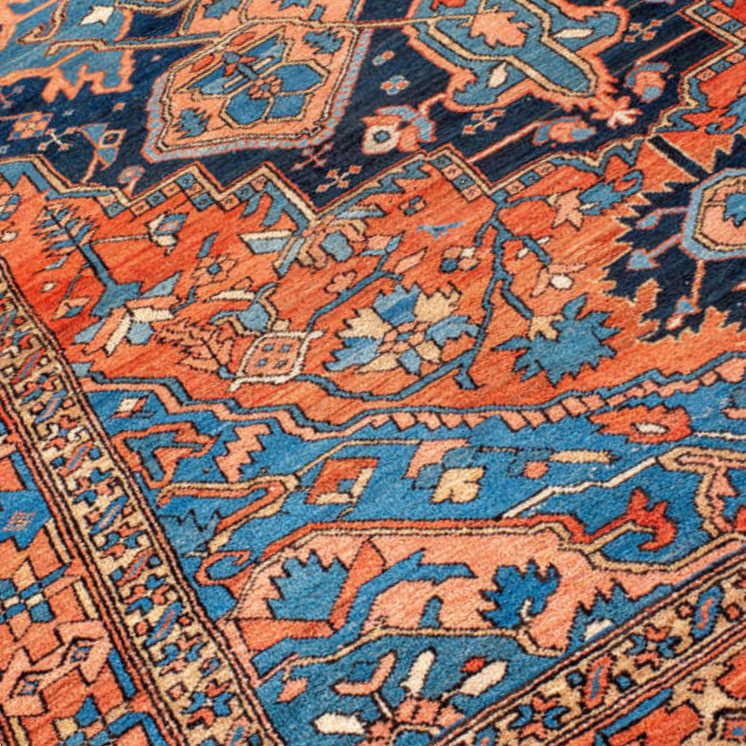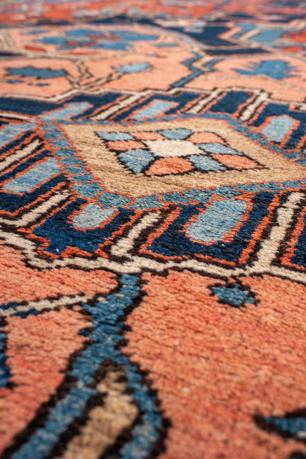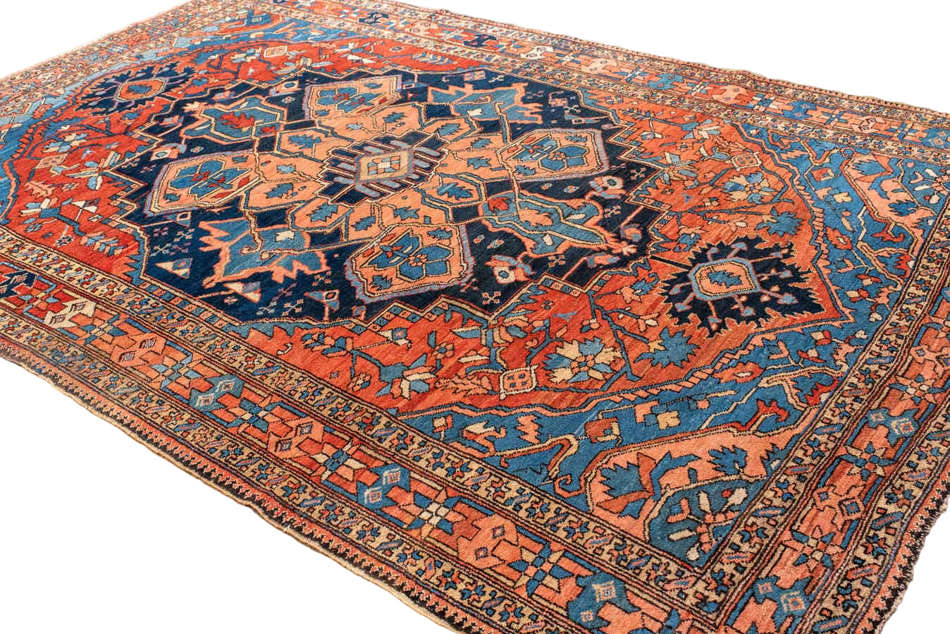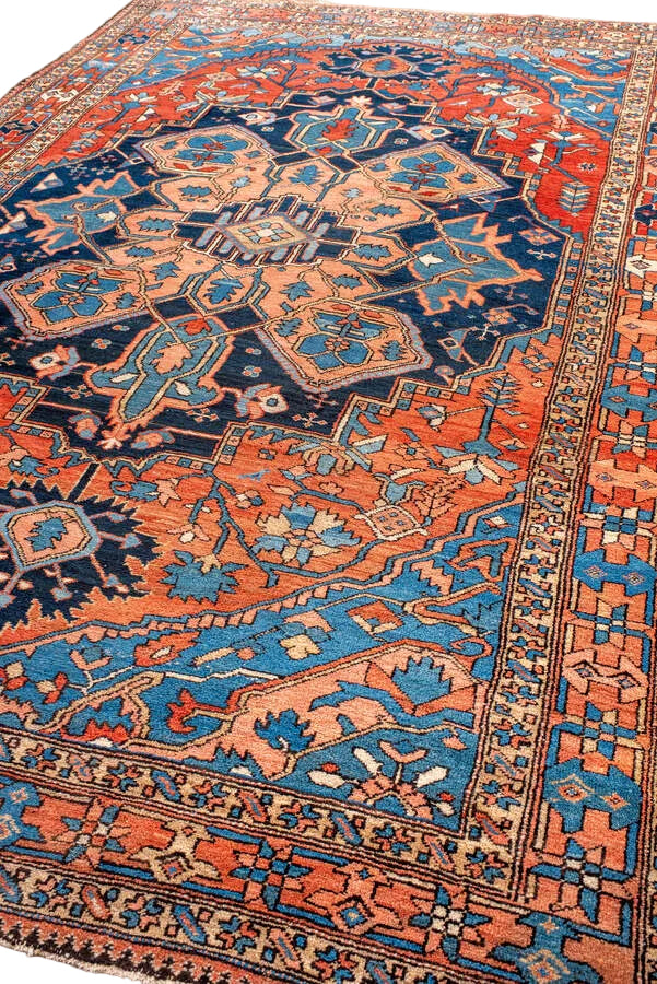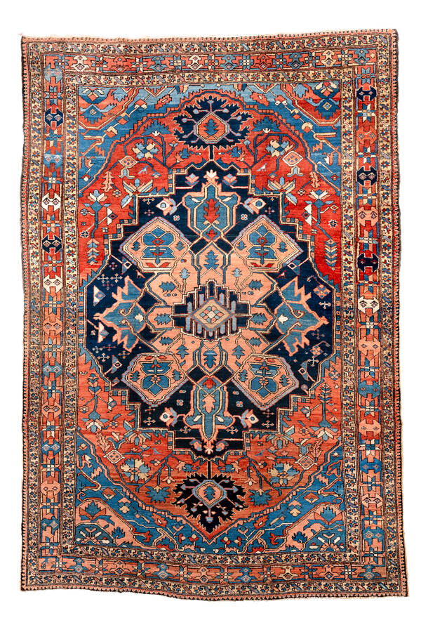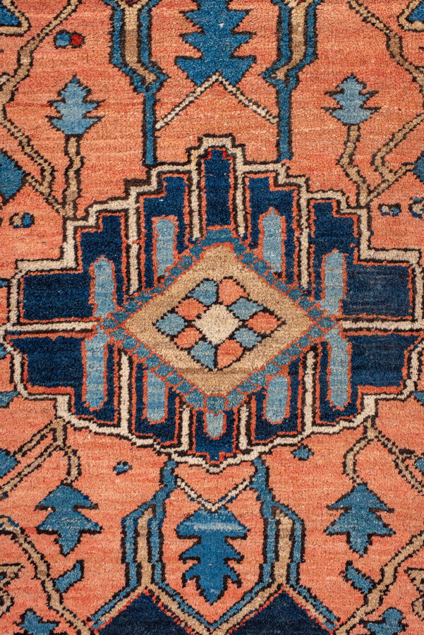 A vibrant and bold Heriz. Large scale medallion of pale rust, deep navy and cornflower blue. Madder red, cornflower blue and ivory throughout.