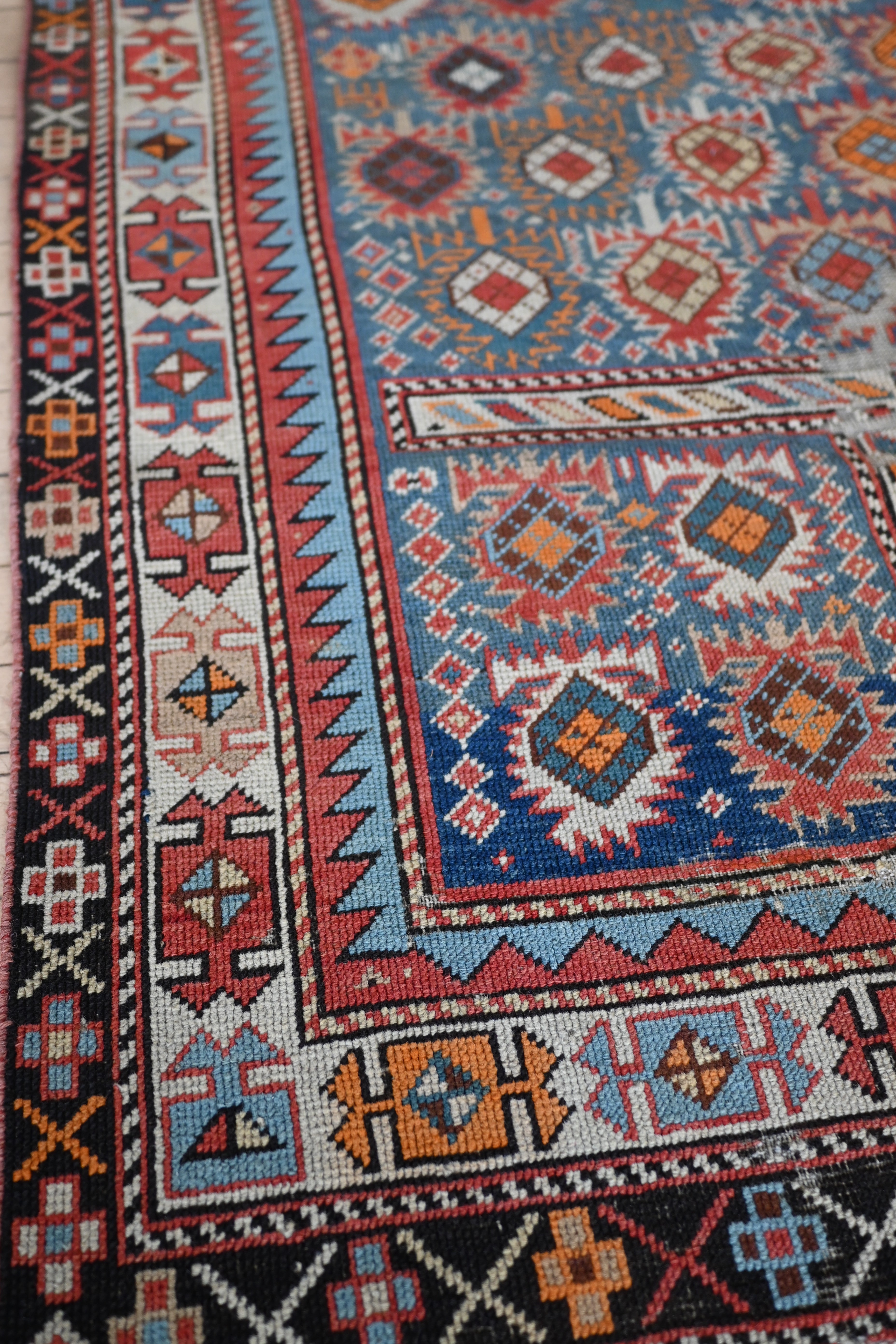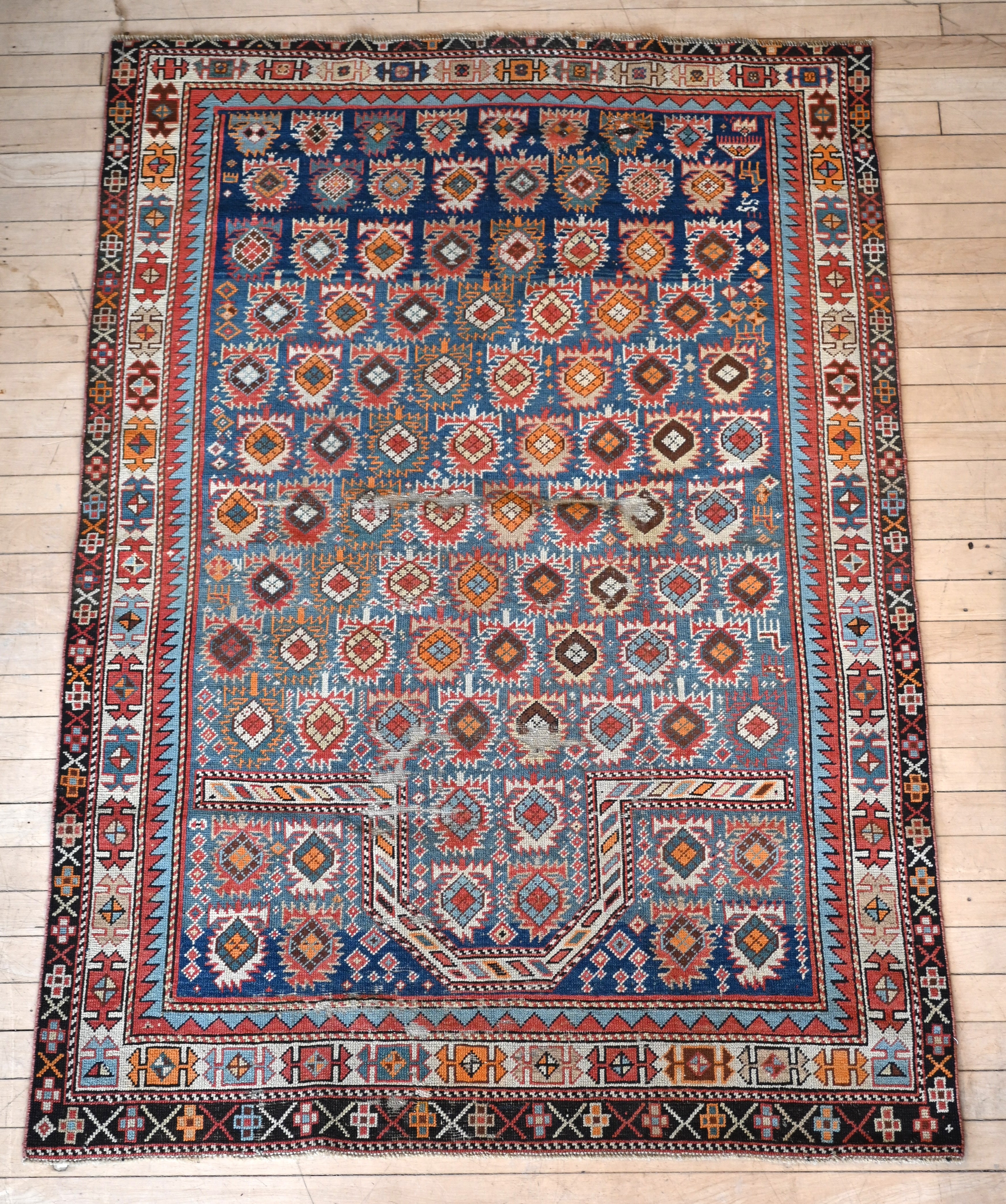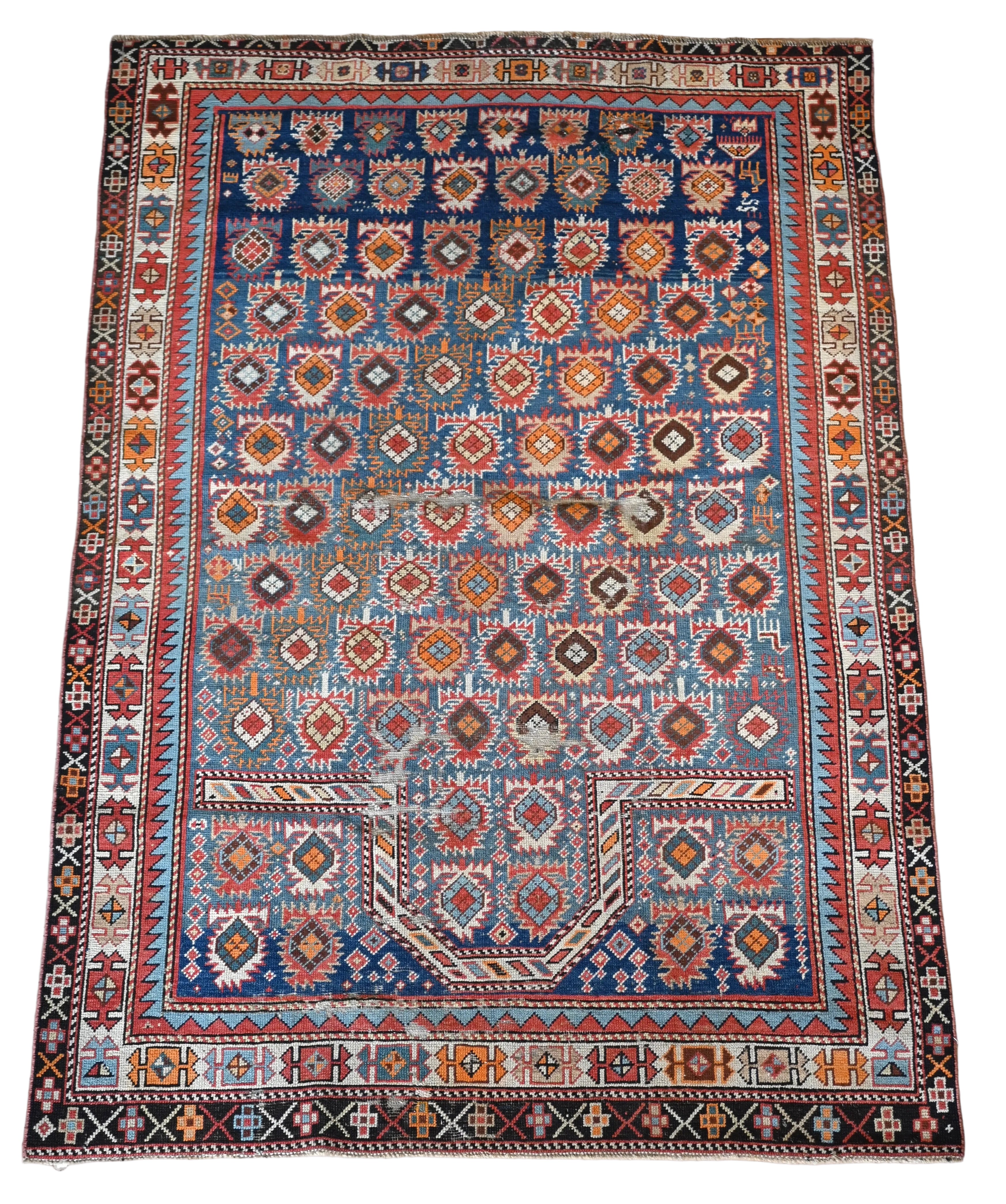 A blue field Shirvan prayer rug with accents of red, orange, ivory, teal and brown