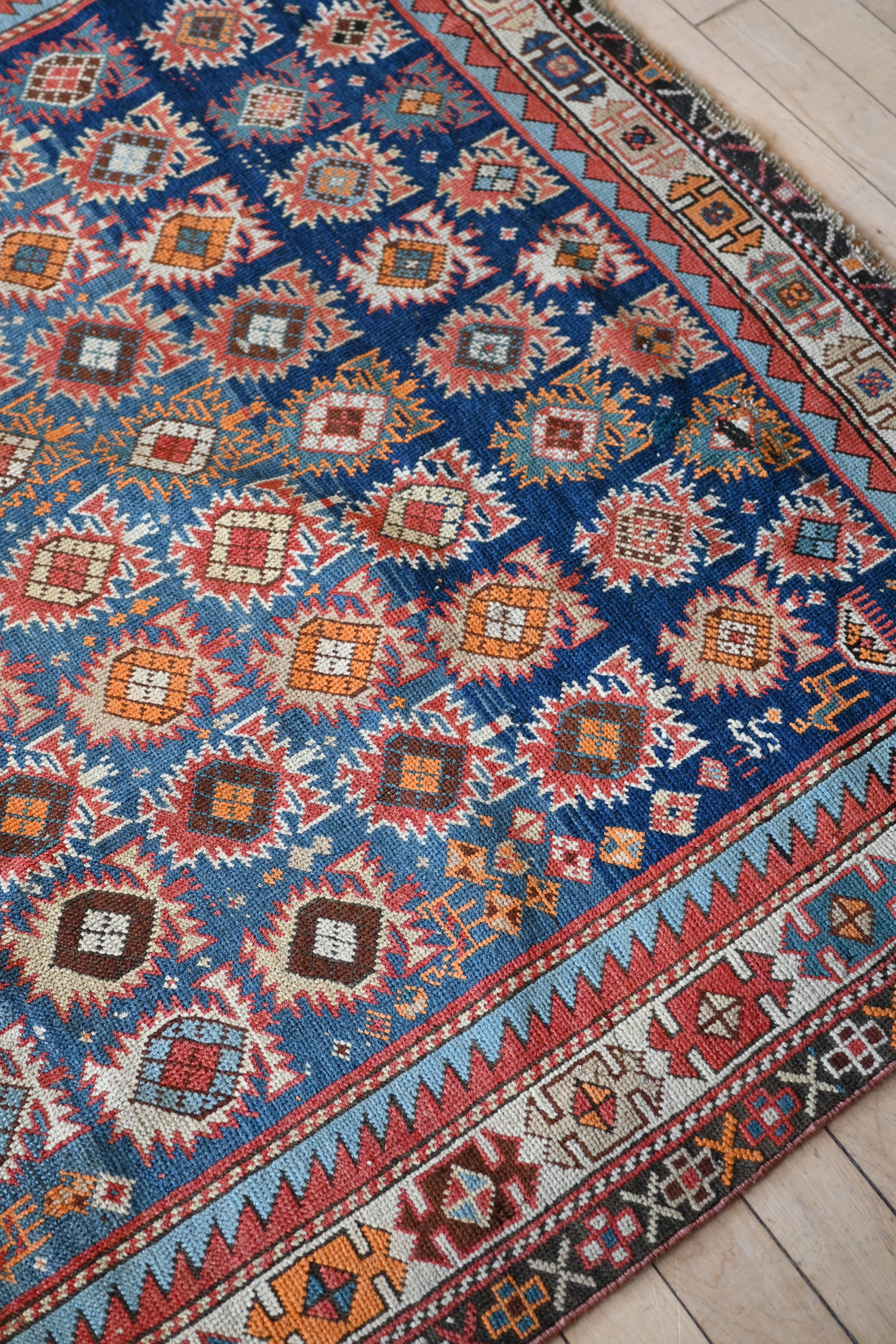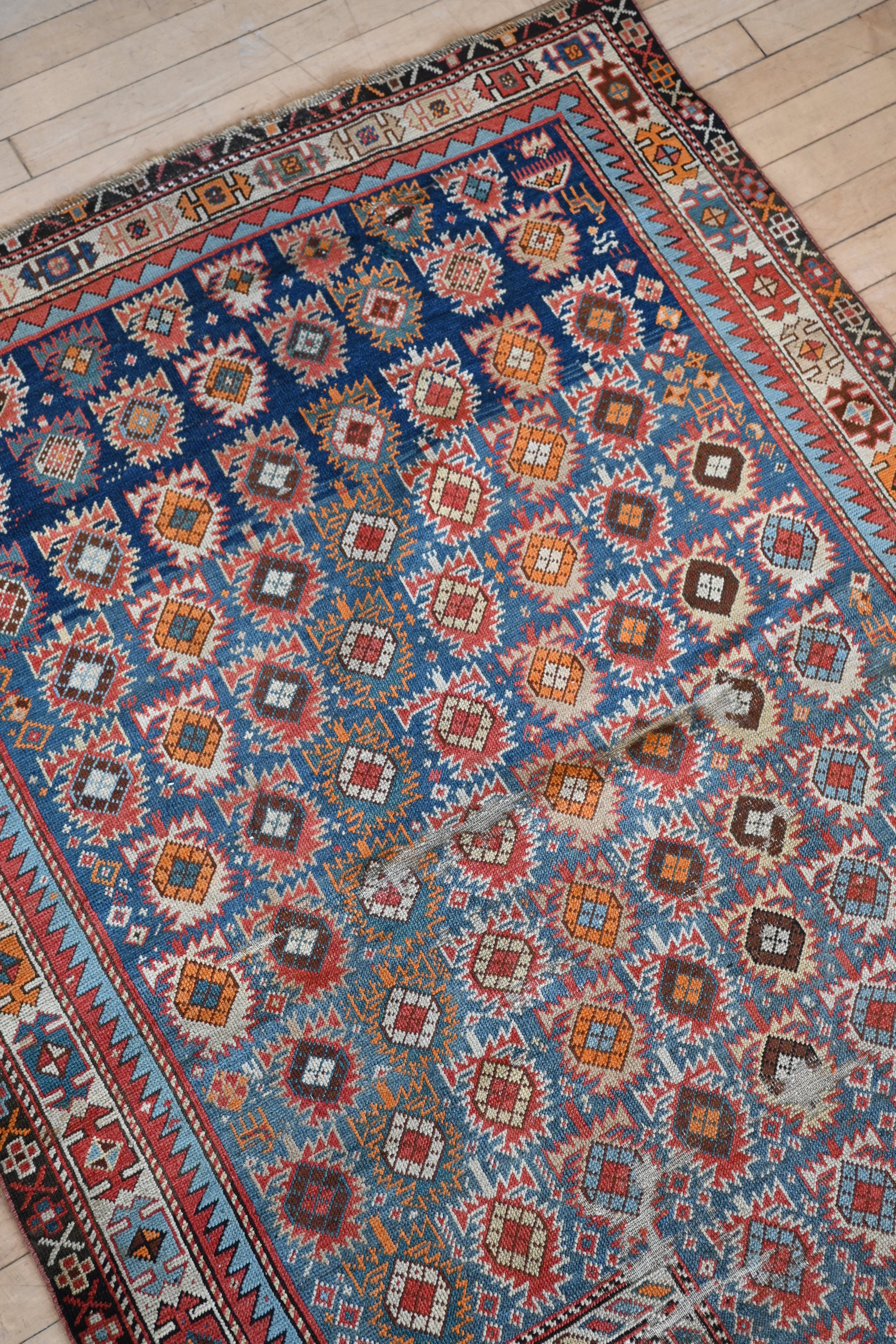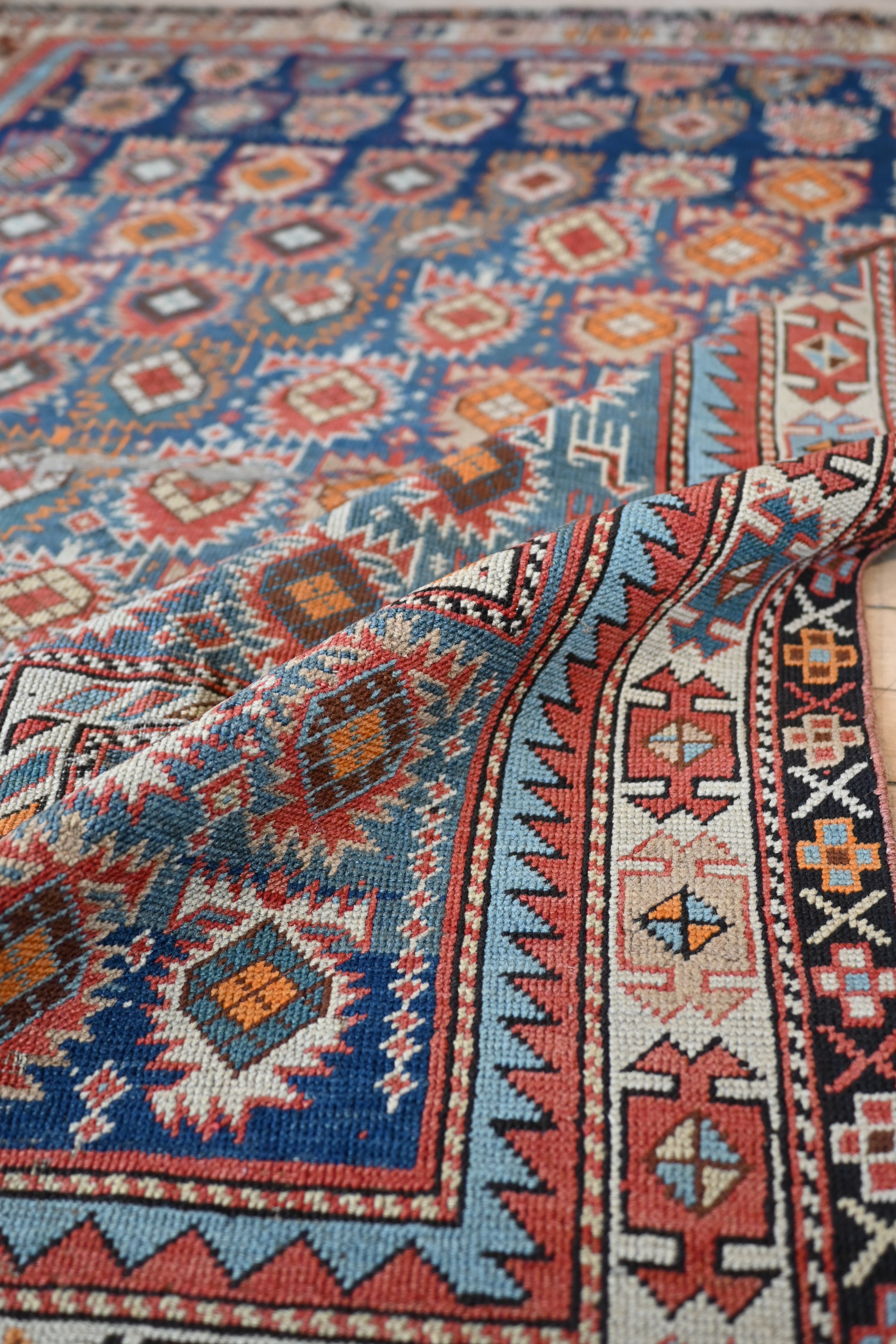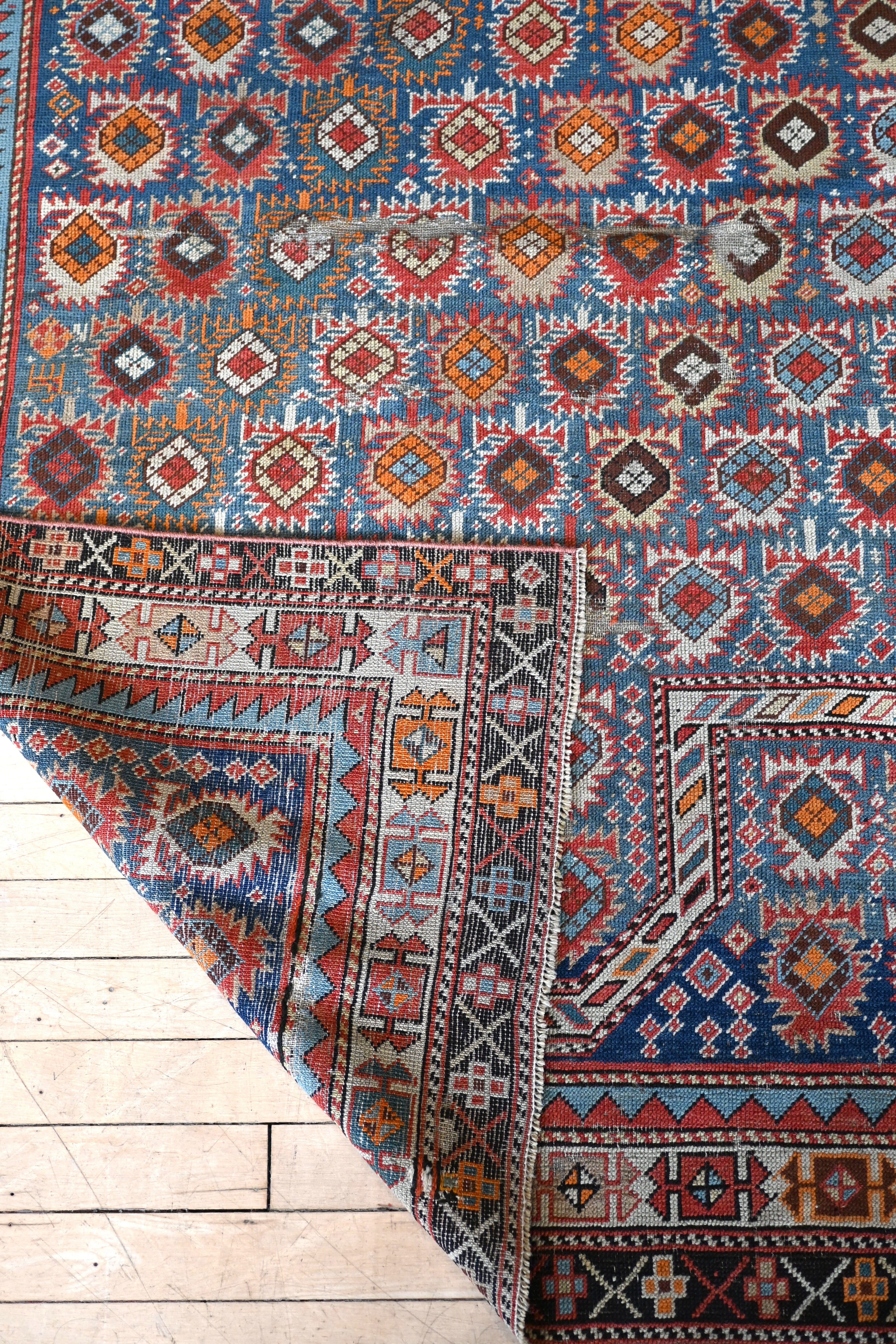 A blue field Shirvan prayer rug with accents of red, orange, ivory, teal and brown