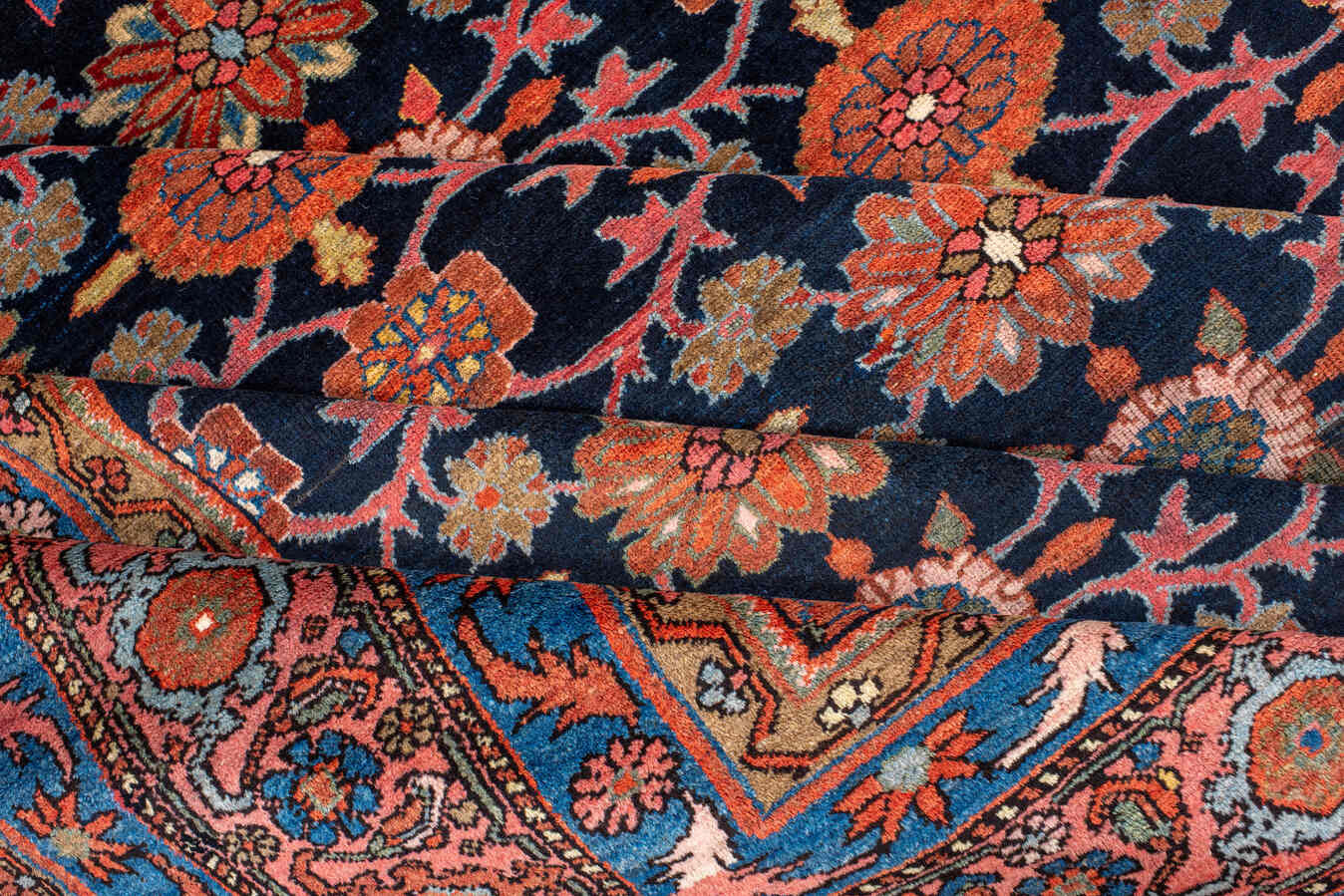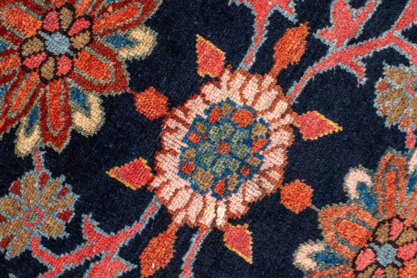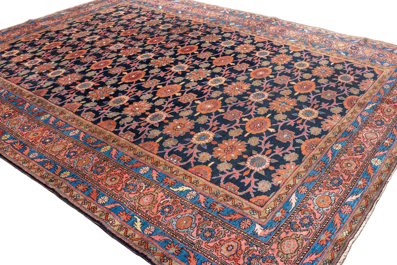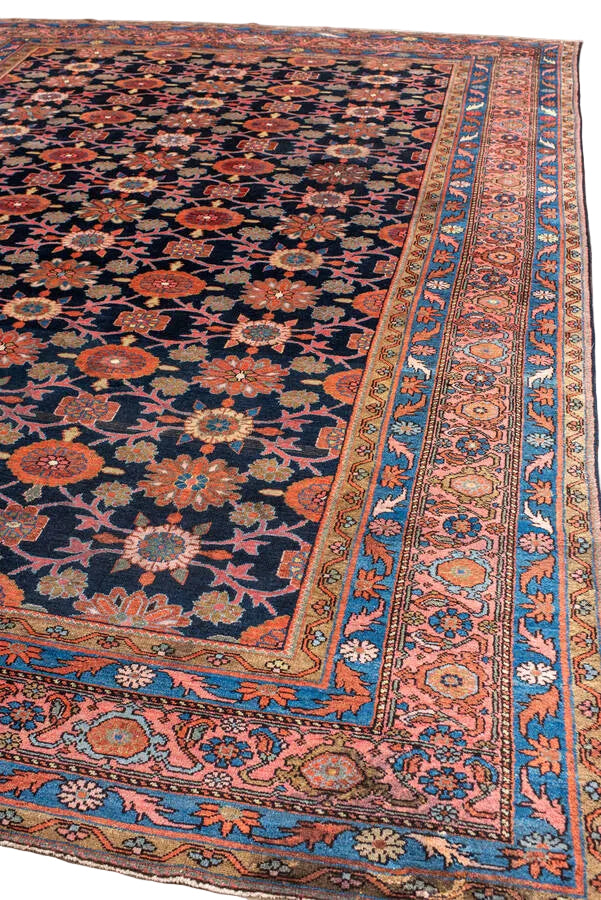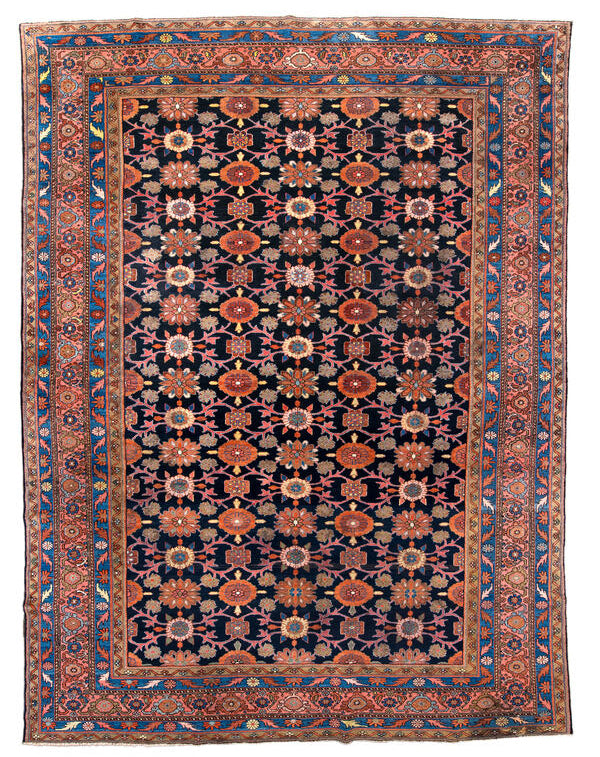 Deep navy field Malayer with a mina khani design in tomato red, camel brown, salmon pink, cornflower blue and ivory.
