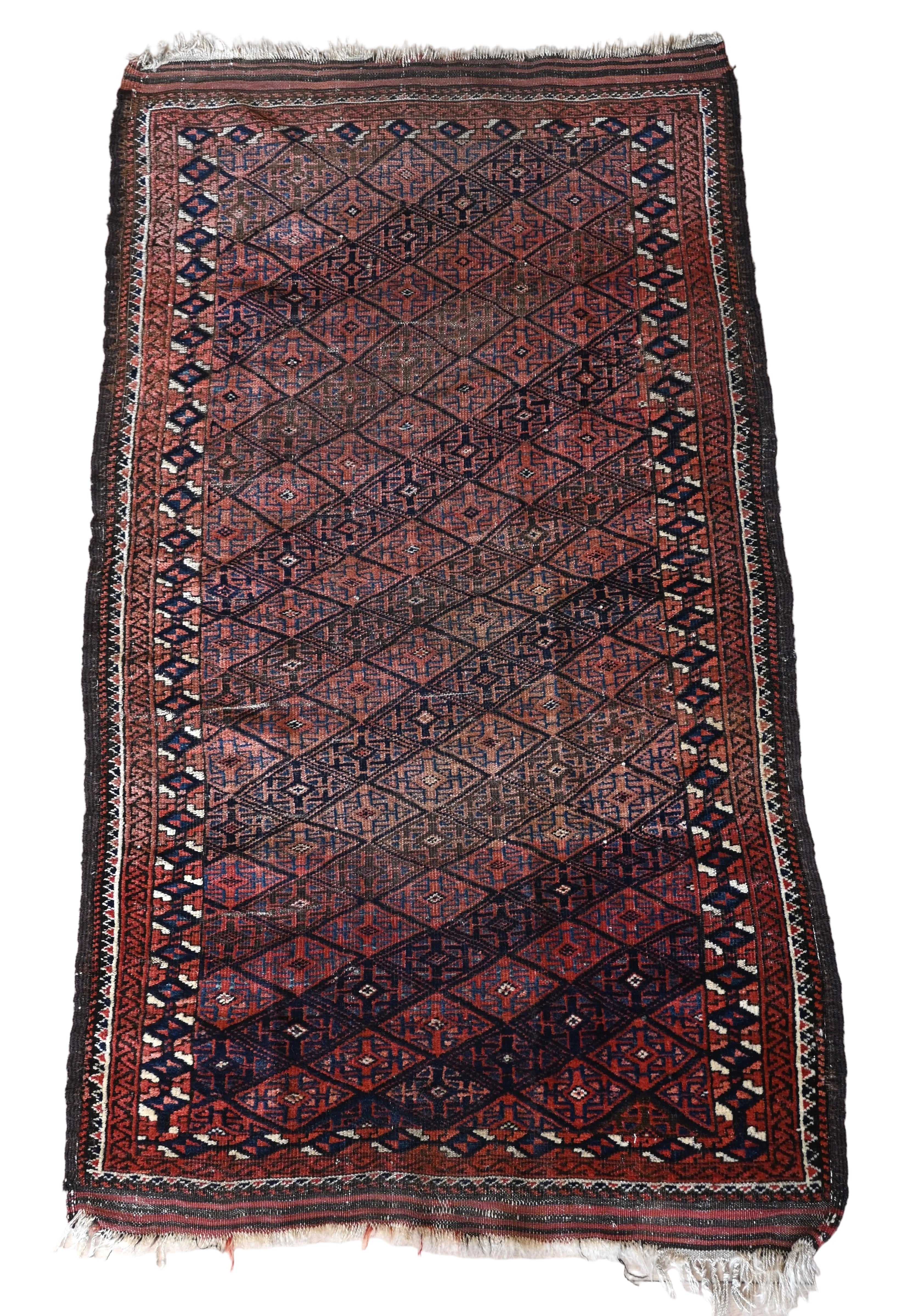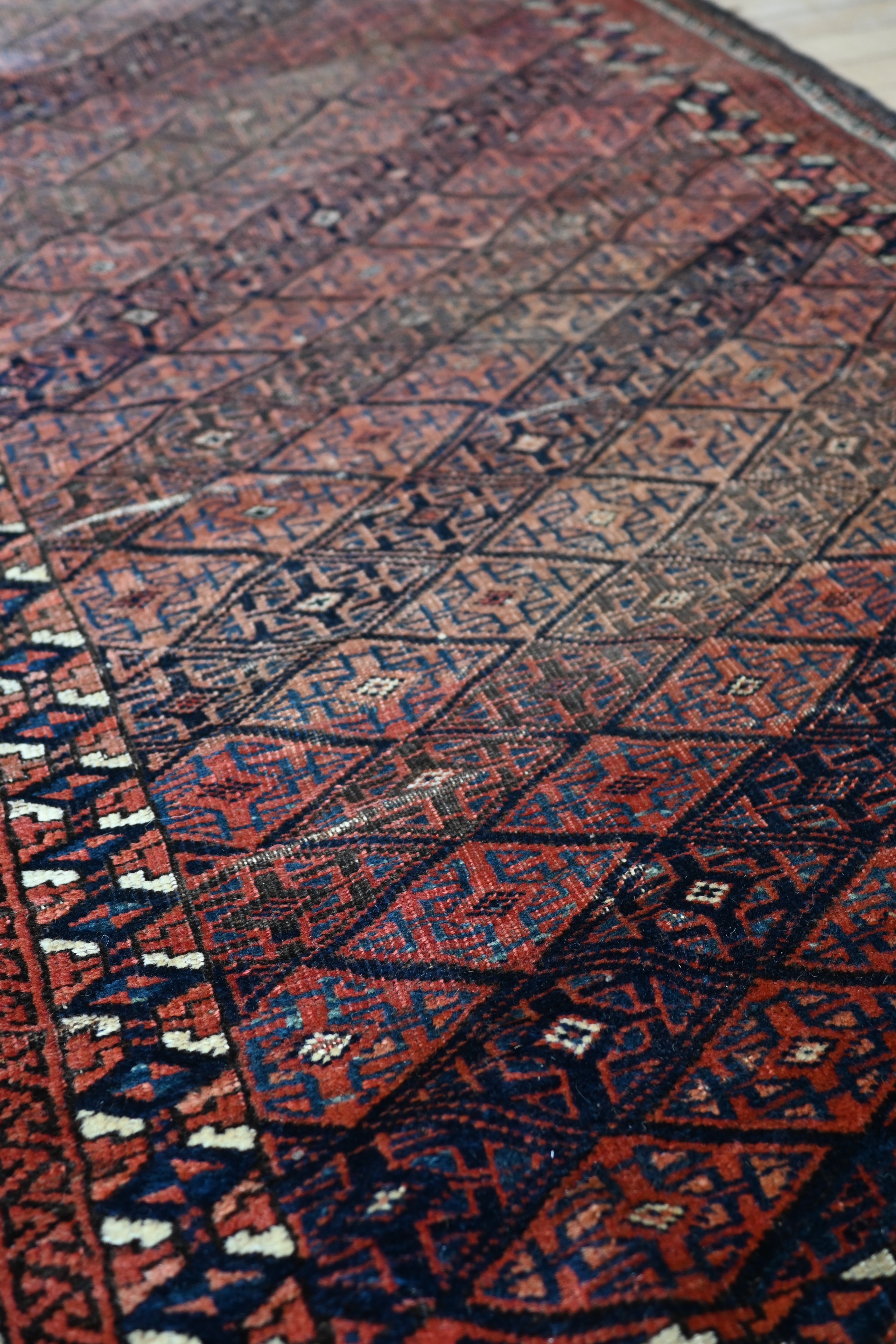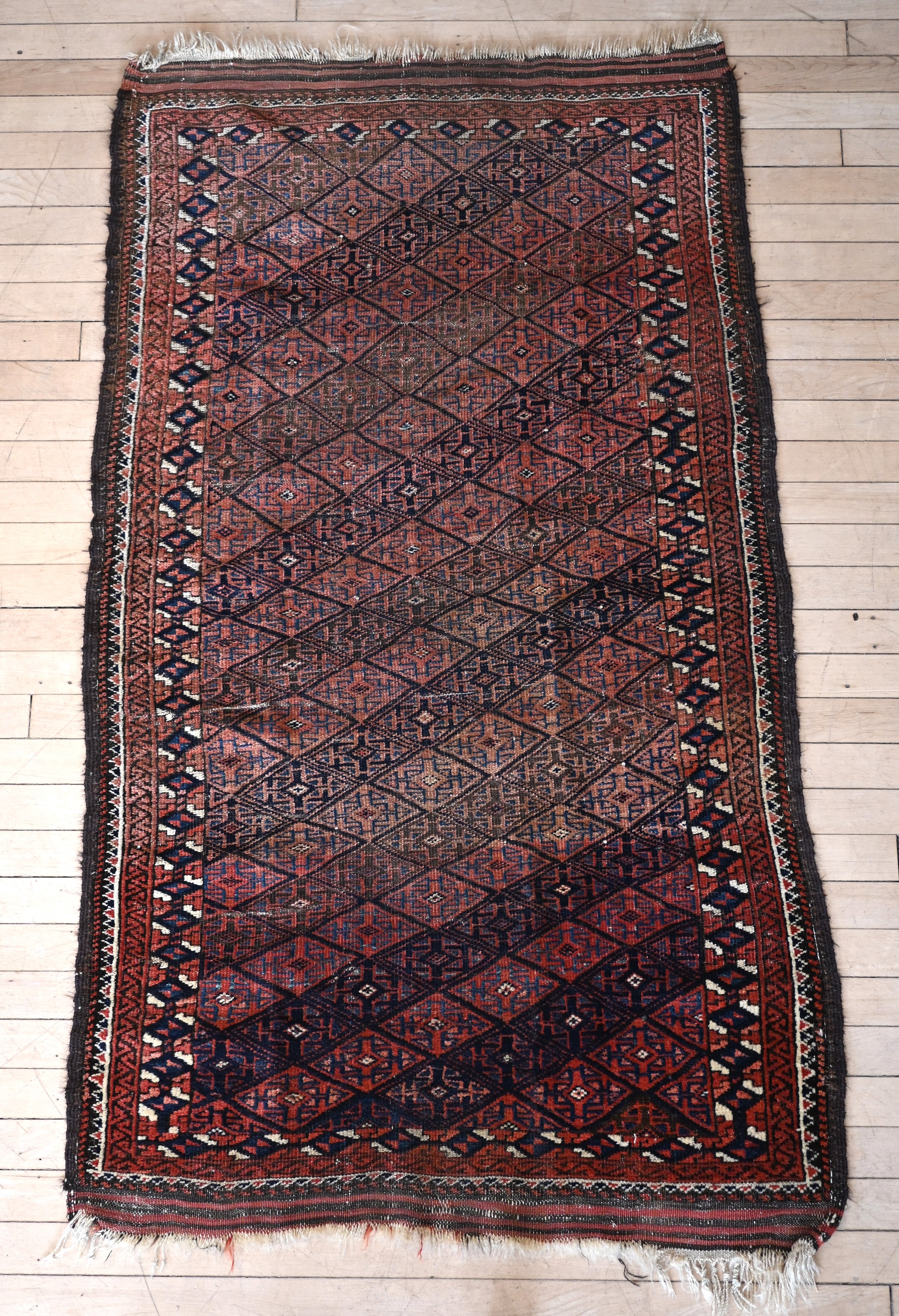 A Baluch tribal rug with deep navy, brown, madder red and ivory.