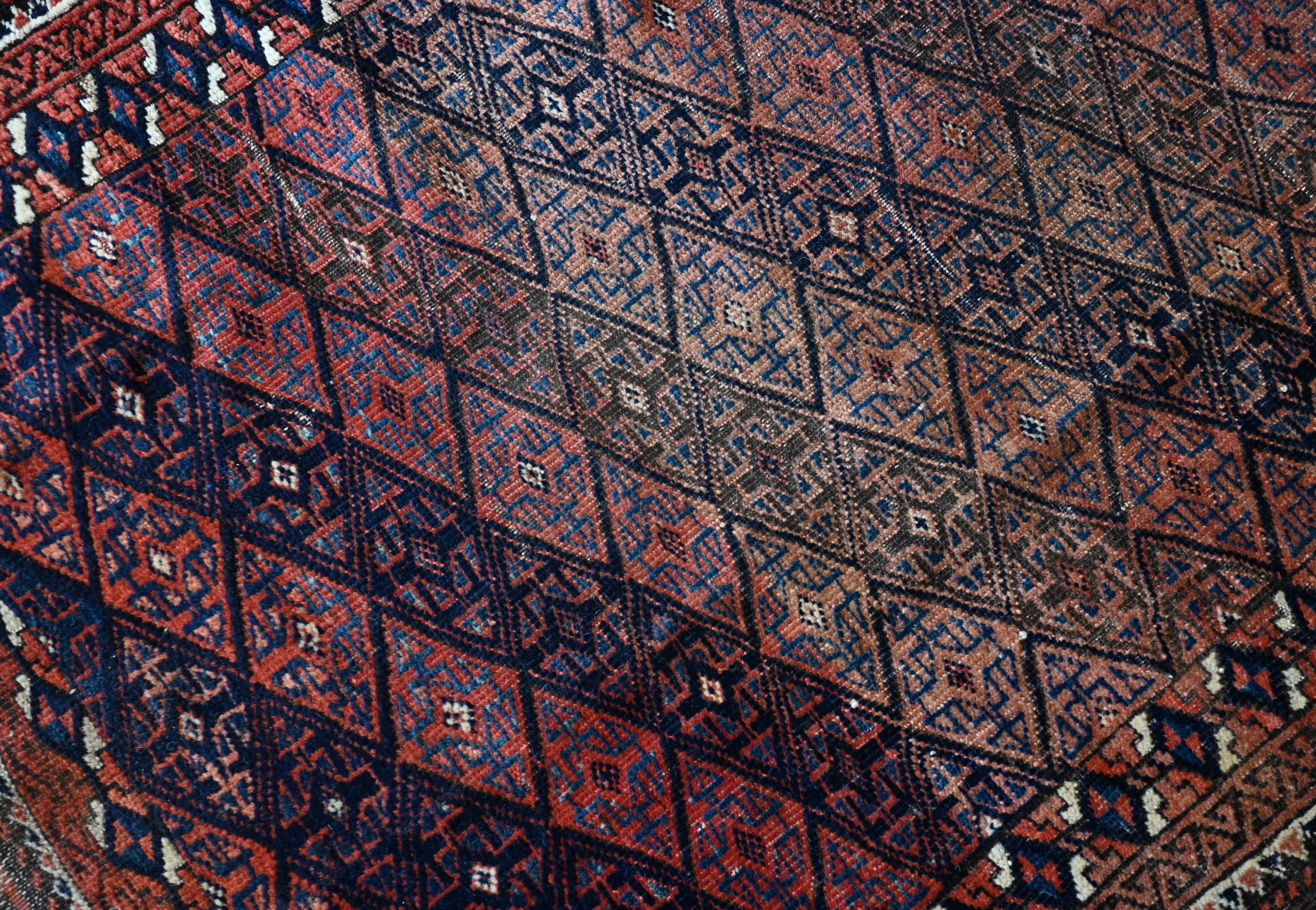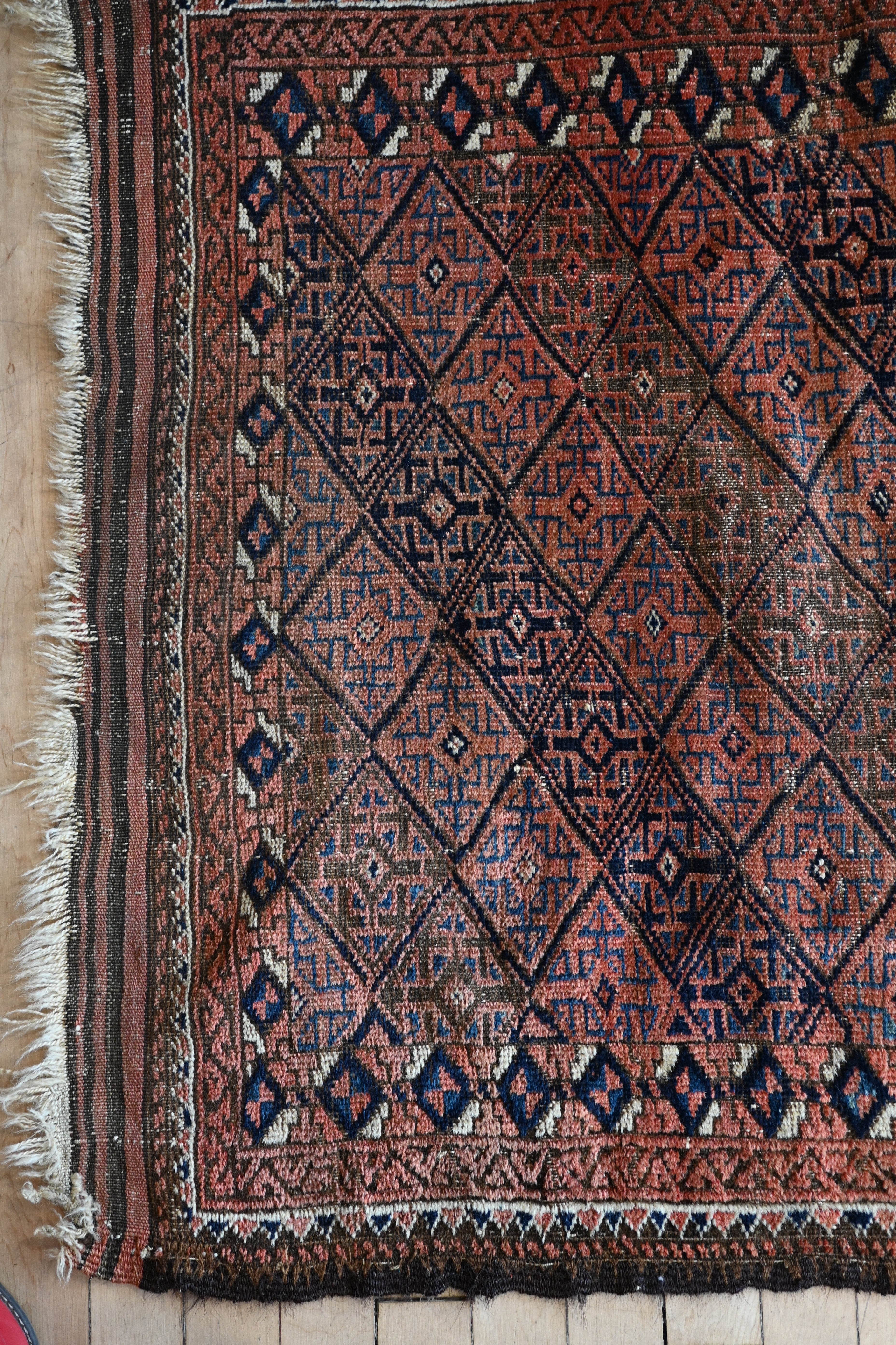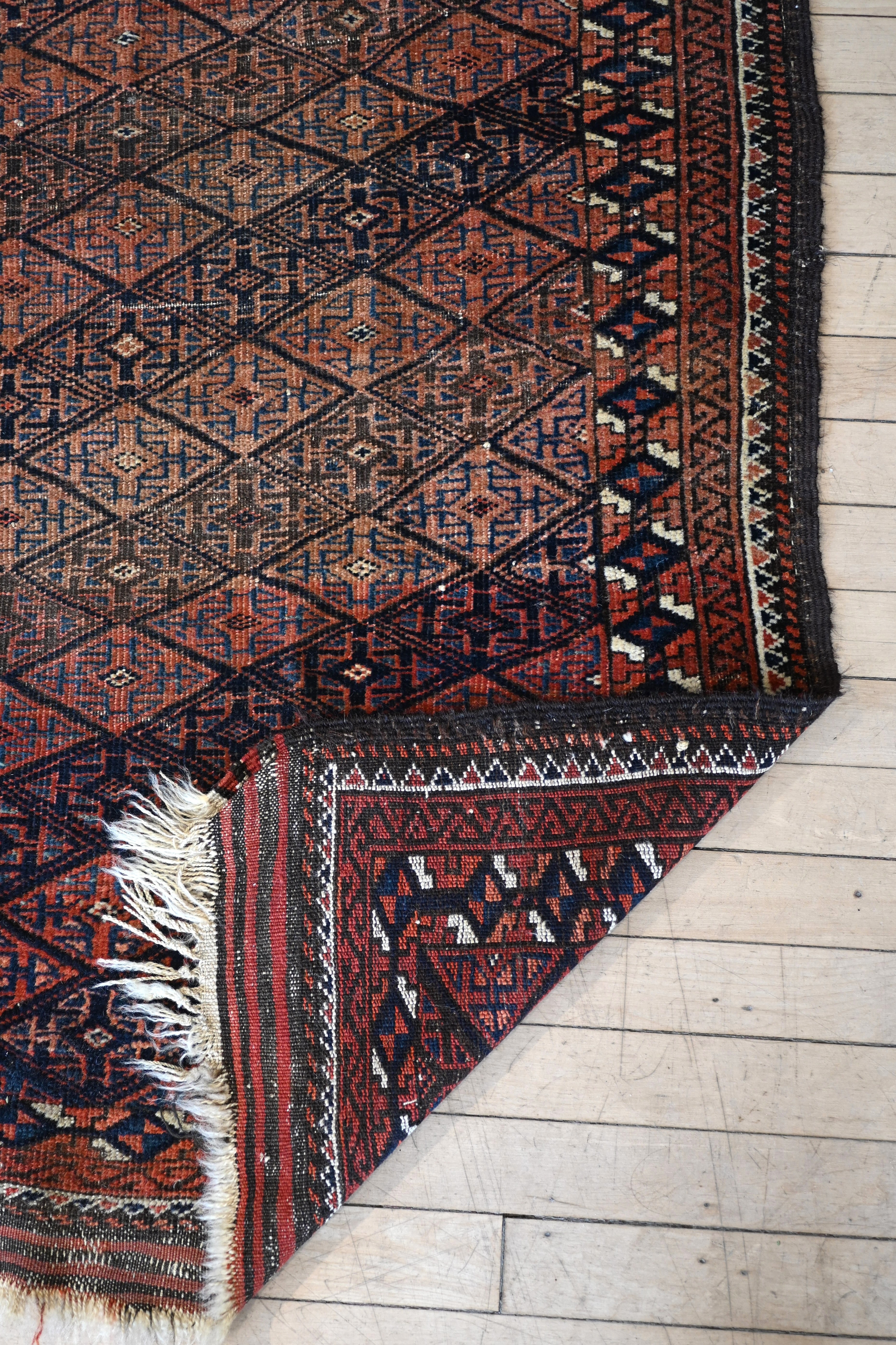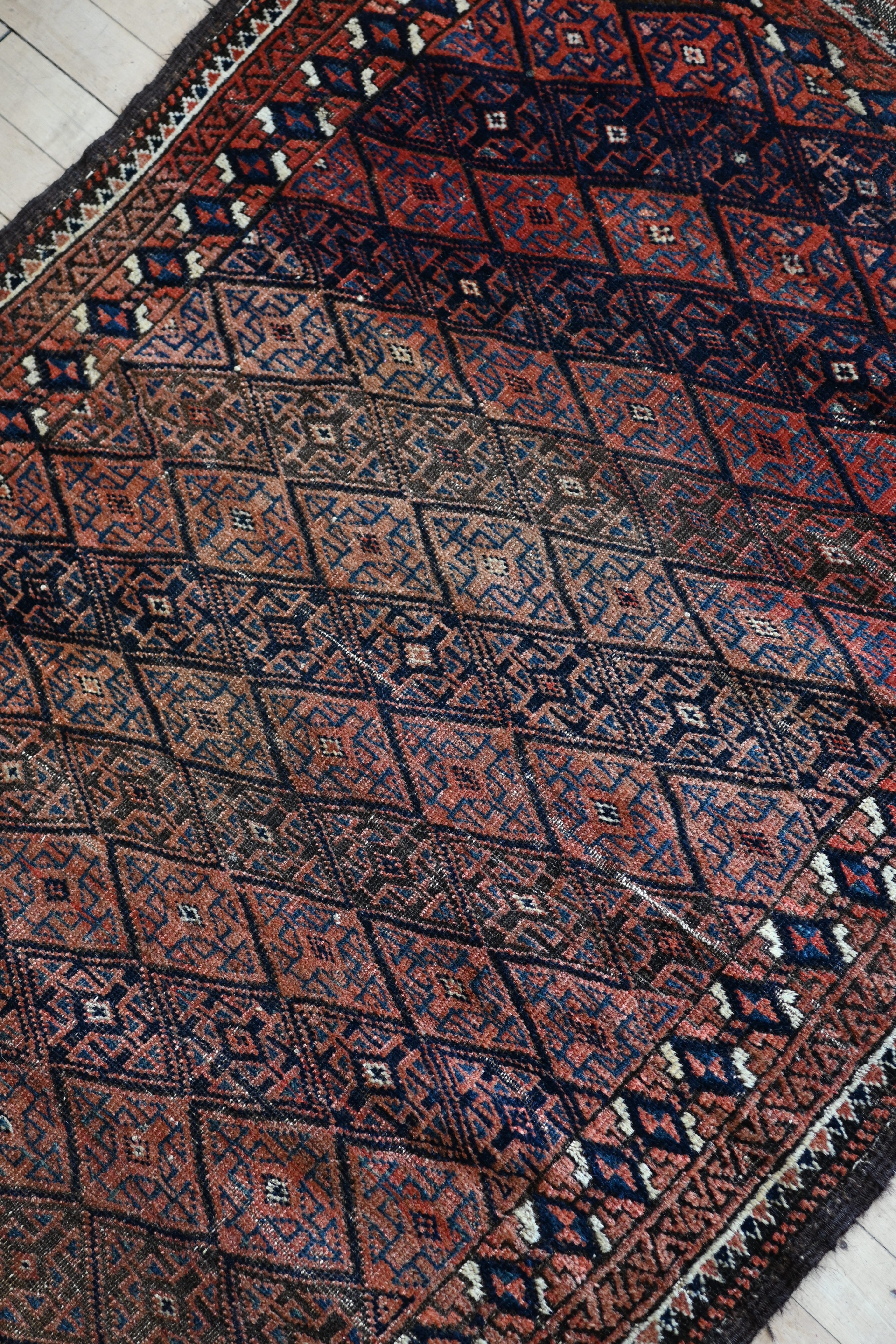 A Baluch tribal rug with deep navy, brown, madder red and ivory.