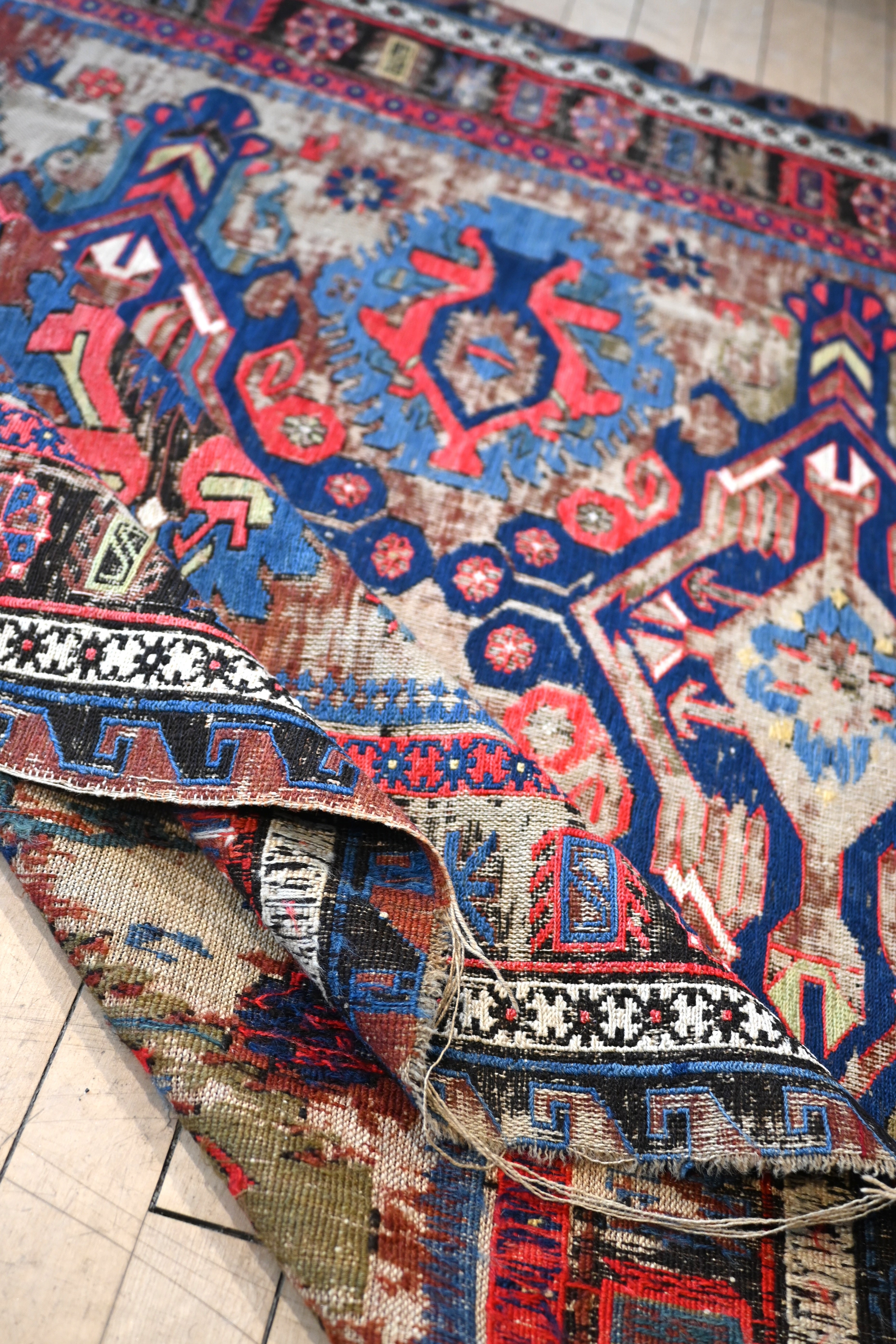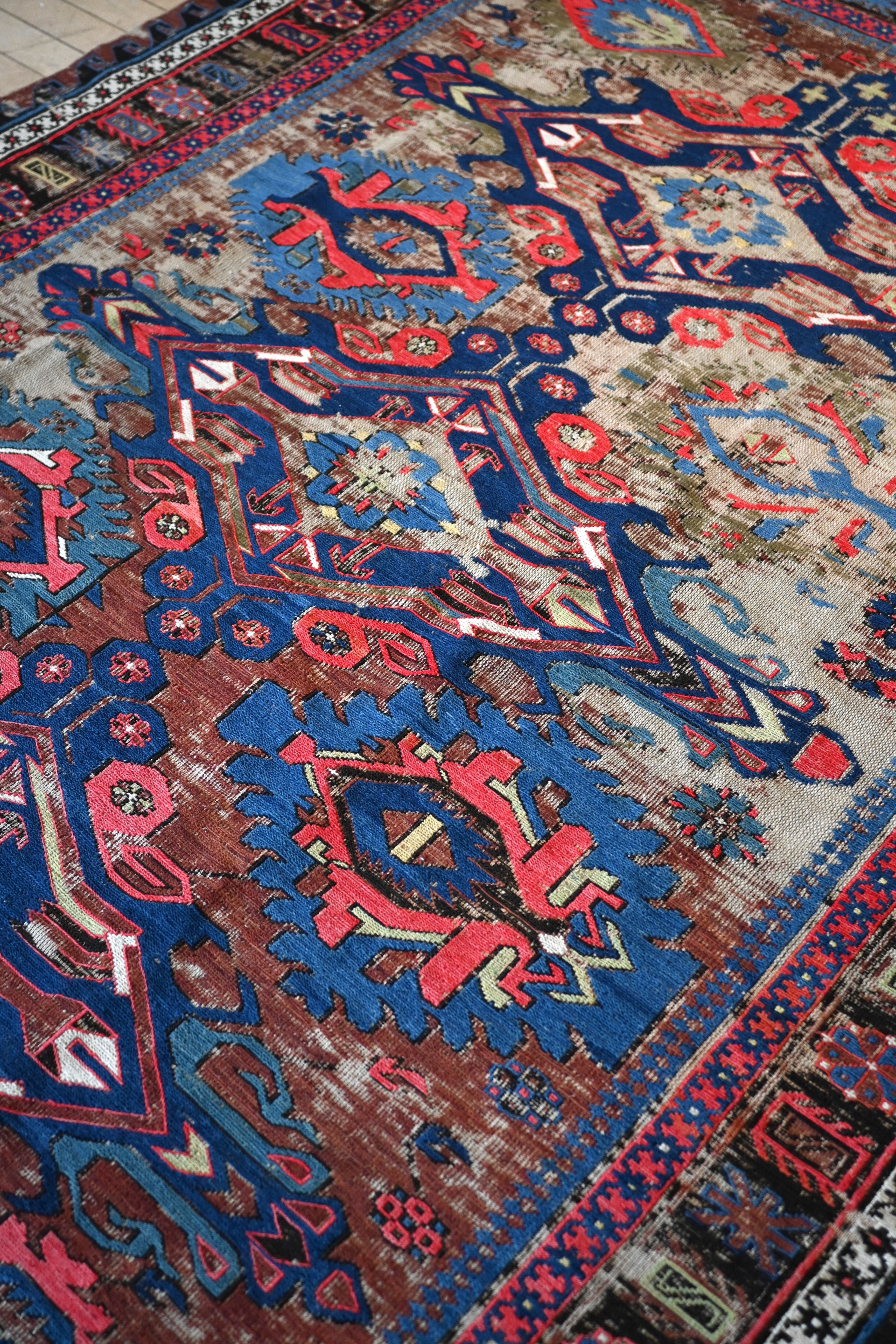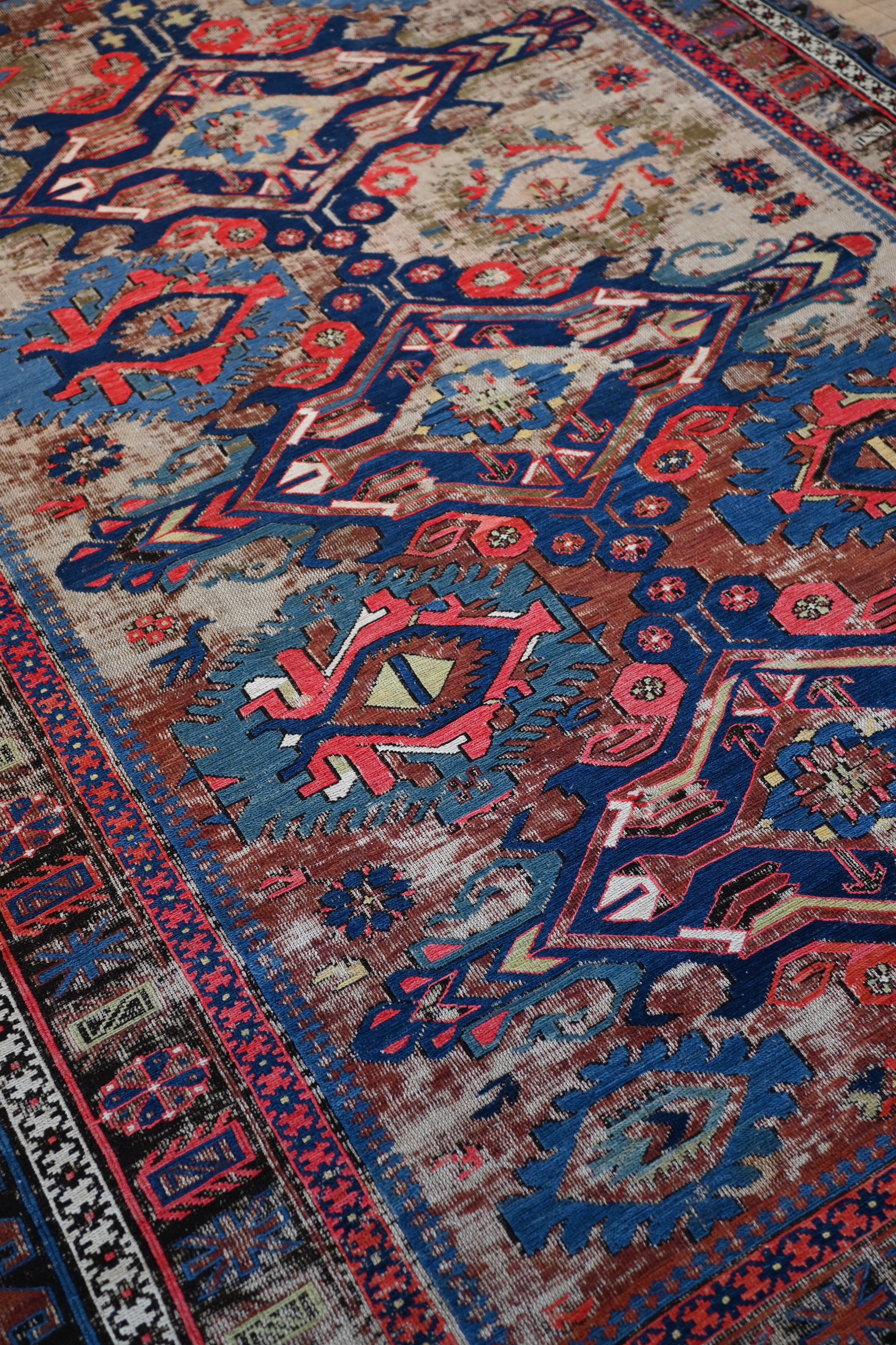 a beautifully distressed Soumac with deep blue, sage green, violet, cherry, sage green and ivory